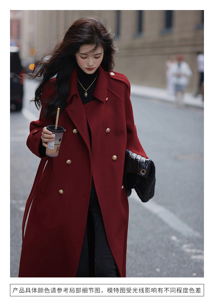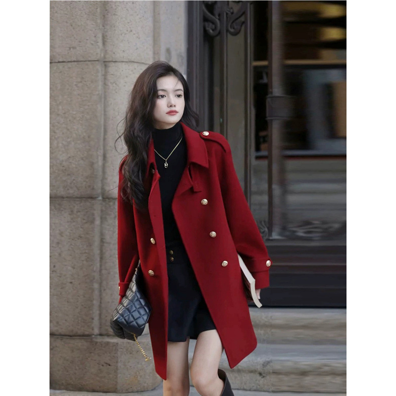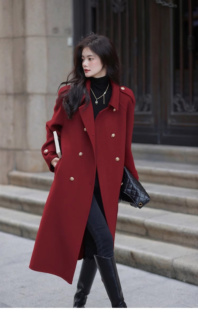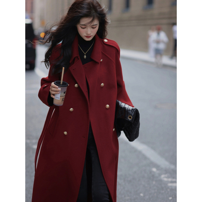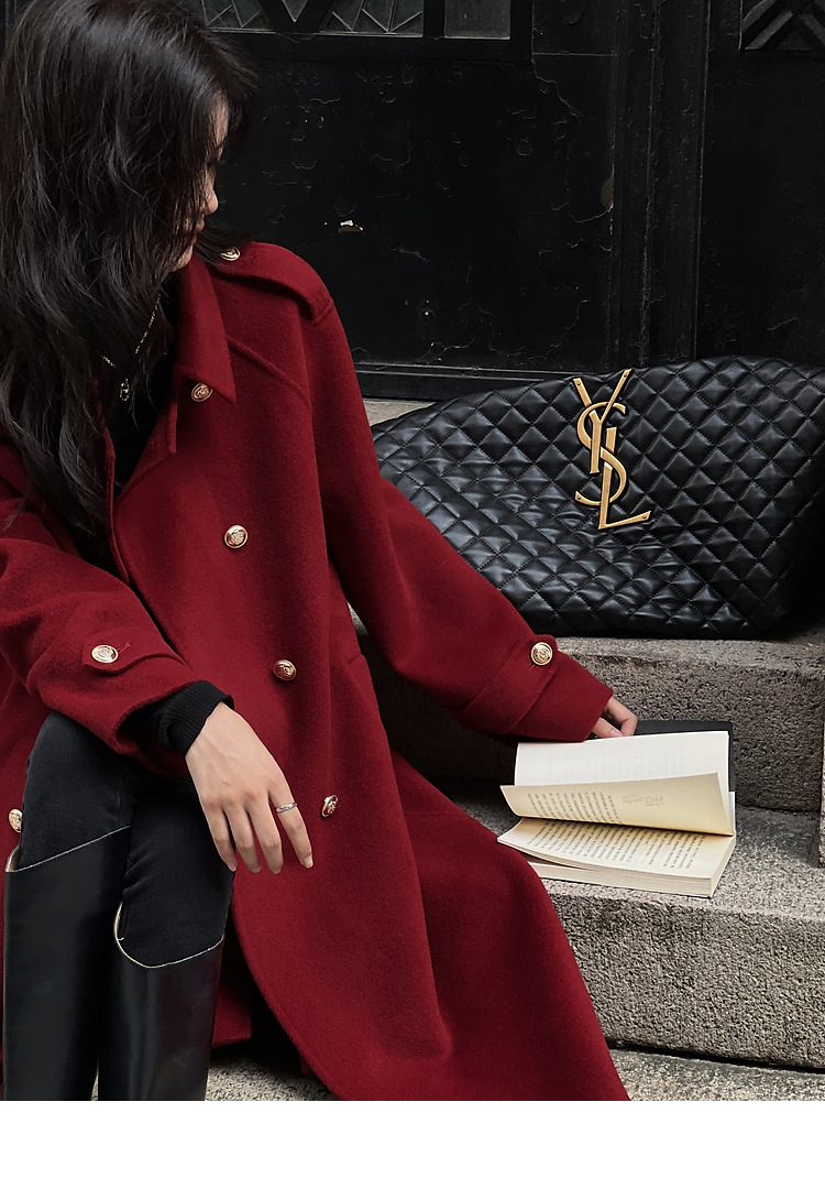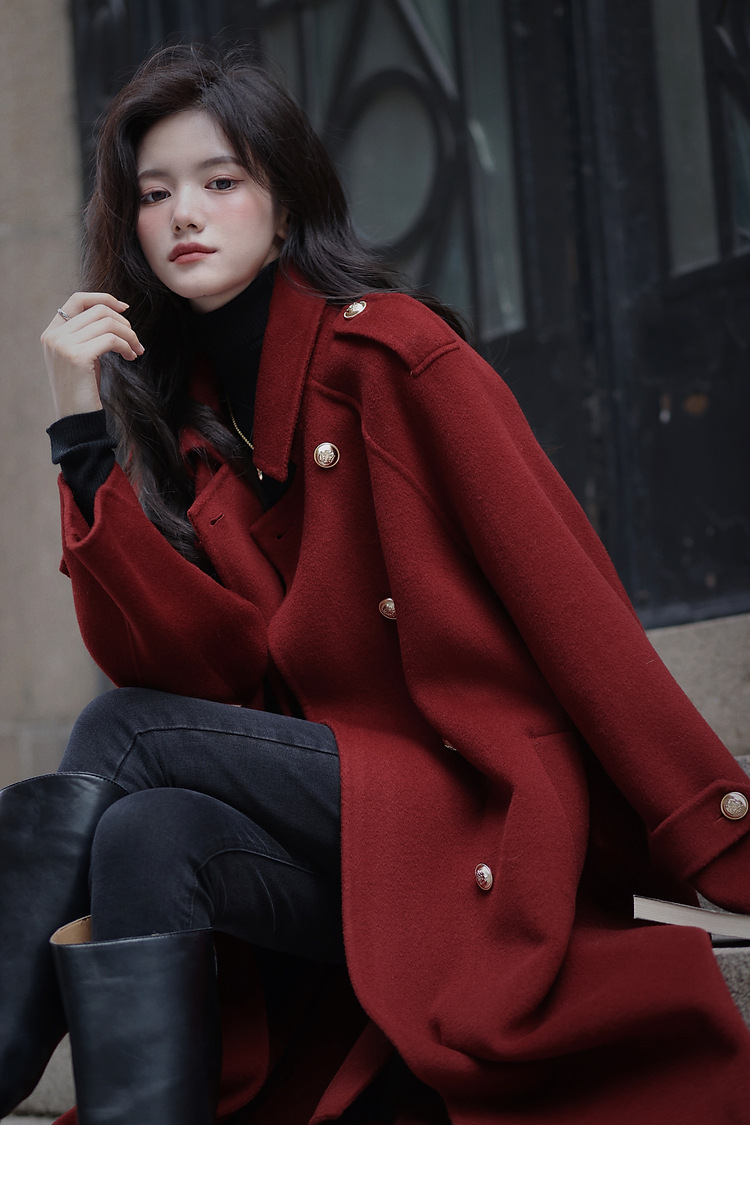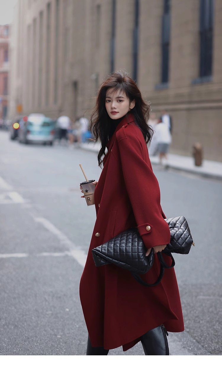 Ting 7617 가을과 겨울 새로운 우아한 새해의 로브 빈티지 모직 코트 레드 롱 골드 버튼 모직 코트 여성스토어 가기