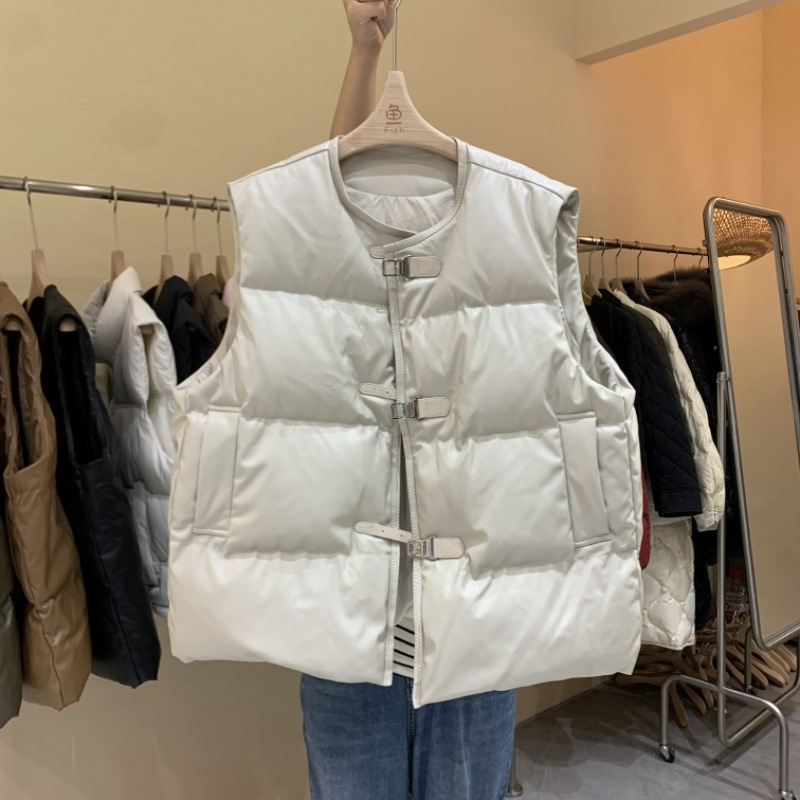 Maillard PU 가죽 조끼 재킷 여성의 겨울 두꺼운 코튼 느슨한 Bf 스타일 레트로 라운드 넥 조끼