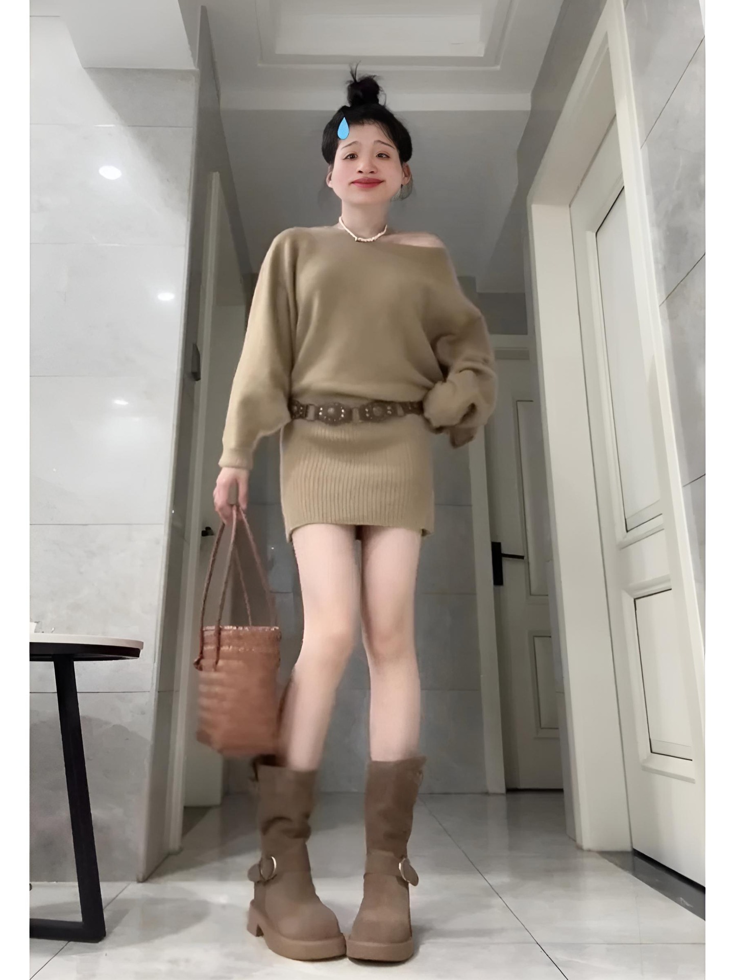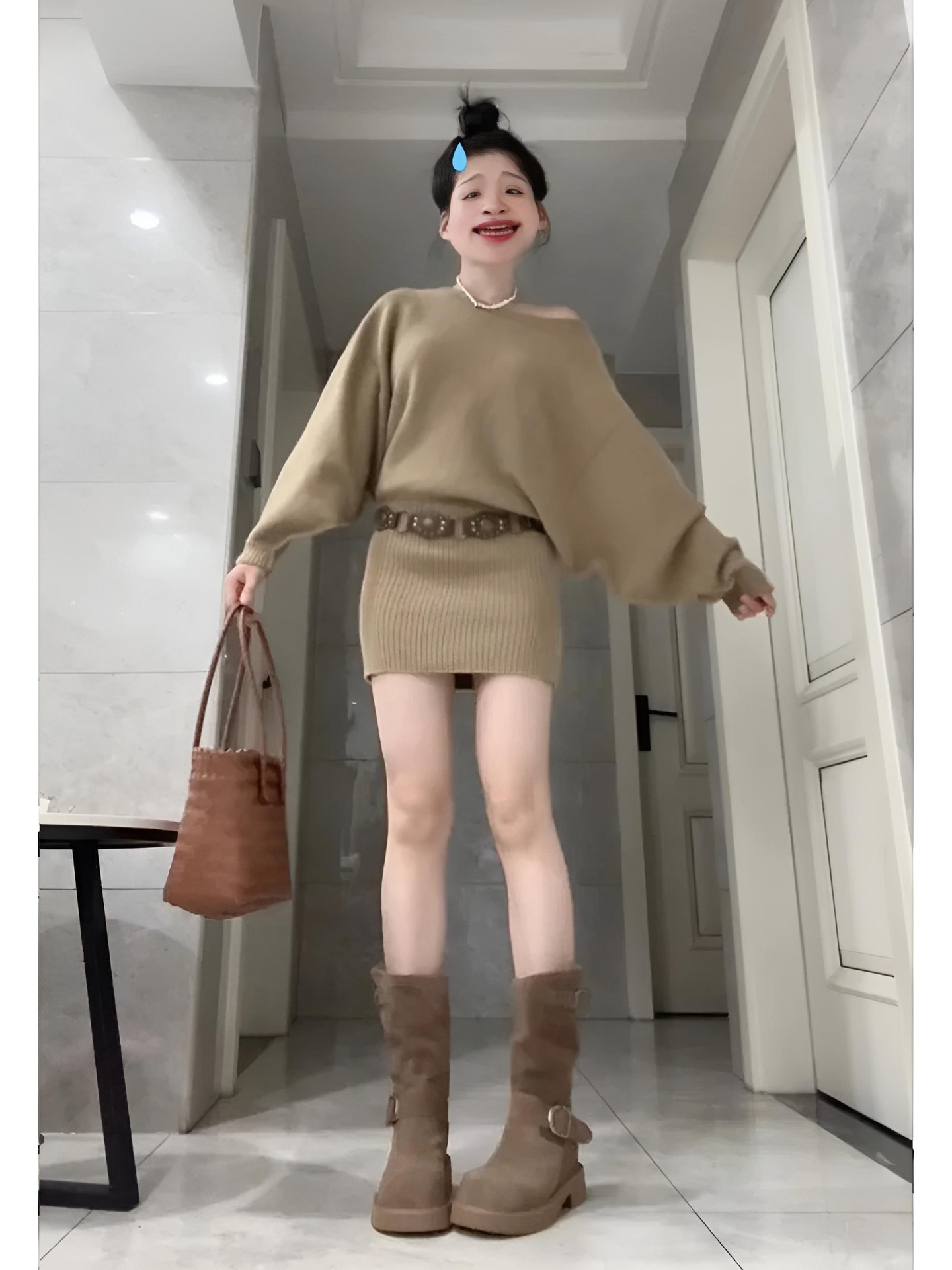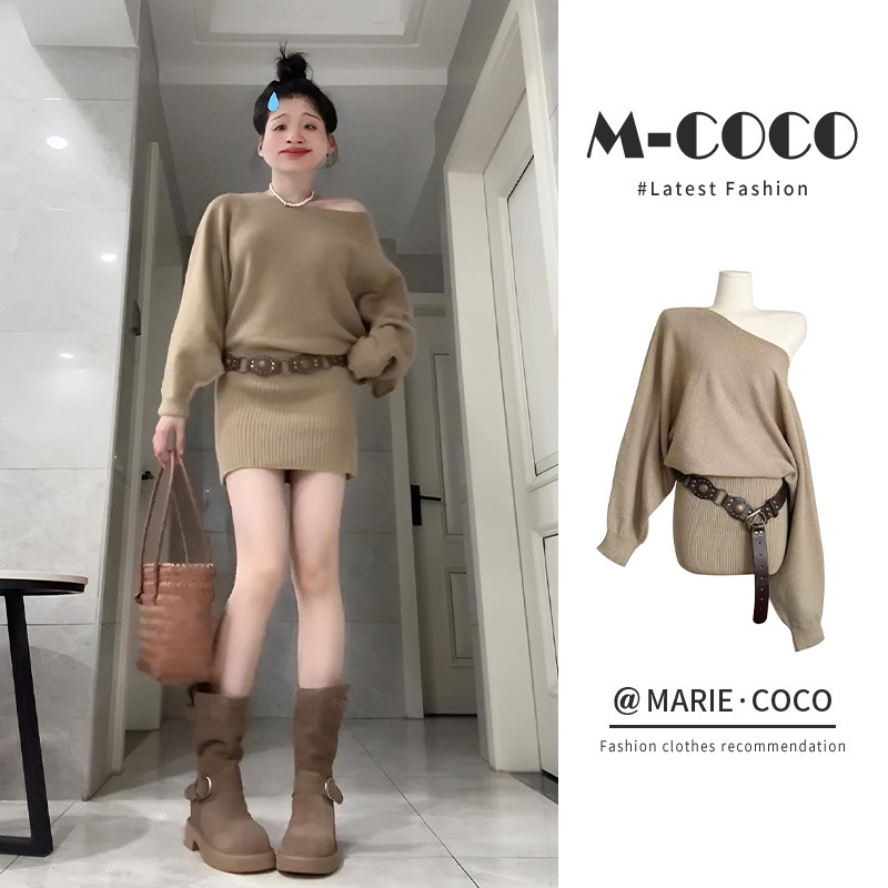 게으른 스타일 느슨한 오프 숄더 니트 스웨터 이른 가을 여성 디자인 센스 슬림 숄더 슬림 원피스