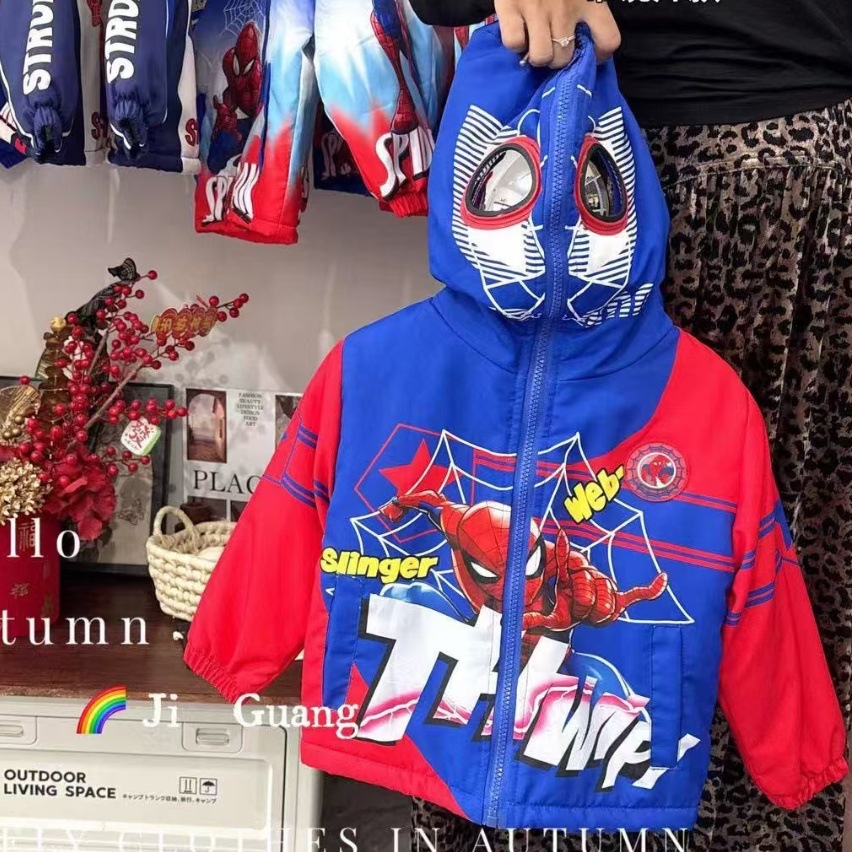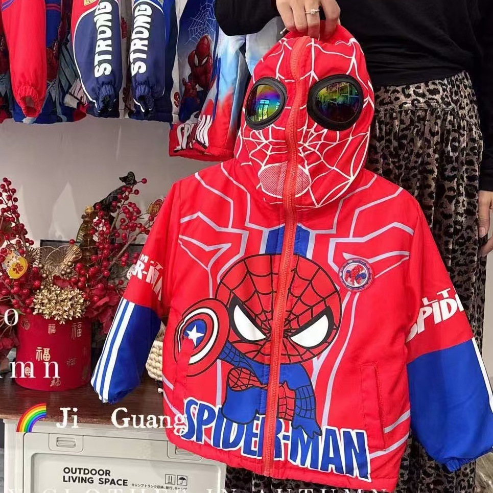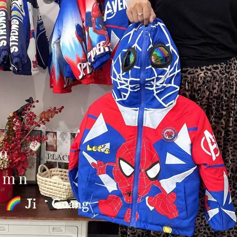 眼镜款冲锋衣、100-140带亮灯、带眼镜、200克棉➕超柔内里、品质超级好、都是小朋友喜欢的奥特曼、蜘蛛侠、等好卖的、小孩子看到就喜欢
