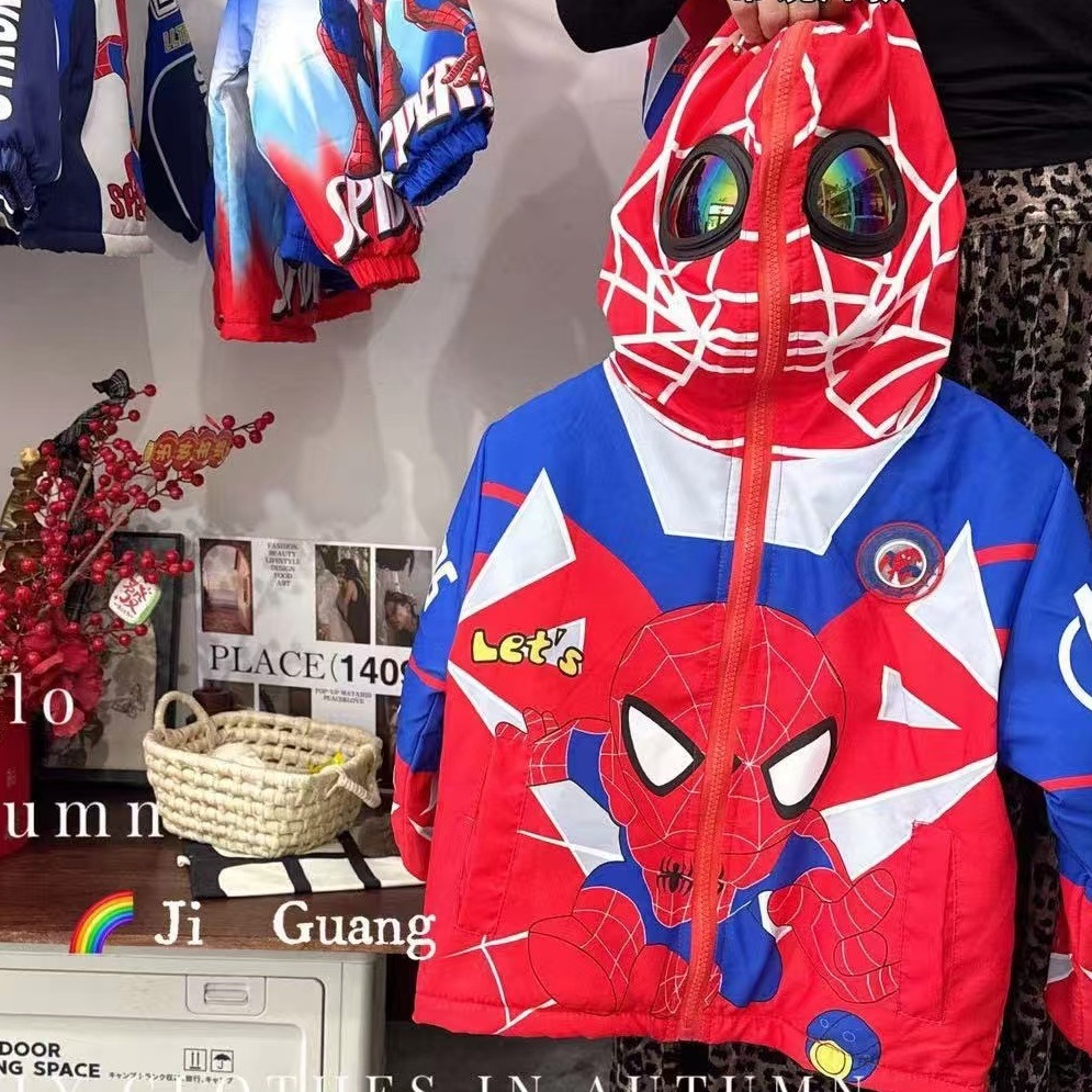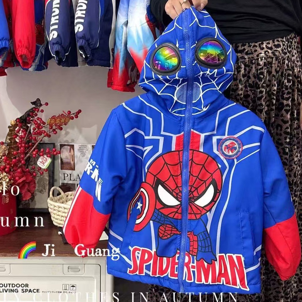 남아용 스파이더맨 재킷, 가을/겨울용, 플리스 안감으로 따뜻함 유지, 2025년 신상, 멋진 만화 캐릭터, 안경 착용, 후드 포함스토어 가기