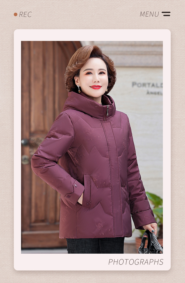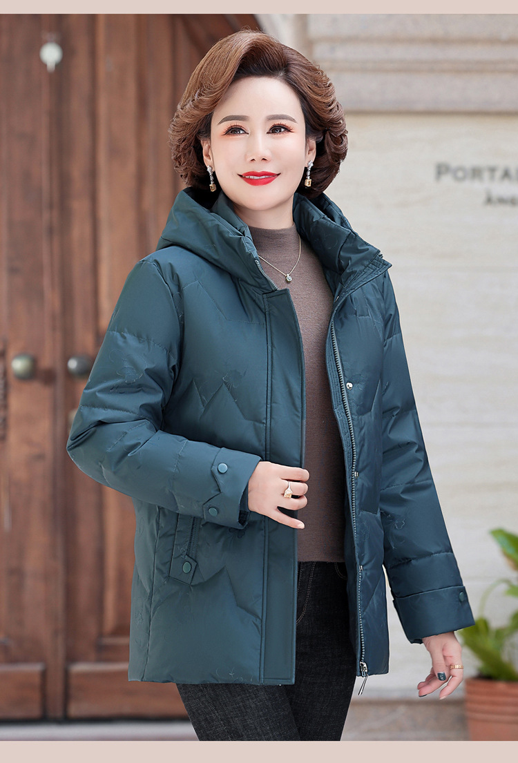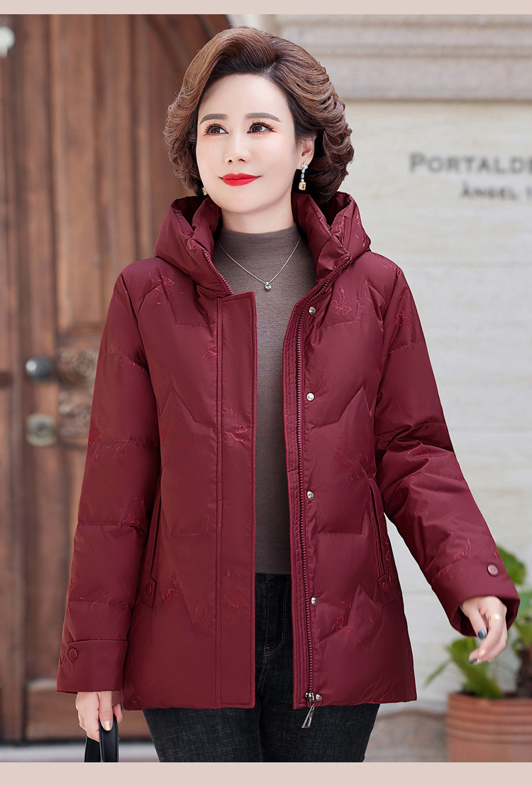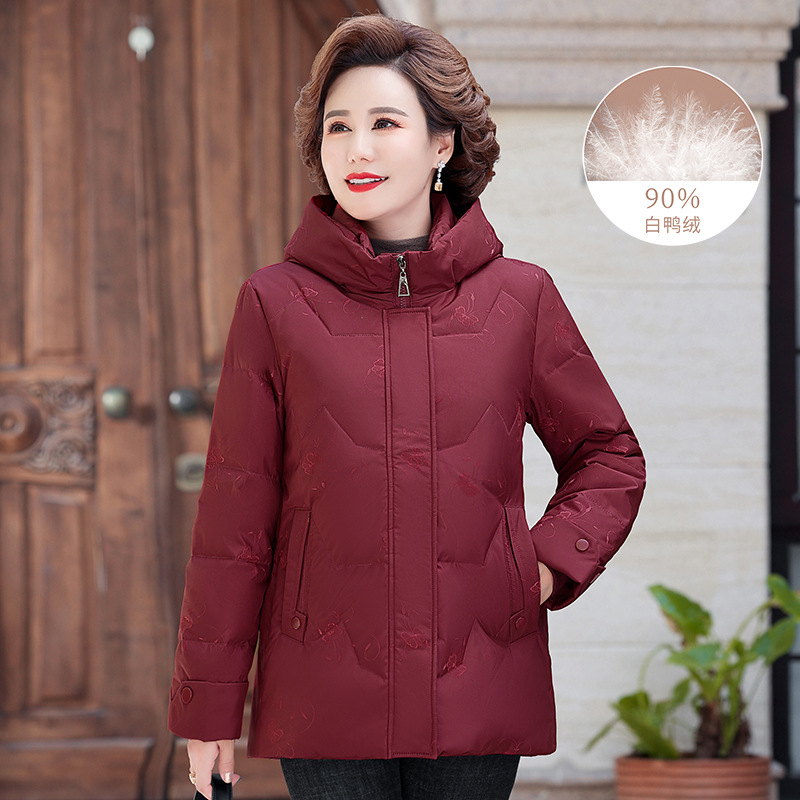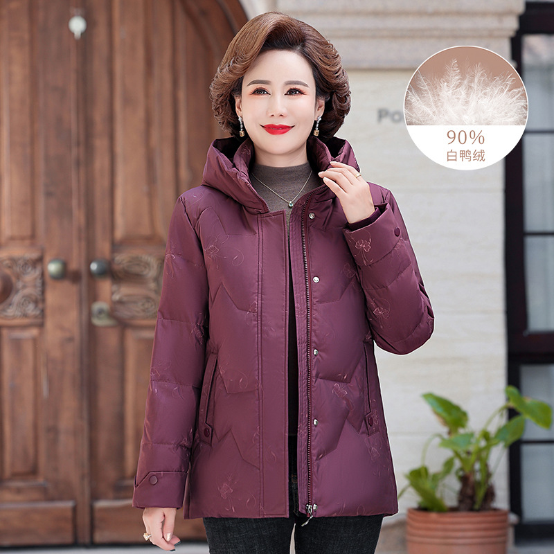 브랜드 겨울 중년 어머니의 다운 재킷 여성의 2024 중장 화이트 덕 다운 두꺼운 후드 재킷