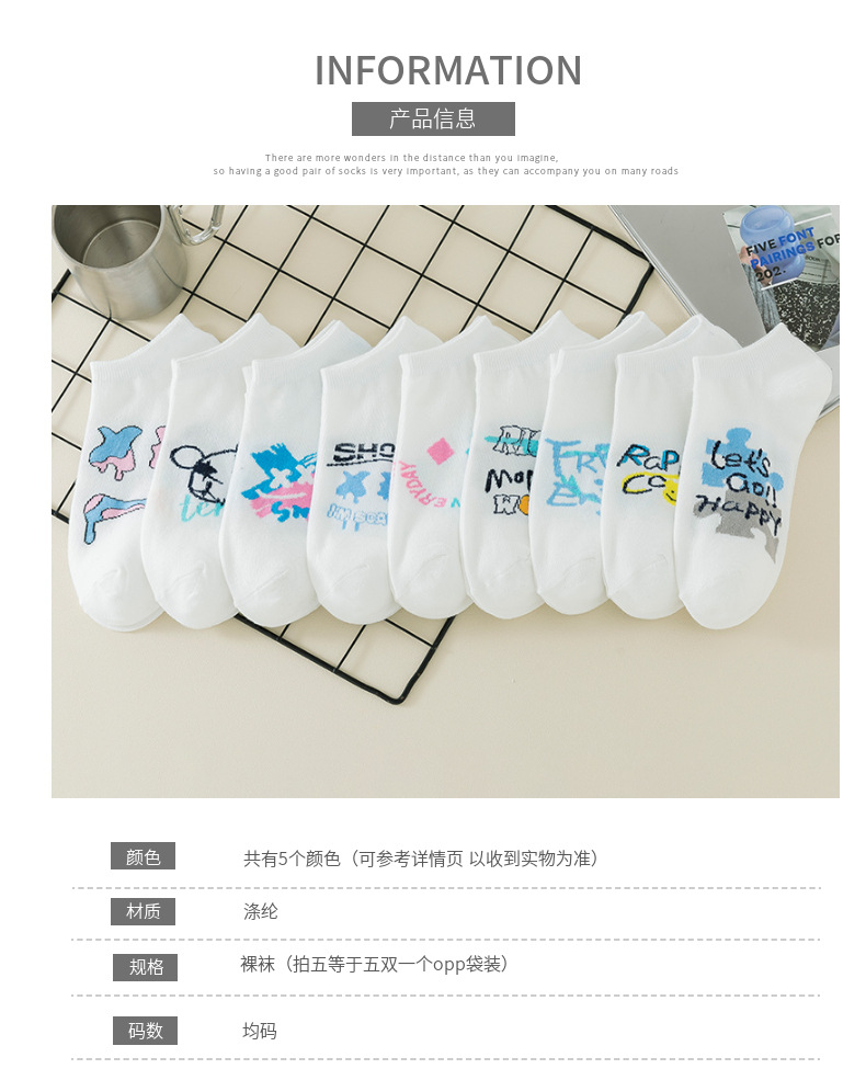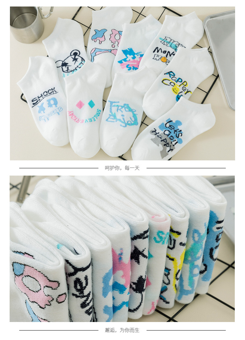 국경 양말 여성의 새로운 귀여운 만화 한국 버전의 흰색 재미있는 시리즈 여성 보트 양말 땀 흡수성 통기성 양말 도매스토어 가기