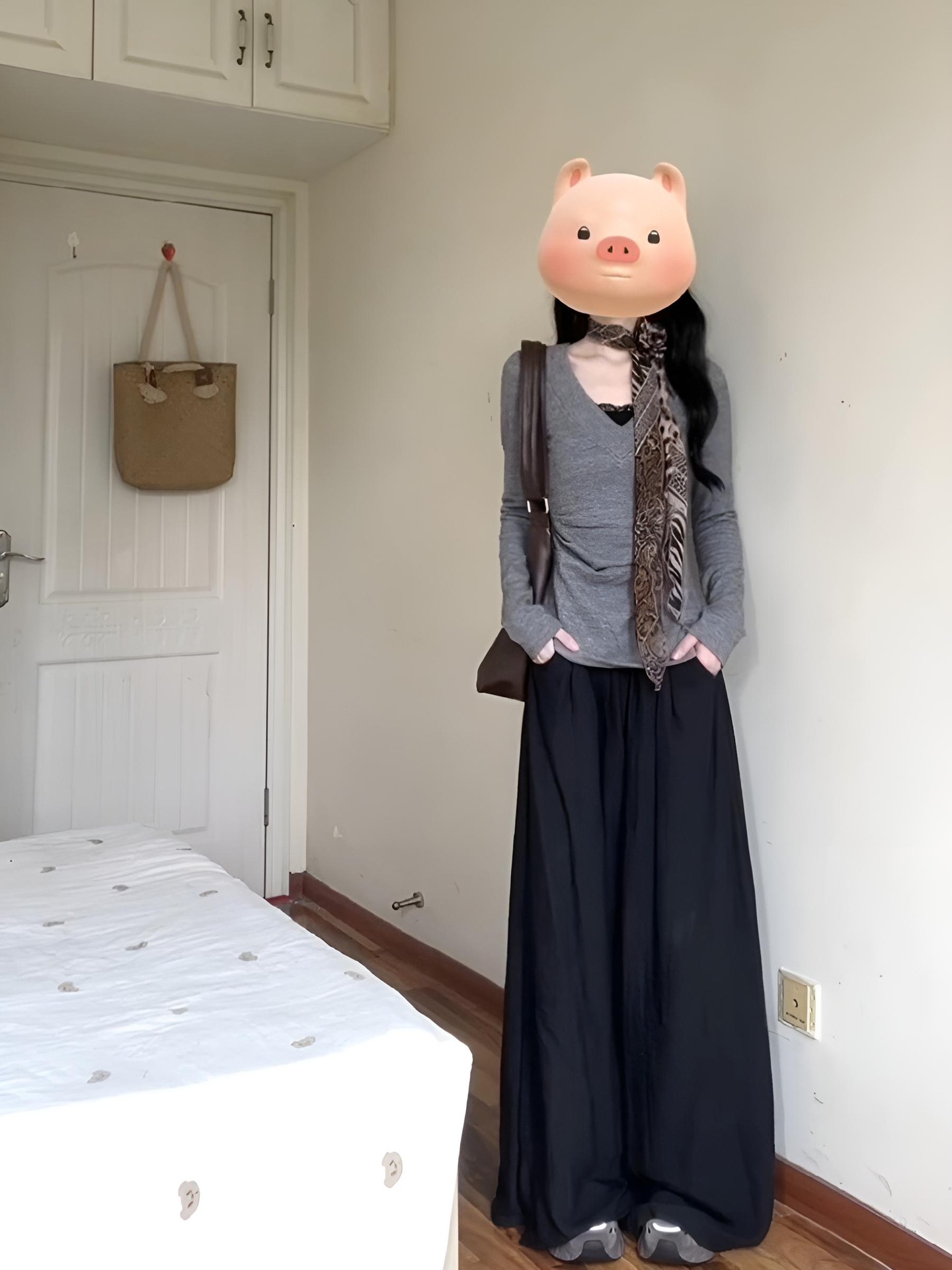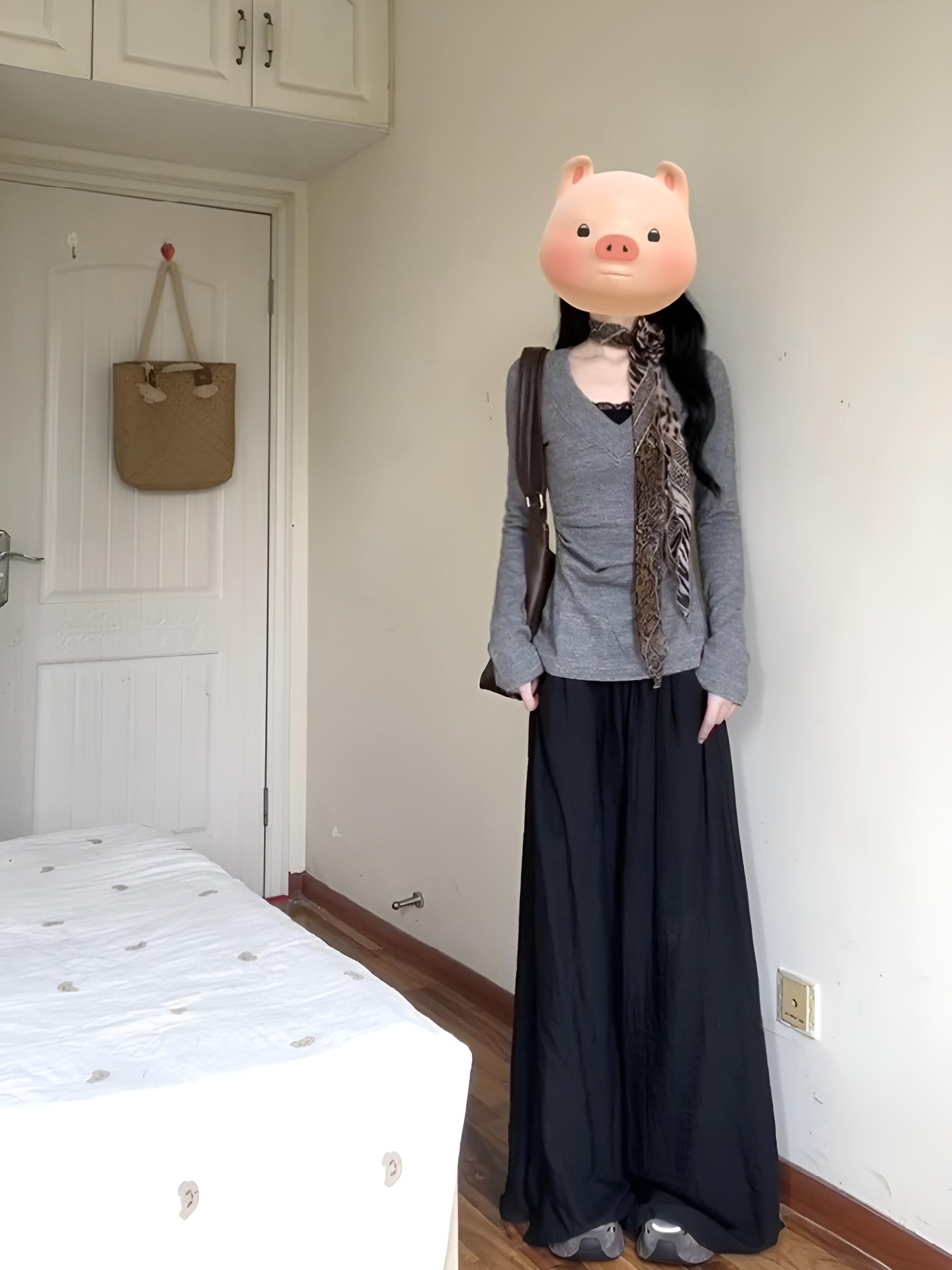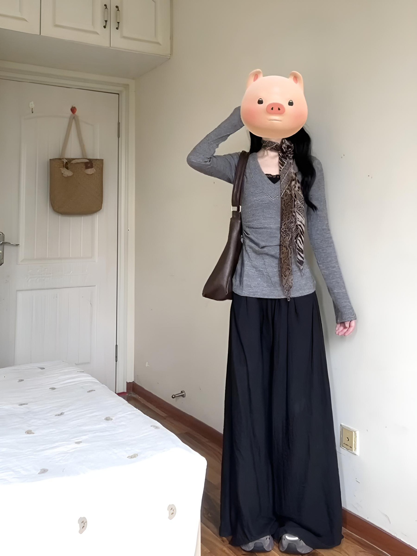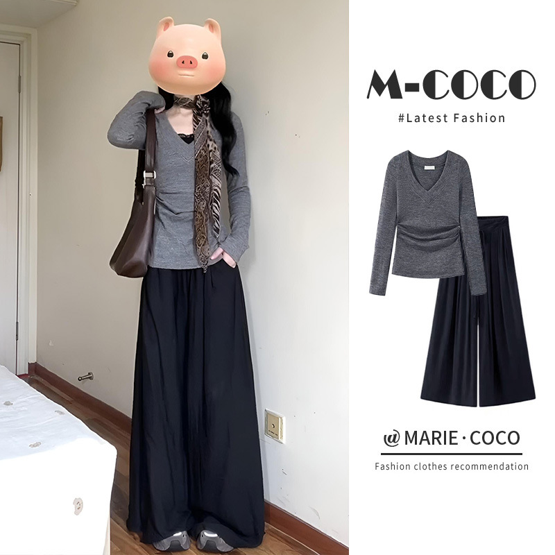 V-Neck 게으른 높은 수준의 긴 소매 스웨터 여성의 2024 가을 착용 캐주얼 다발 넓은 다리 바지