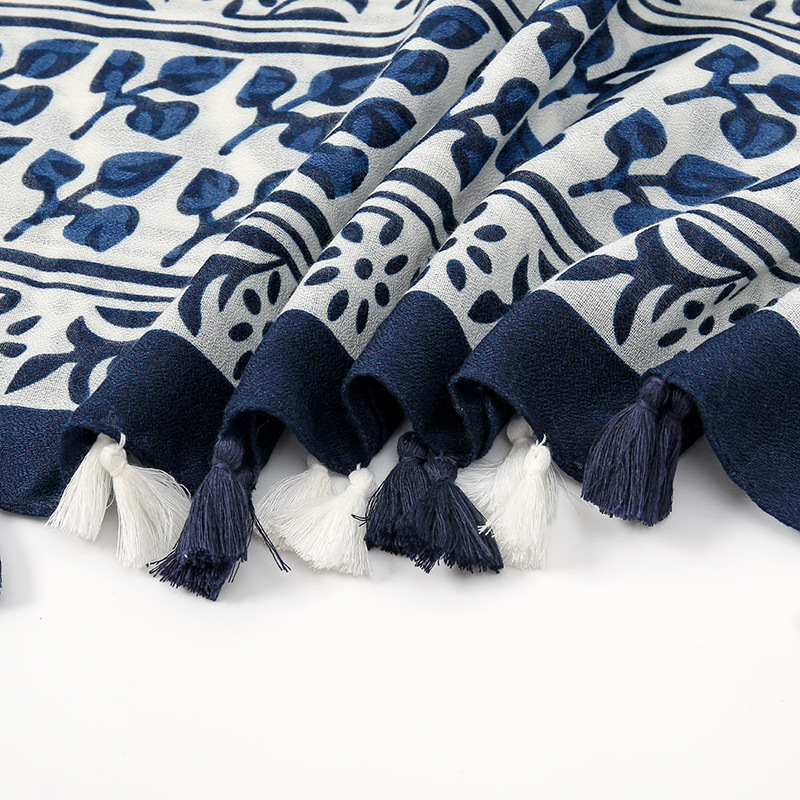 새로운 패션 다목적 빈티지 네이비 줄무늬 인쇄 타슬 면 린넨 손 스카프 여성의 햇빛 목도리