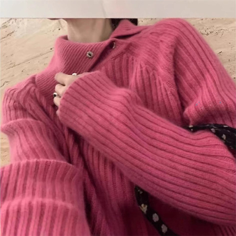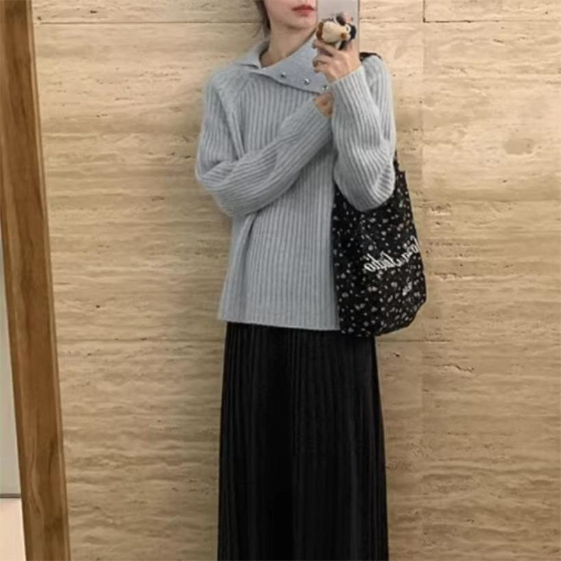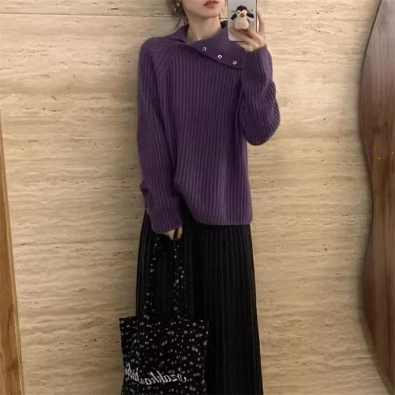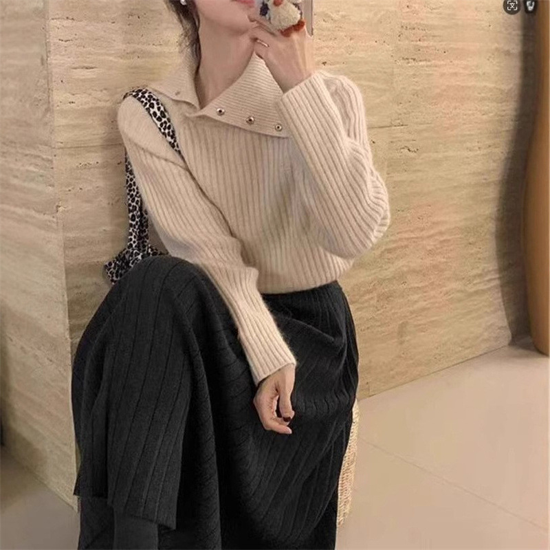 여성을위한 디자인 라펠 긴팔 풀오버 스웨터 2025 새로운 가을 스타일 게으른 스타일 불규칙한 느슨한 니트 탑
