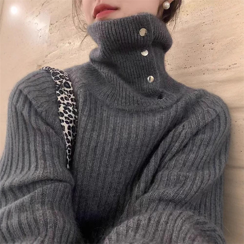 여성을위한 디자인 라펠 긴팔 풀오버 스웨터 2025 새로운 가을 스타일 게으른 스타일 불규칙한 느슨한 니트 탑스토어 가기