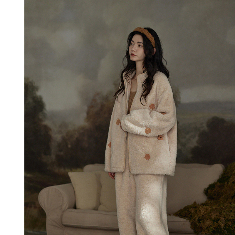 흰 산호 양털 잠옷 여자의 가을과 겨울 기모 홈 옷 여자의 캐주얼 지퍼 두꺼운 겨울을 입고스토어 가기