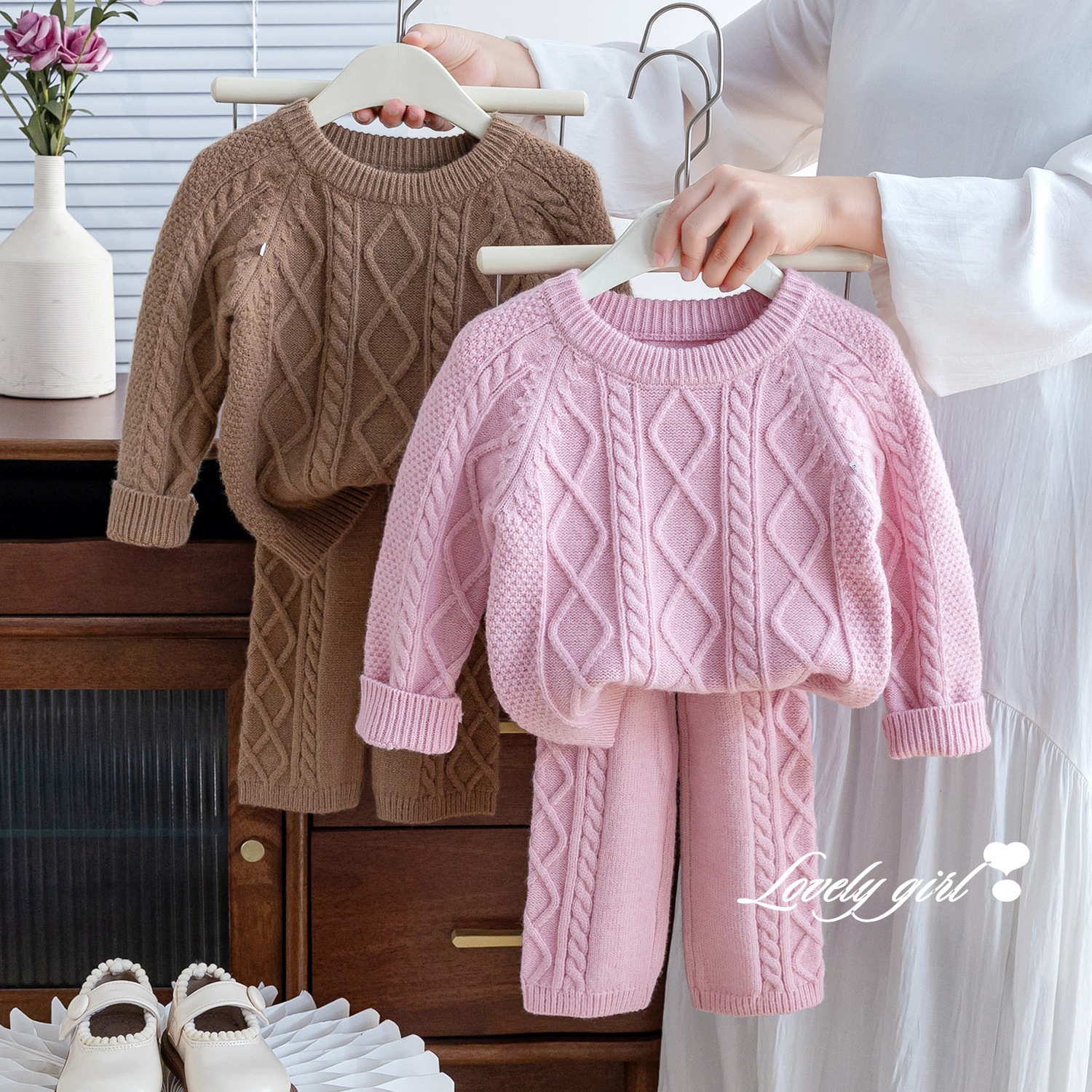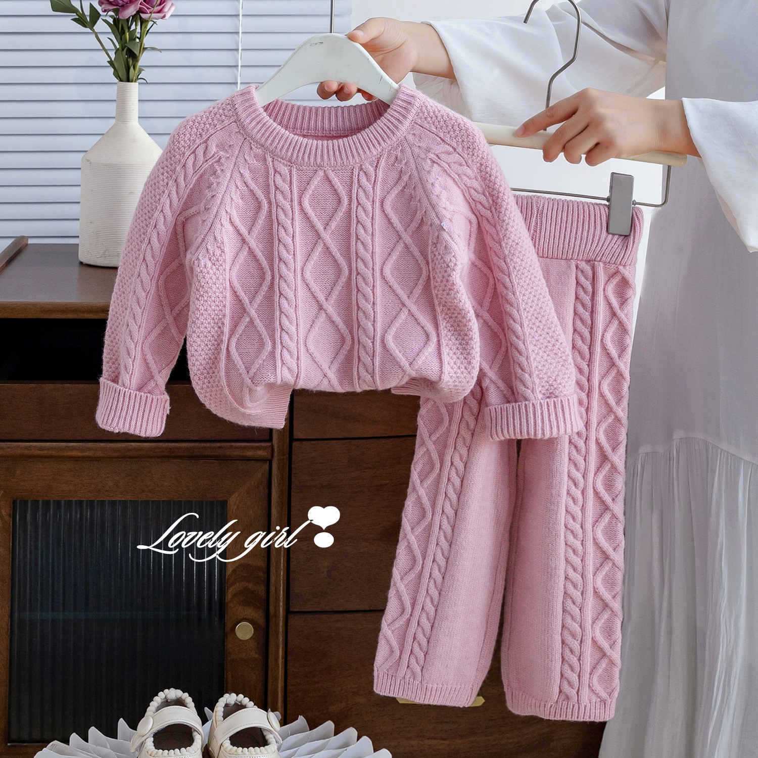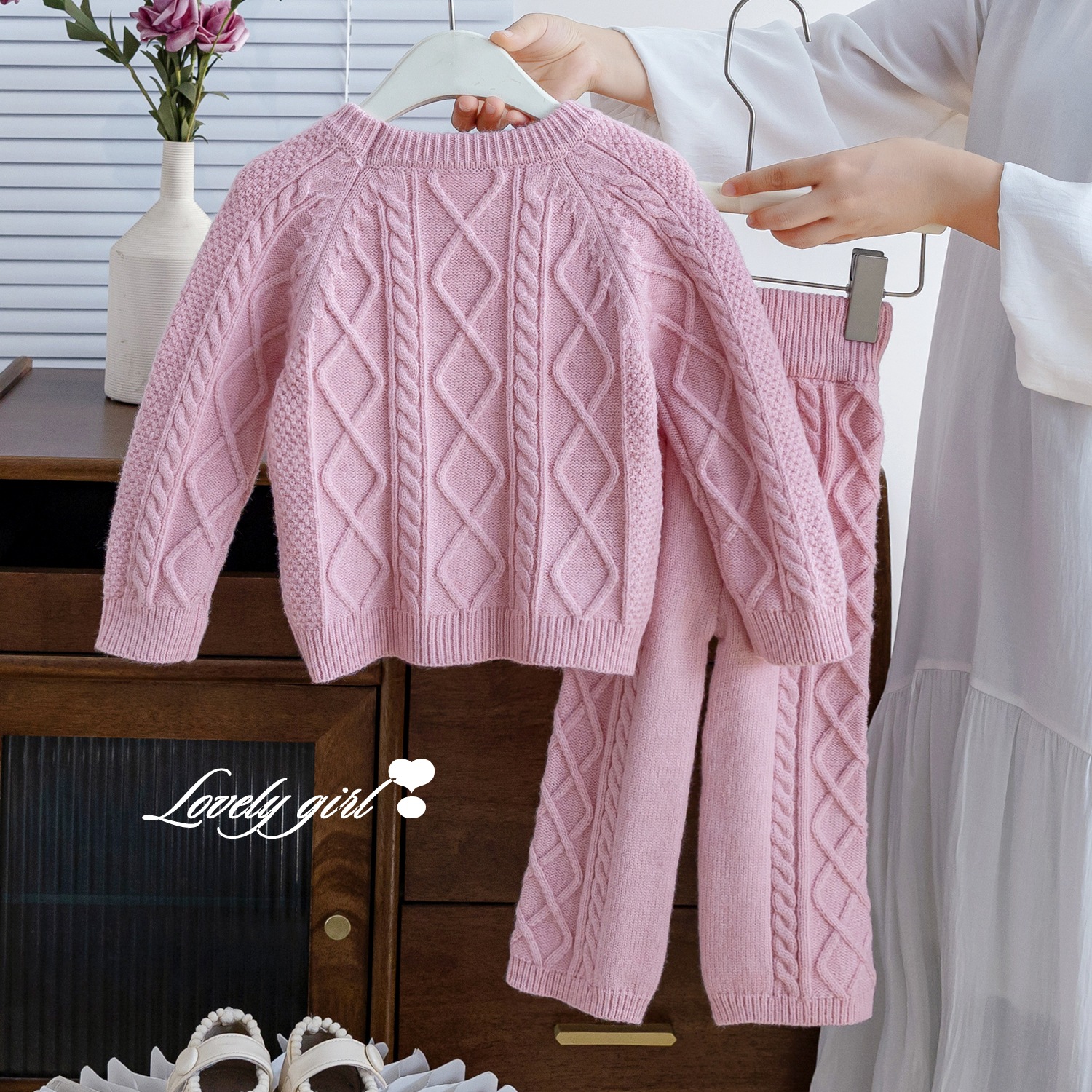 한국 아동복 가을과 겨울 외국 스타일 새로운 소녀 복고풍 기질 패션 단색 니트 스웨터 울 바지 투피스 세트스토어 가기