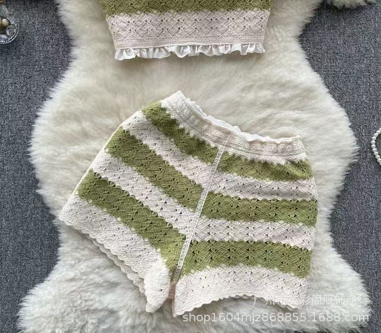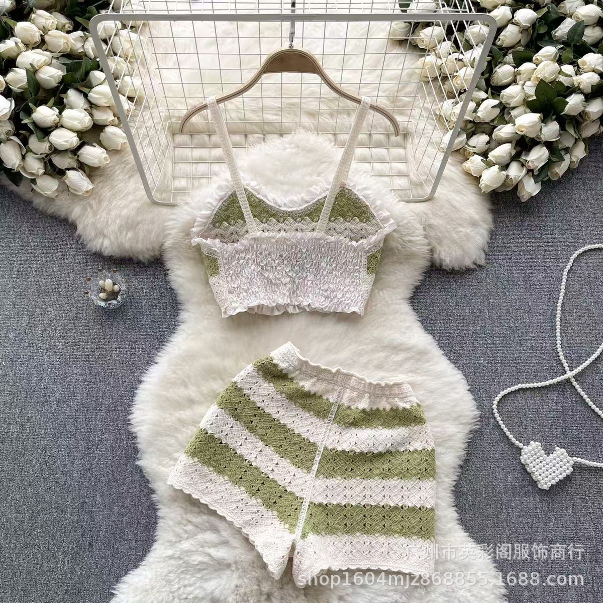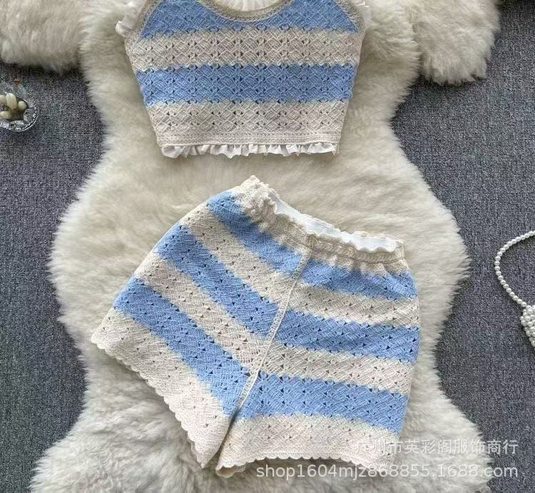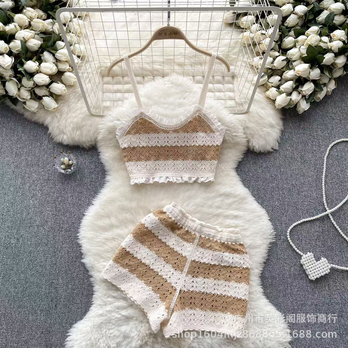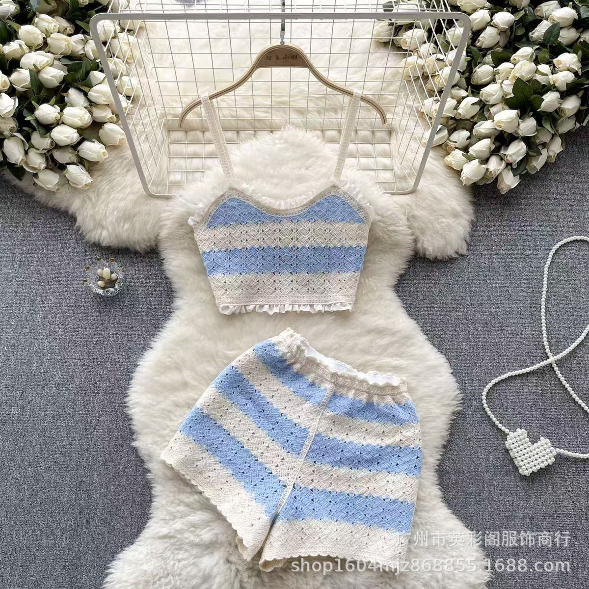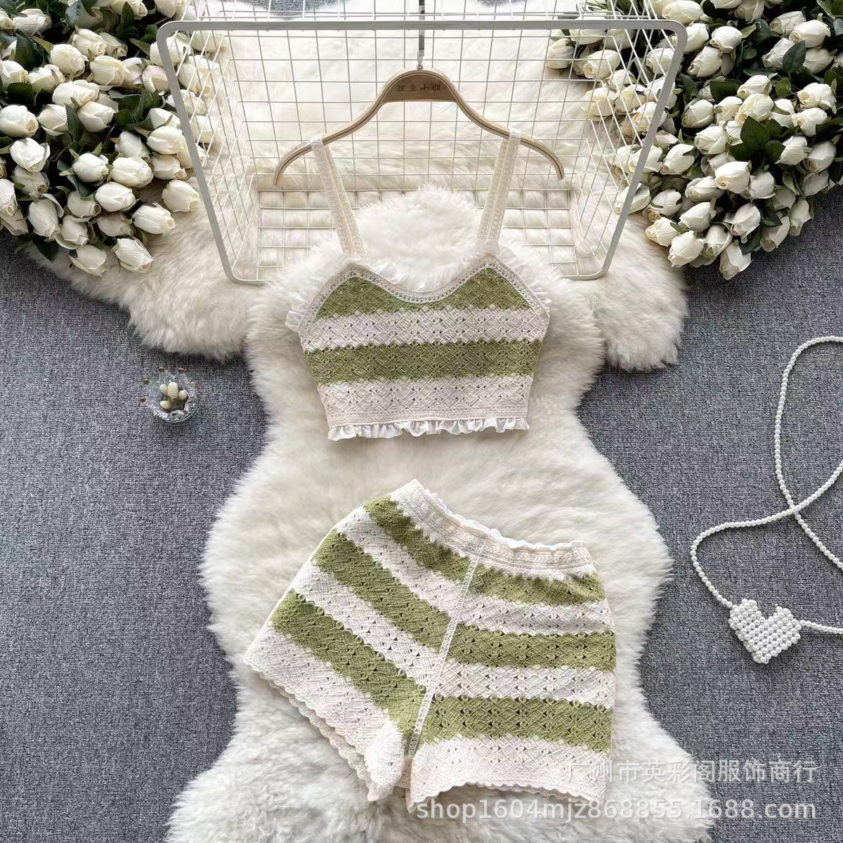 한국식 달콤한 소녀의 손 줄무늬 V-Neck 짠 카미솔 A 라인 스커트 투피스 세트