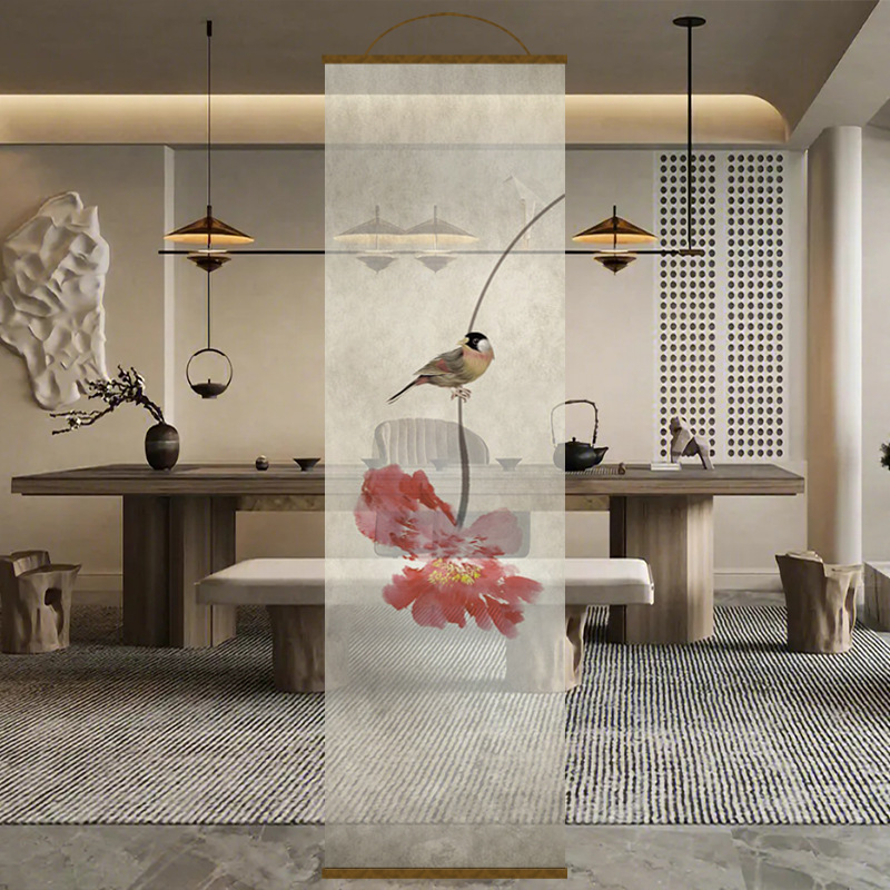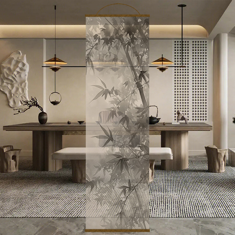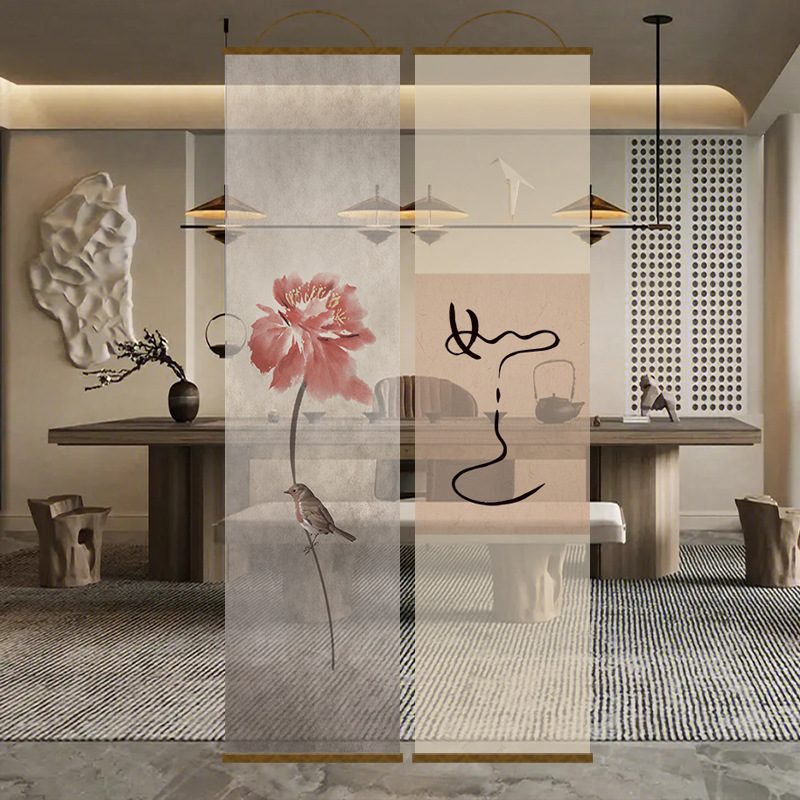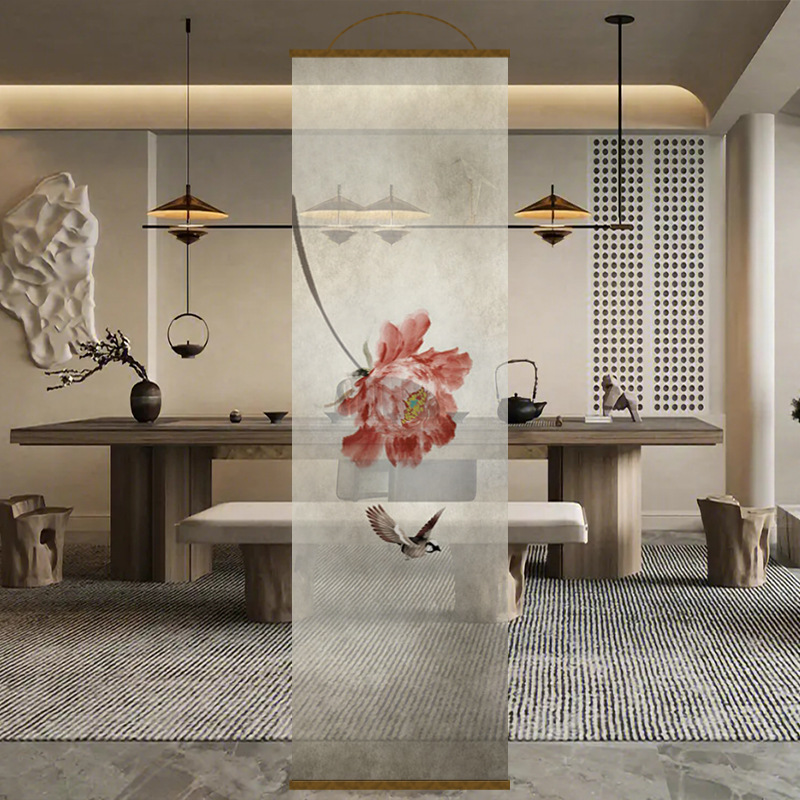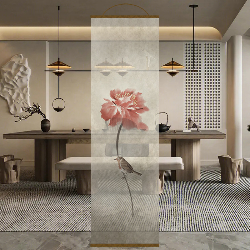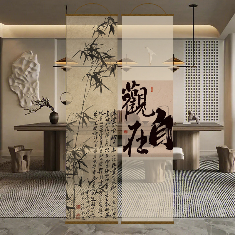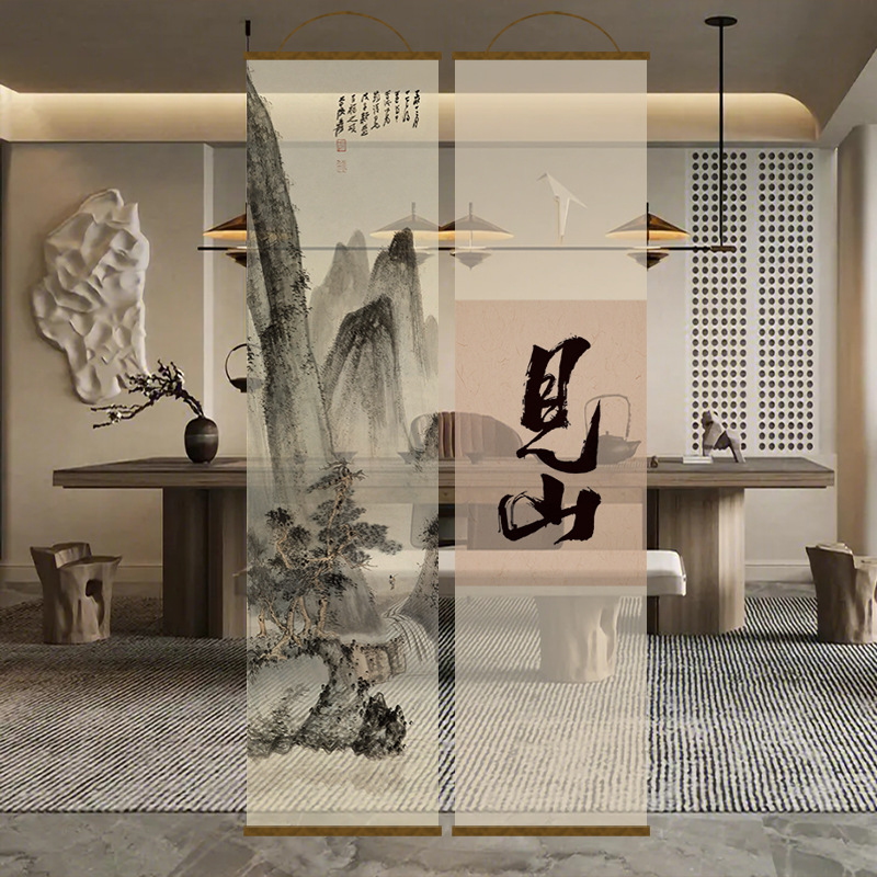 半透纱纱幔装饰画双面挂画半透卷帘纱帘窗帘屏风日式侘寂中国风古风复古隔断挂帘透光禅意透景半透玻璃定制玄关