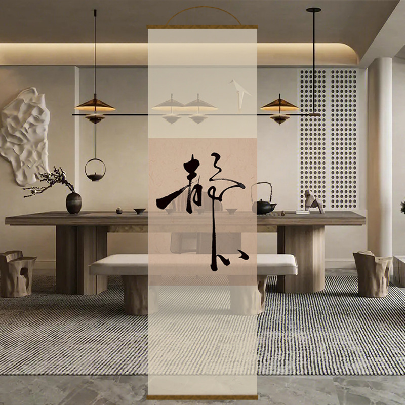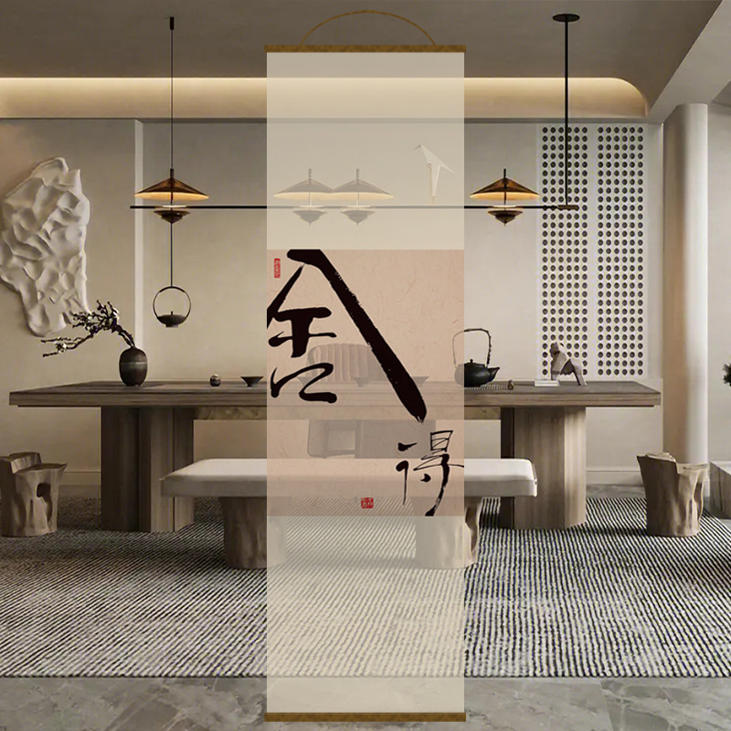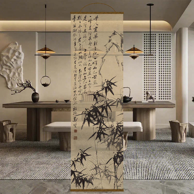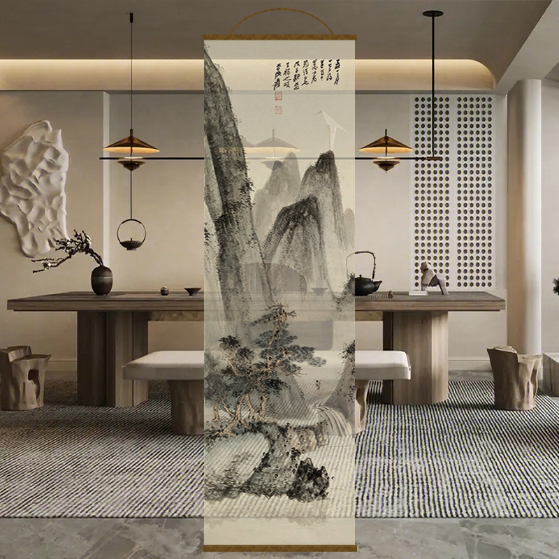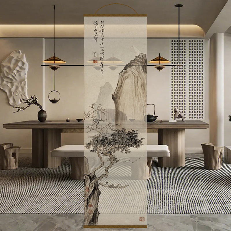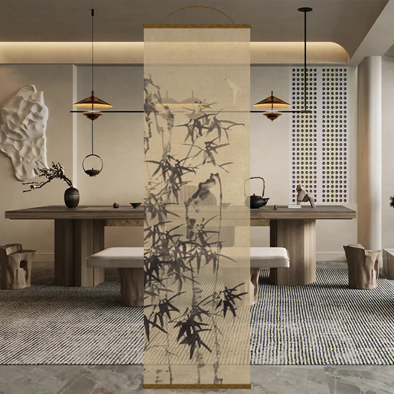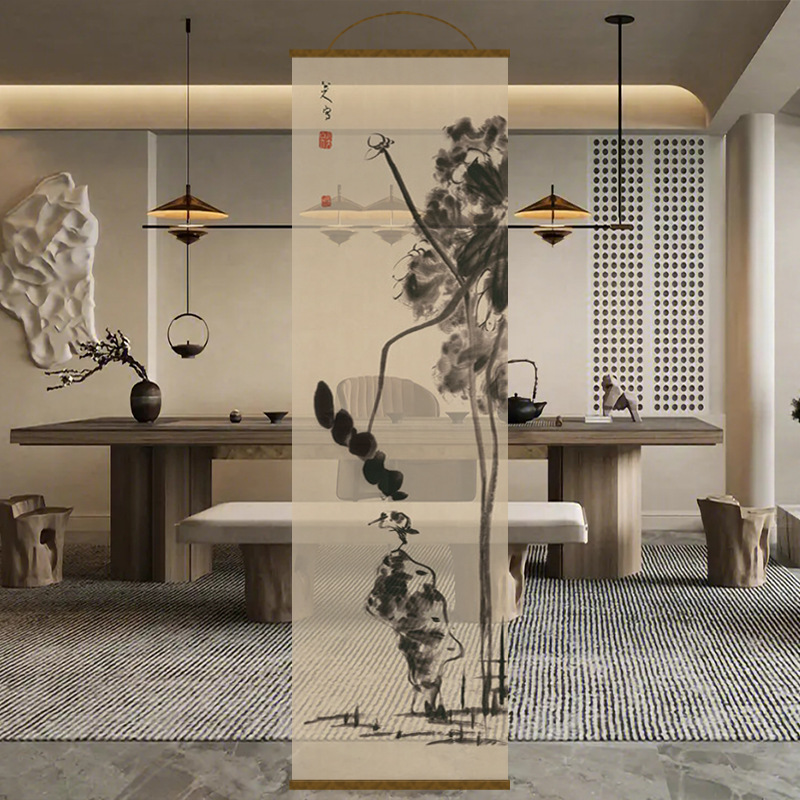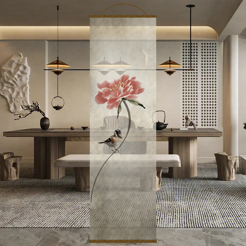 半透纱纱幔装饰画双面挂画半透卷帘纱帘窗帘屏风日式侘寂中国风古风复古隔断挂帘透光禅意透景半透玻璃定制玄关