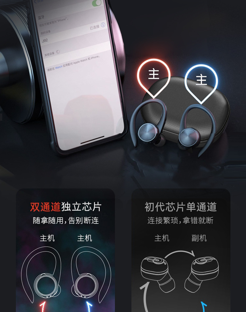 J92 블루투스 이어폰 tws 귀걸이형 무선 스포츠 듀얼 이어폰 노이즈 캔슬링 공장 도매 스포츠 스타일