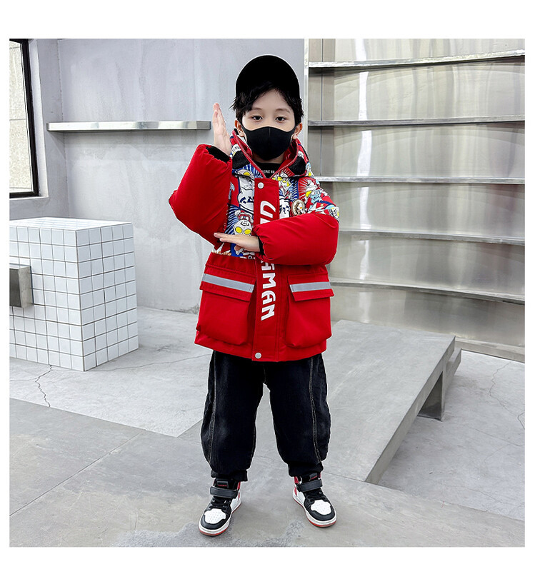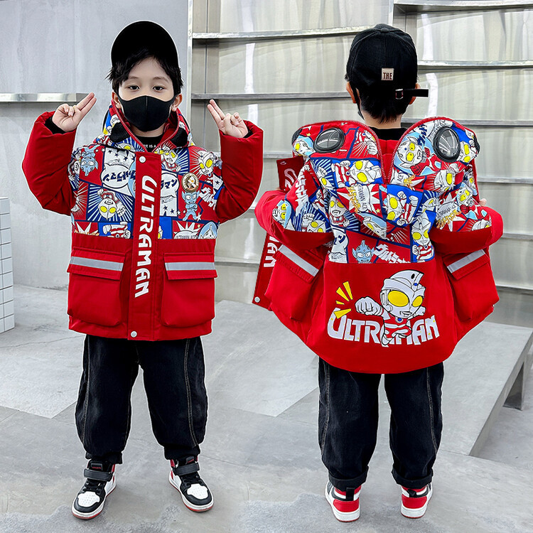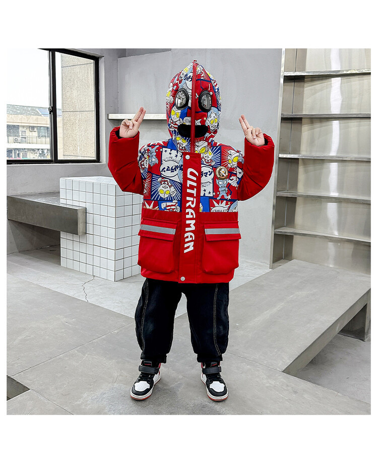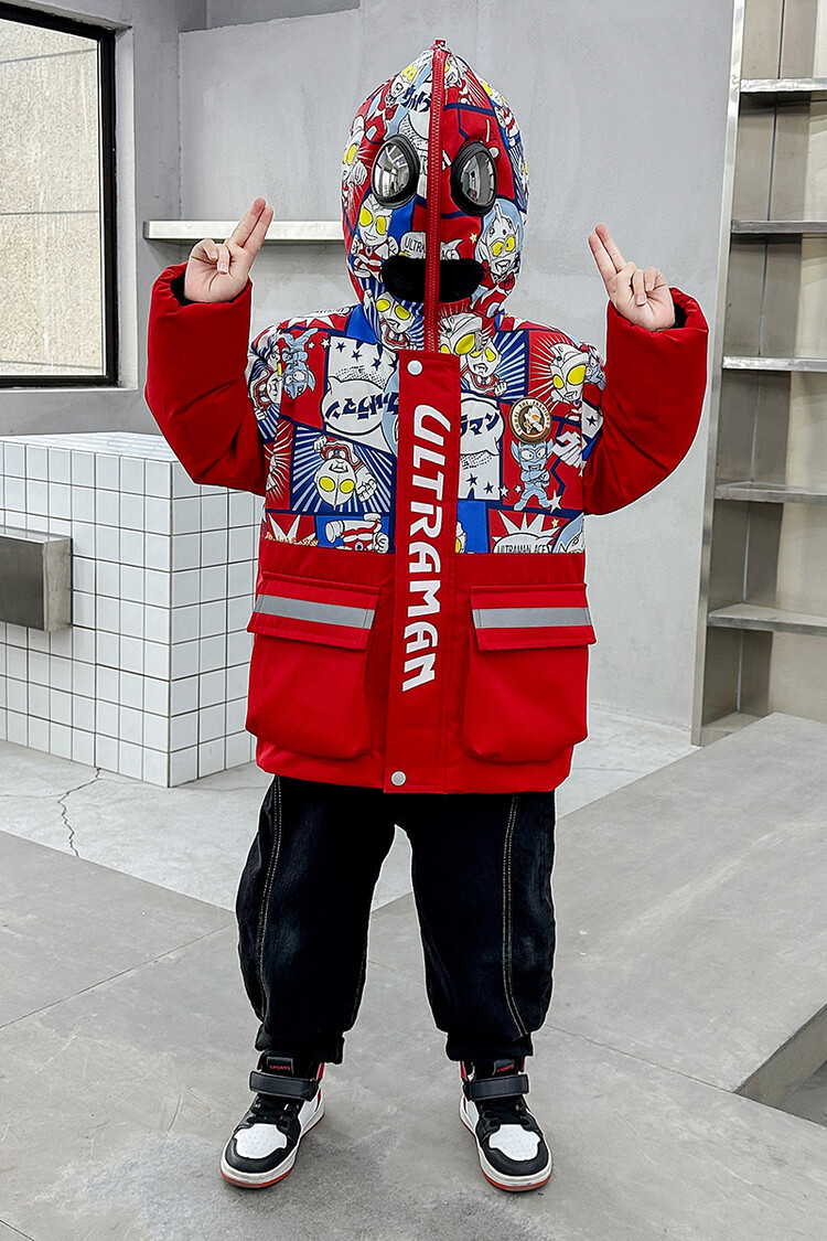 대형 어린이를위한 안경 후드 코튼 패딩 코트 소년 울트라 맨 코튼 패딩 코트 2024 겨울 감기 방풍 면화 패딩 코트