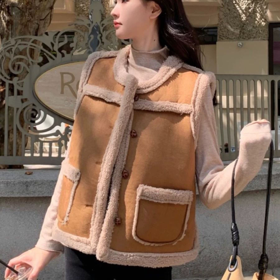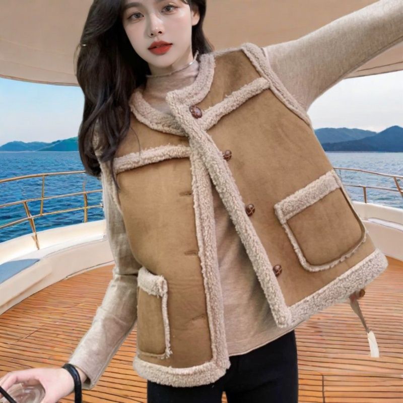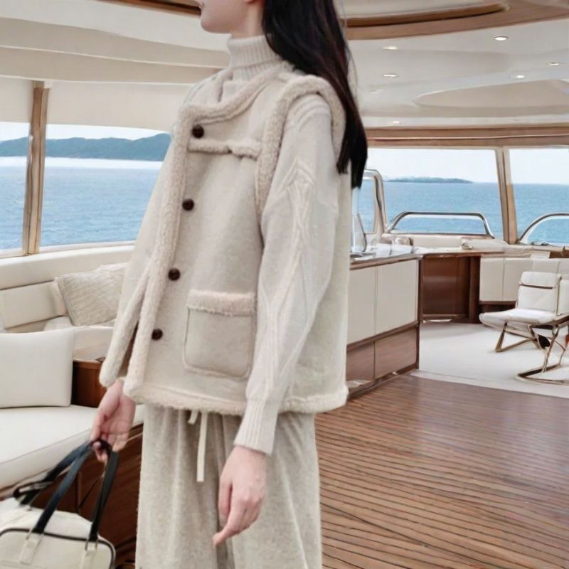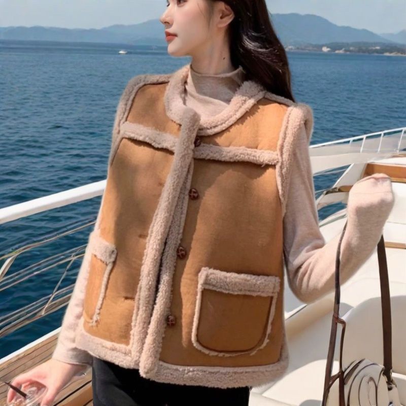 샤넬 스타일 양고기 조끼 여자 2024 가을 겨울 한국 스타일 두꺼운 웨어러블 모피 새로운 올인원 재킷