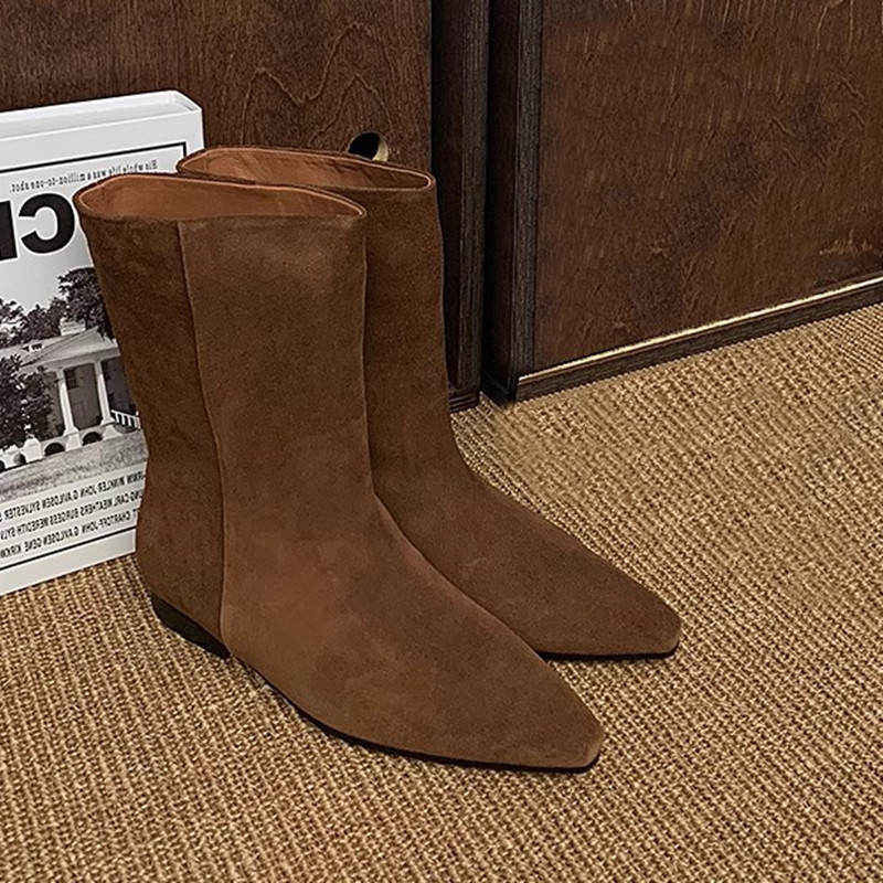 양가죽 버전~대형 튜브형 한국 스타일 스웨이드 뾰족코 미드부츠 낮은 굽 두꺼운 굽 플랫 바닥 레트로 패션 마틴 숏부츠