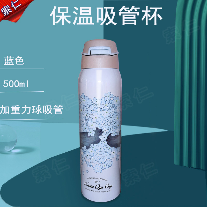 • ♥❥❤❣❣블루플라워 앤 화이트 보온 빨대컵 500ml [중력볼 제외]❣❣❤❥♥