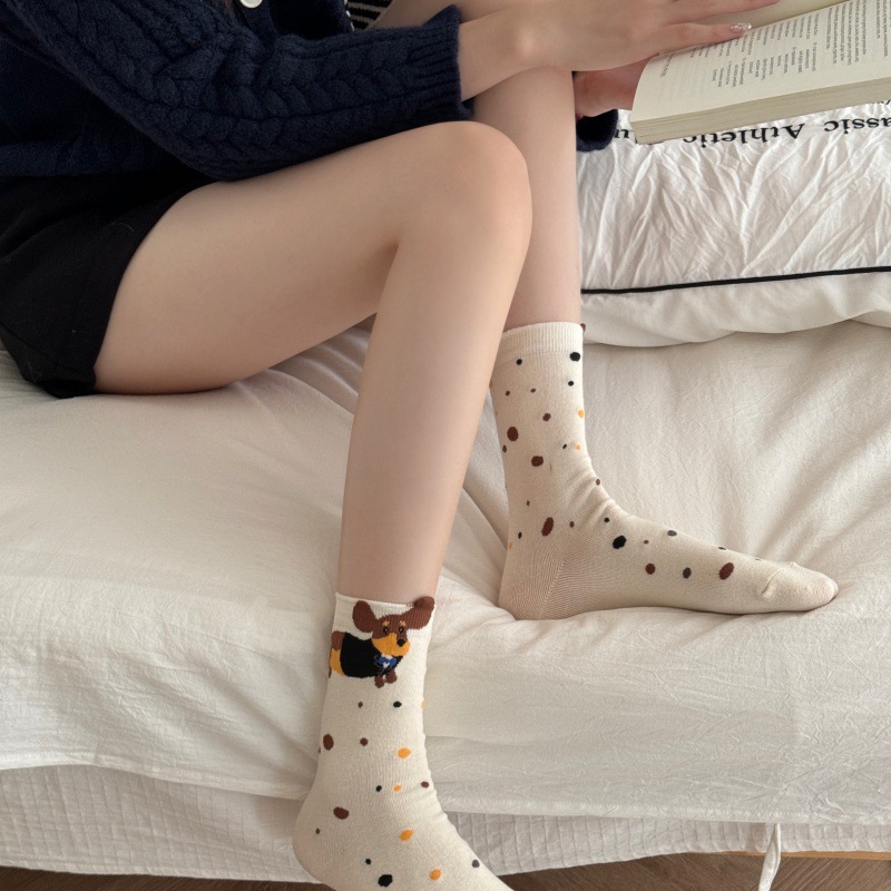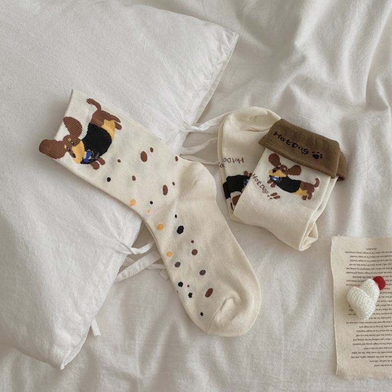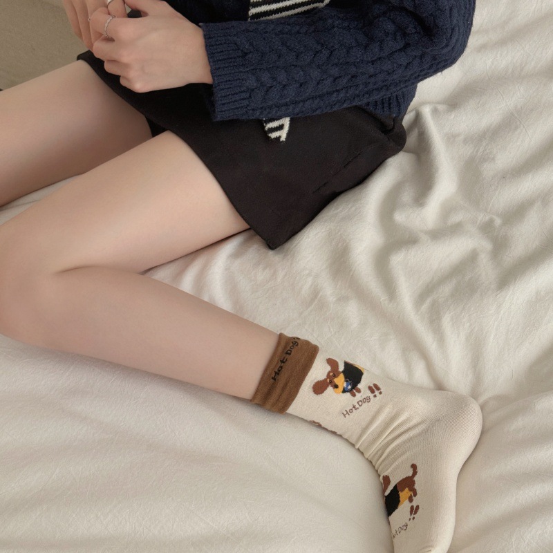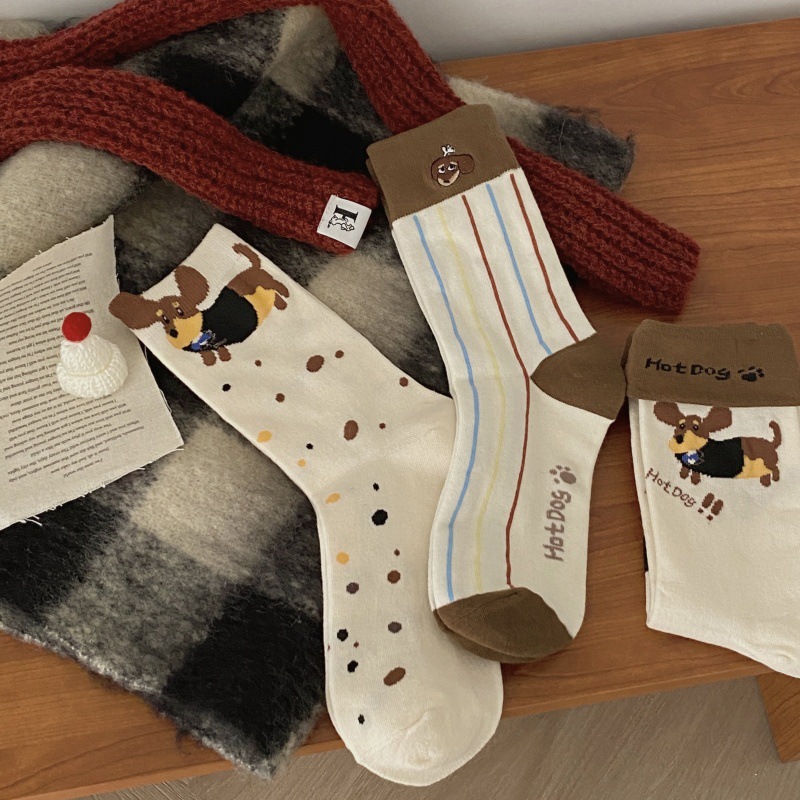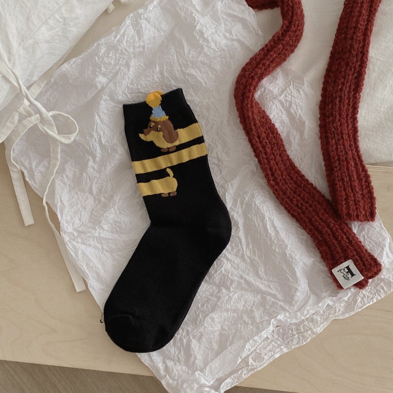 가을과 겨울 강아지 양말 스트라이프 턴 업 만화 닥스 훈트 개 수직 쌓인 양말 귀여운 틈새 4 시즌 양말