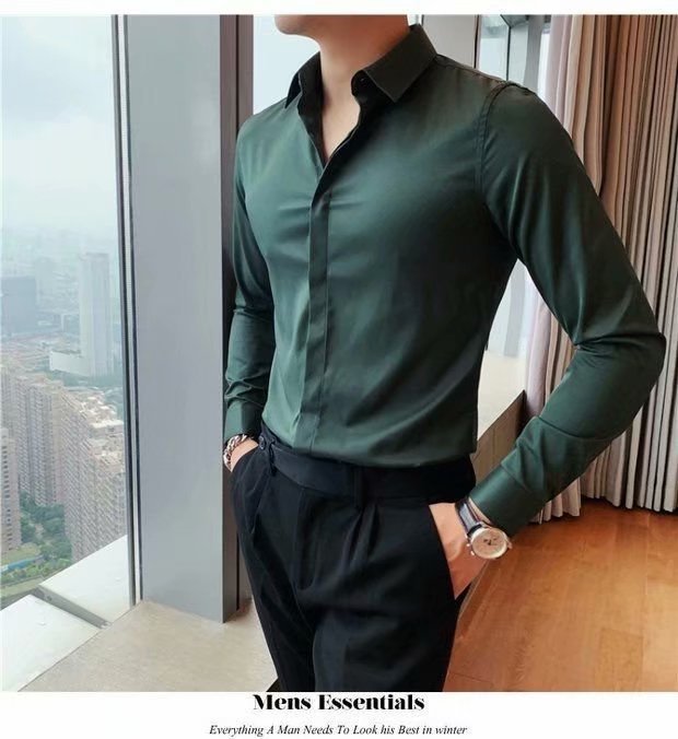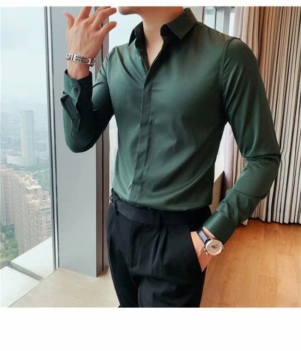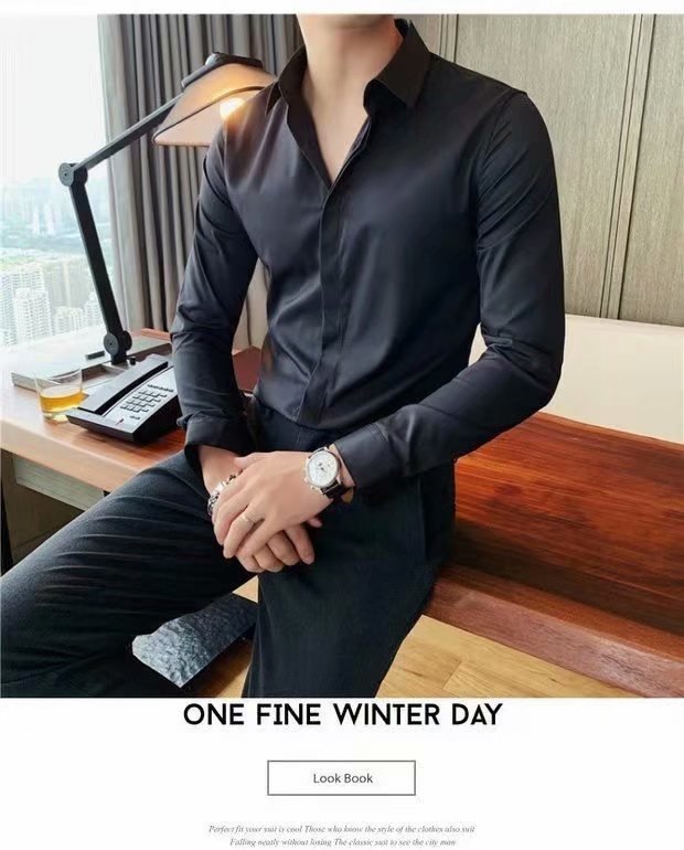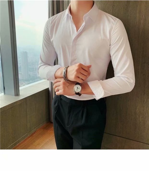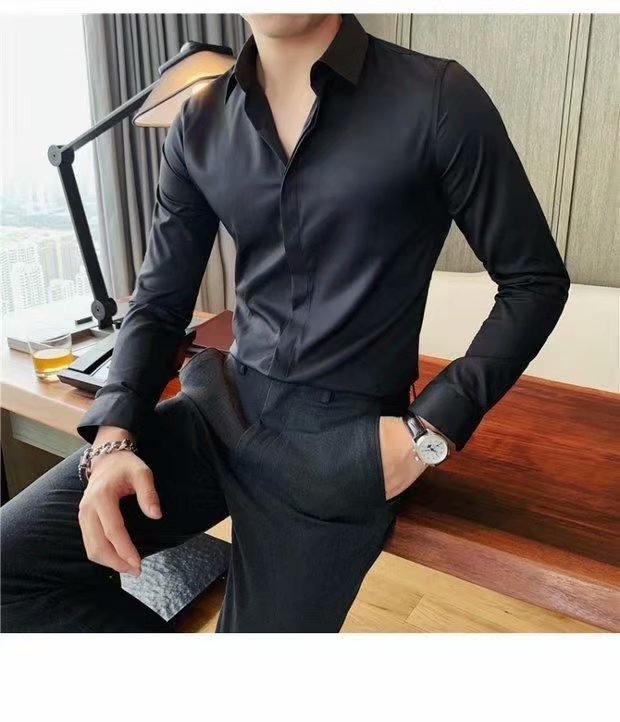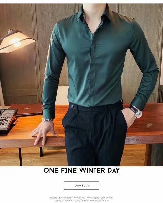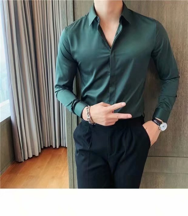 남자 긴팔 셔츠 남자 한국식 숨겨진 버튼 슬림핏 셔츠 남자의 단색 셔츠 세트 내베이스 셔츠