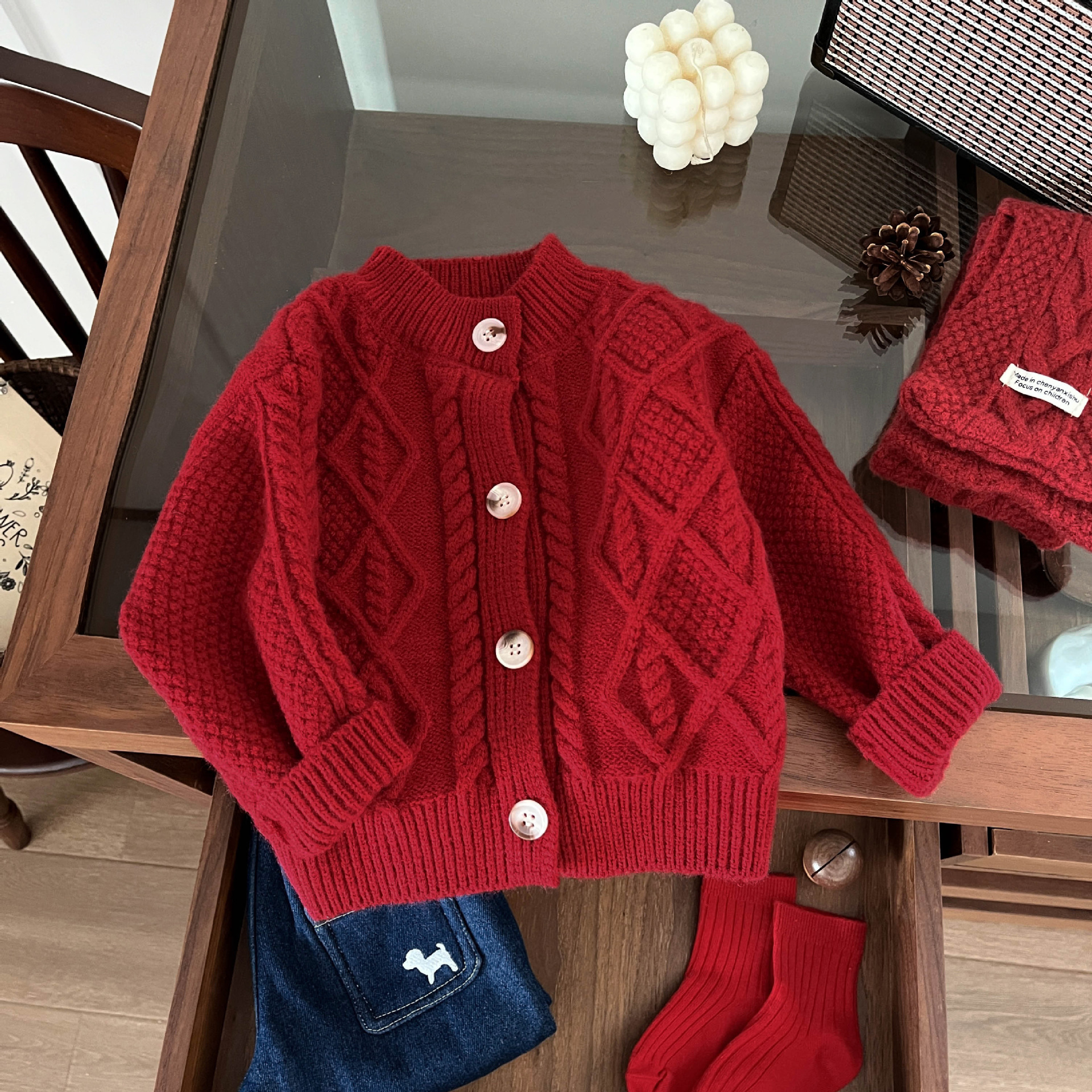 한국 가을과 겨울 어린이 의류 어린이 새해 꼬인 니트 카디건 겨울 빨간 스웨터 소년 소녀스토어 가기