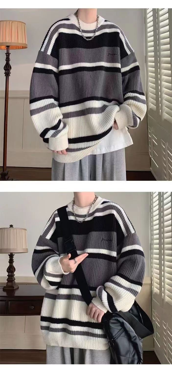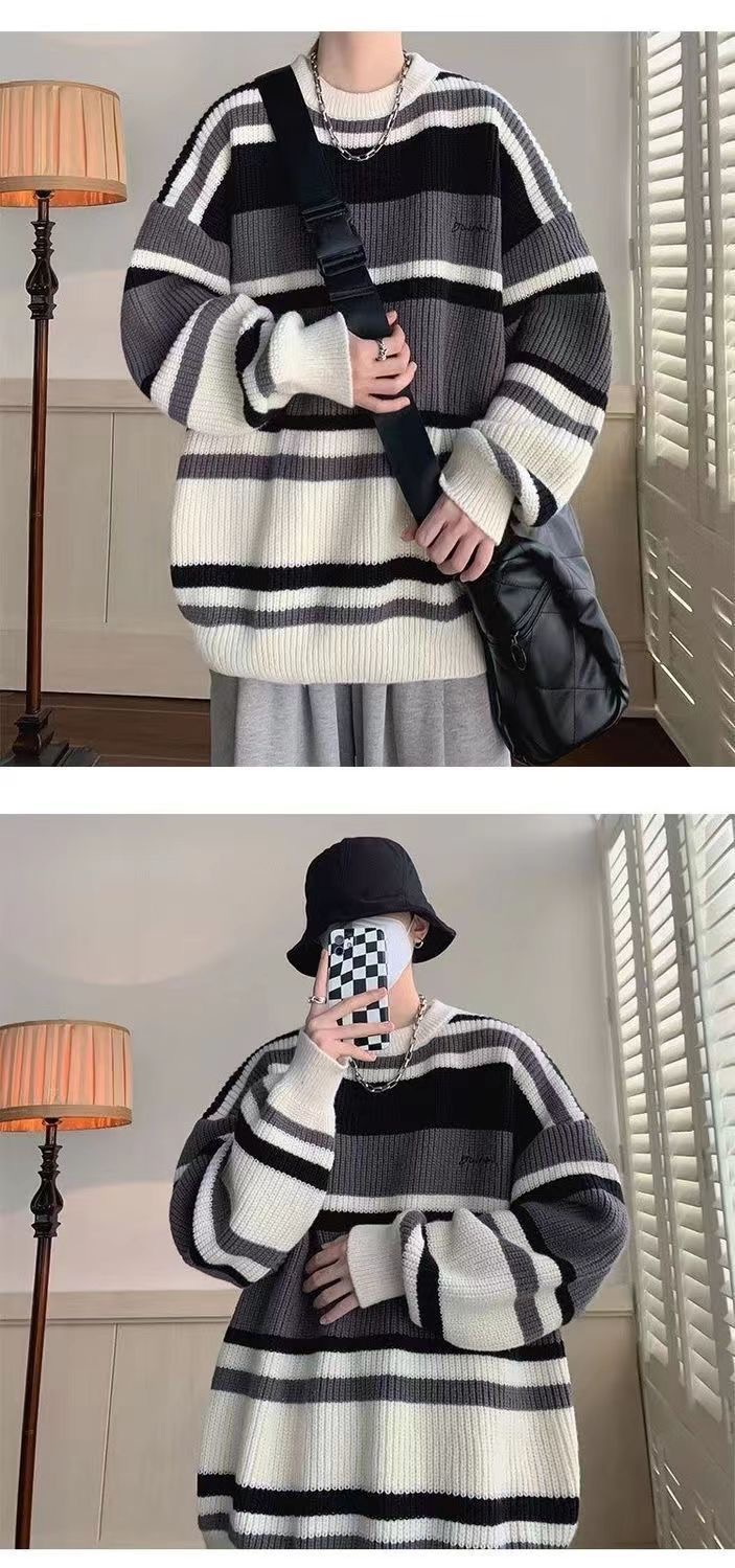 가을과 겨울 스트라이프 스웨터 남성 다재다능한 겉옷 남성 크루 넥 스웨터 홍콩 바람 봄과 가을 플러스 사이즈 스웨터 공장 스트레이트 헤어스토어 가기