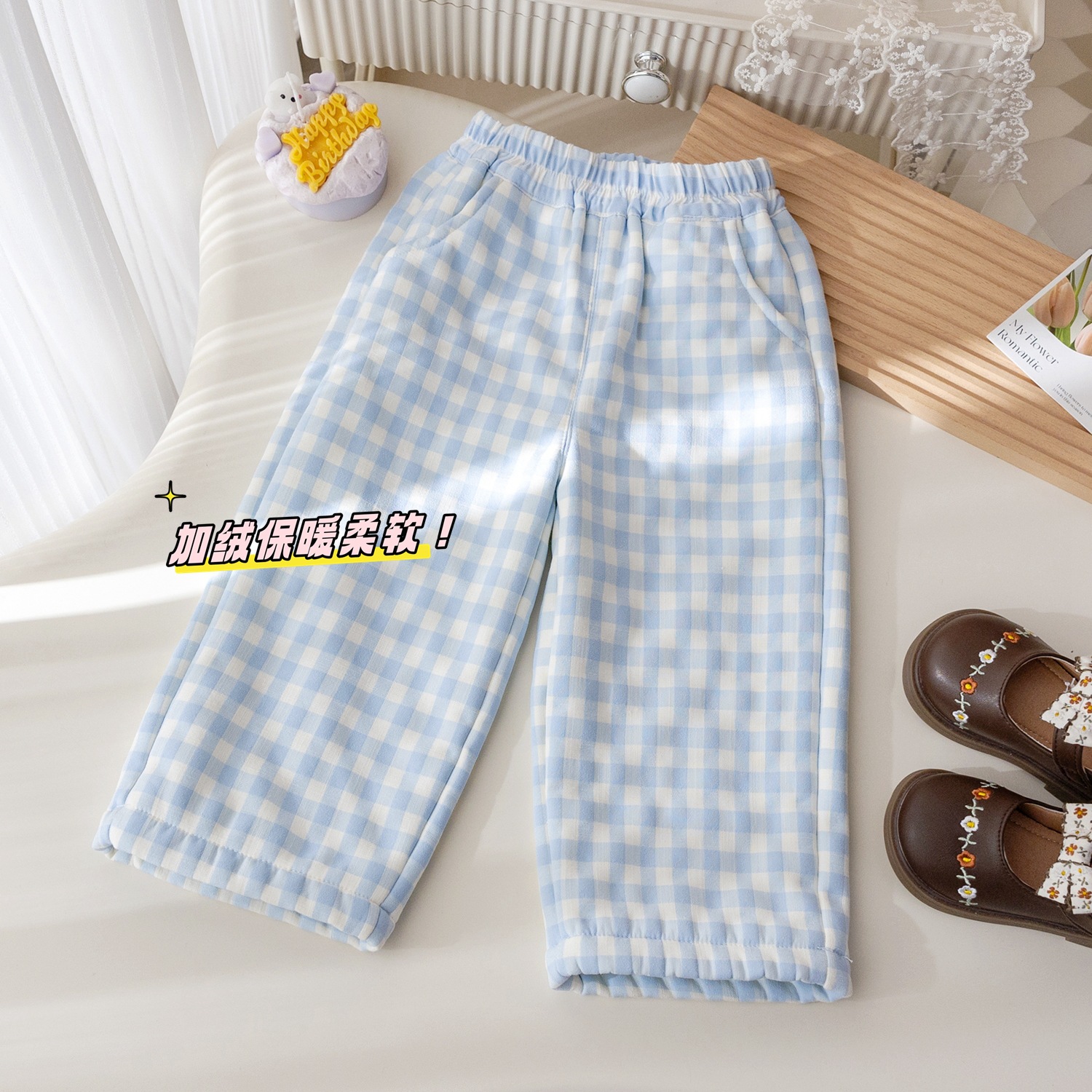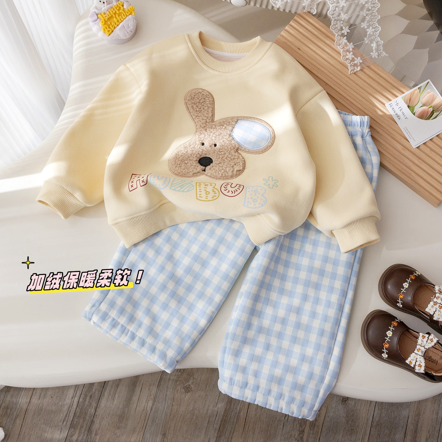 소녀 겨울 새 벨벳 세트 만화 자수 스웨터 서양식 체크 무늬 캐주얼 바지 두꺼운 두 조각 겨울 세트스토어 가기