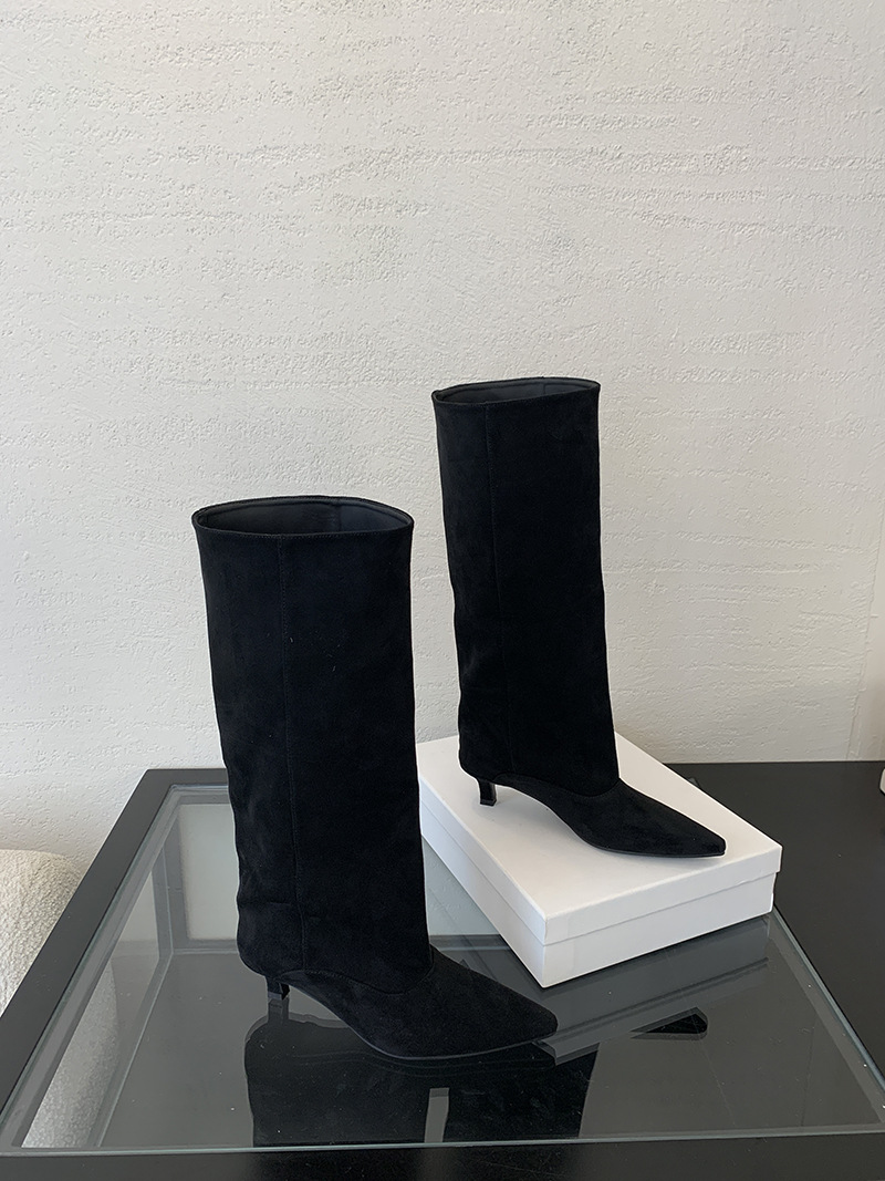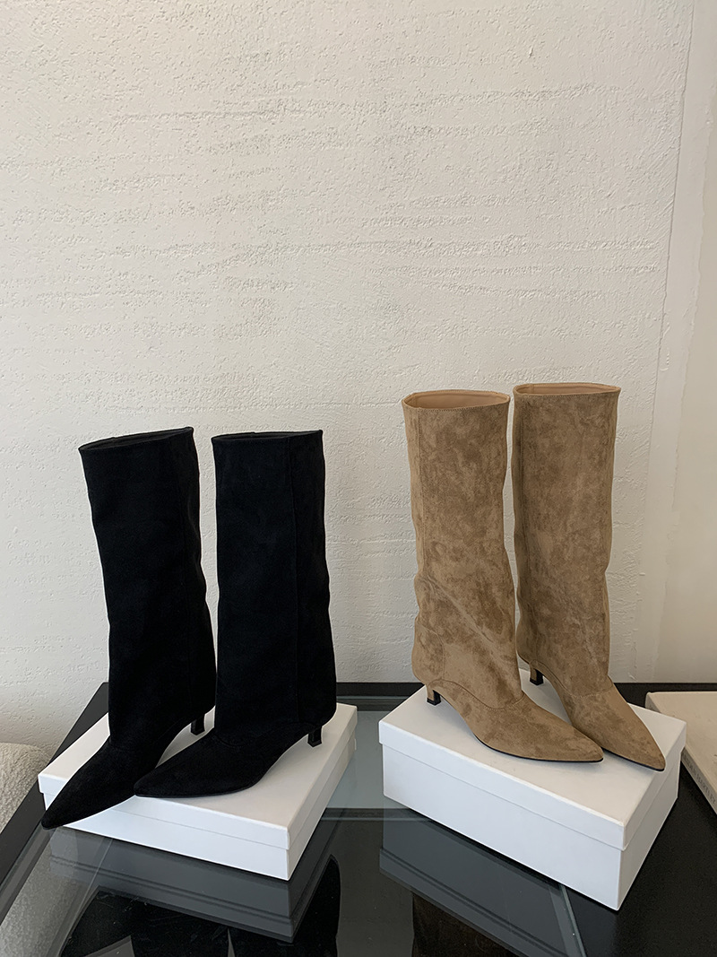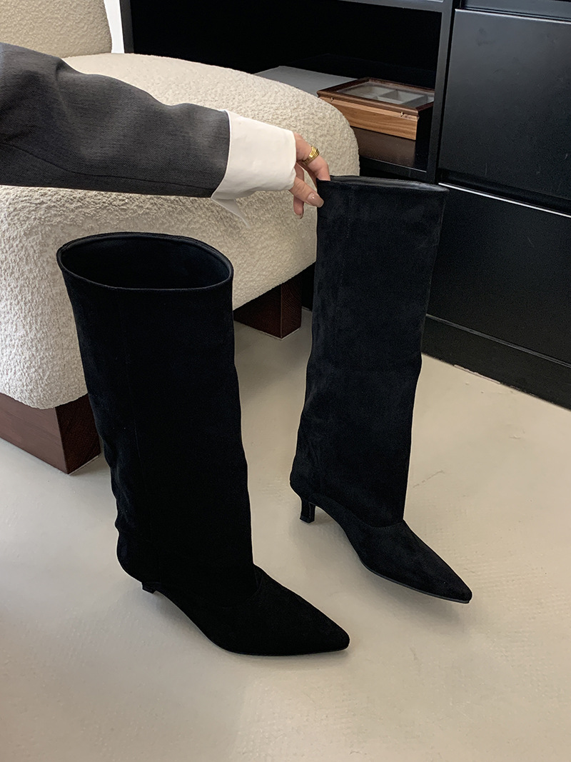 2024 가을 겨울 신상 유럽과 미국의 심플한 기질 로우힐 포인티드 토 하이부츠, 편안하고 활용도가 높은 단색 와이드 공장 직접 공급스토어 가기