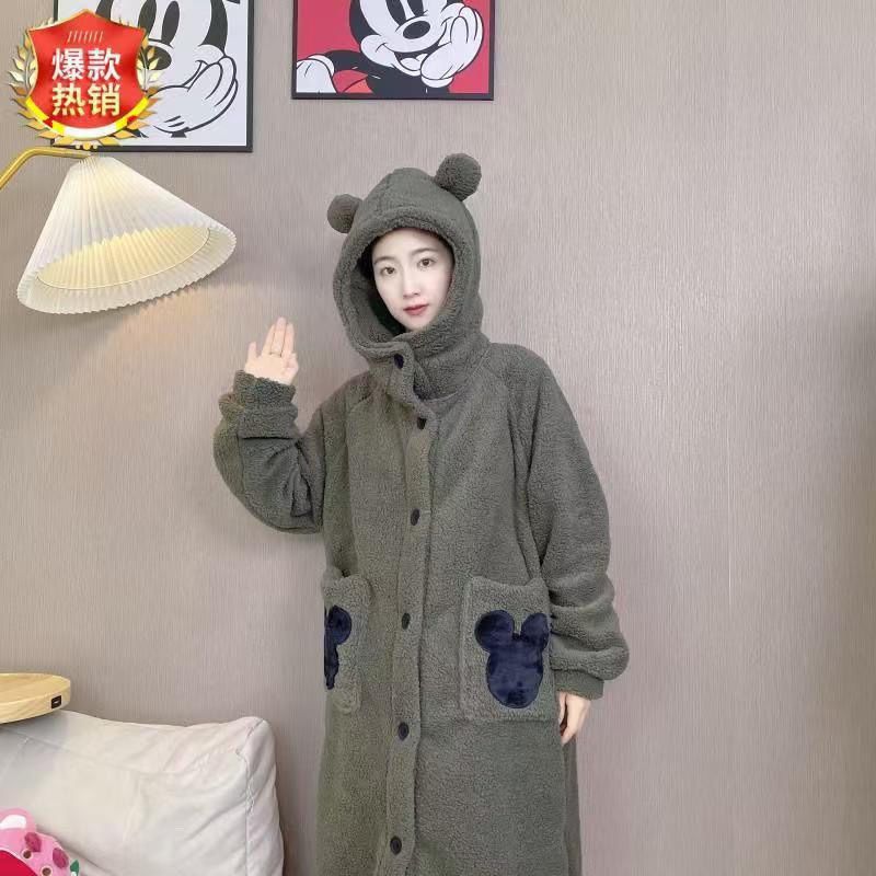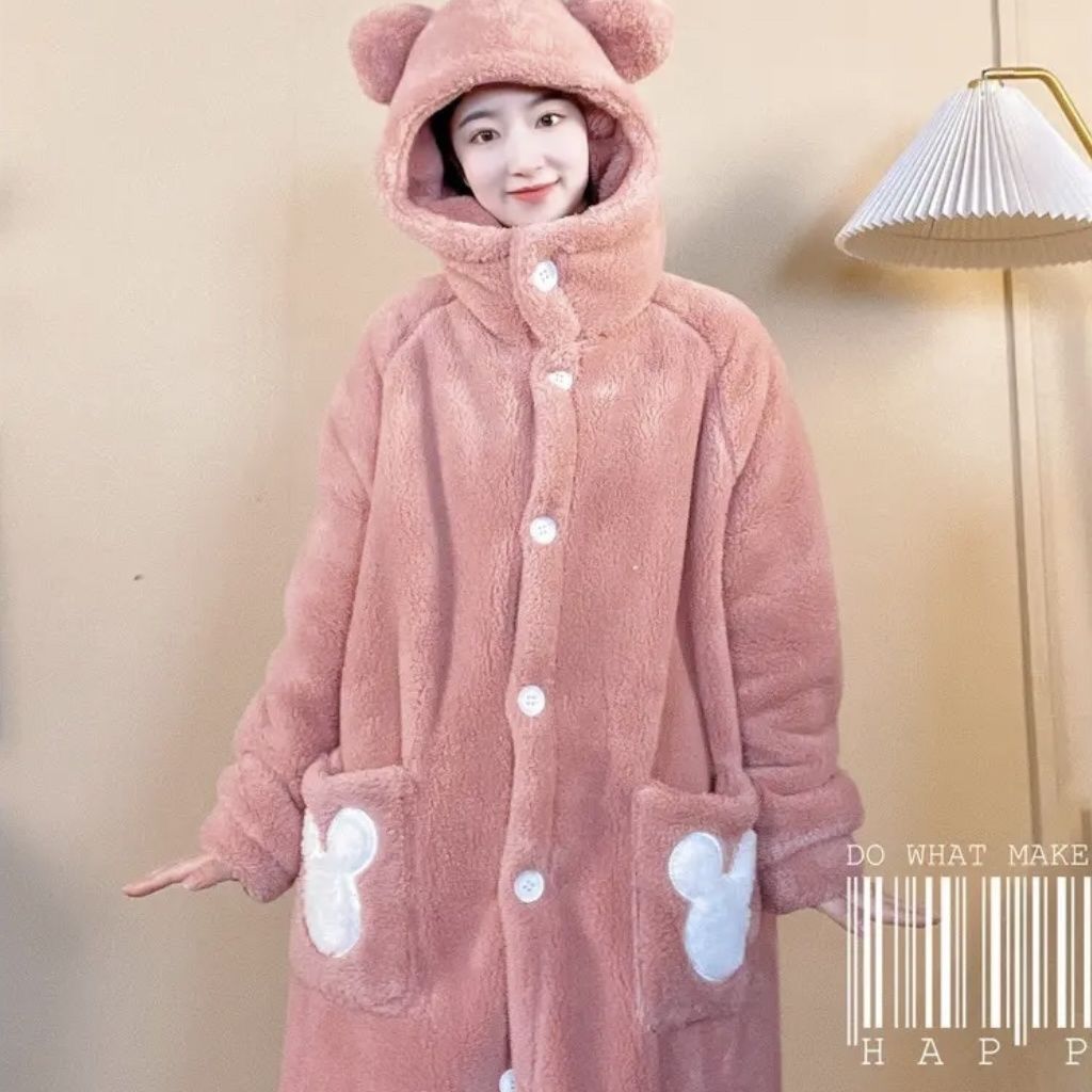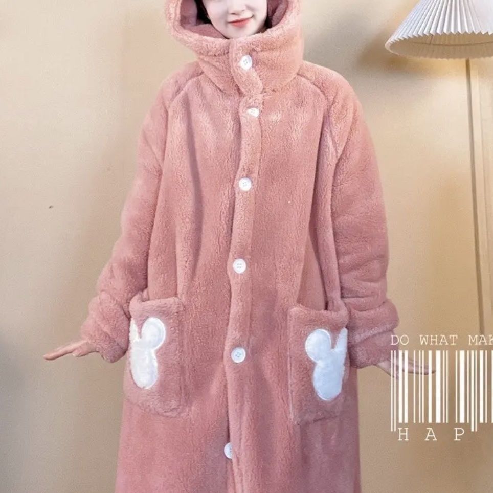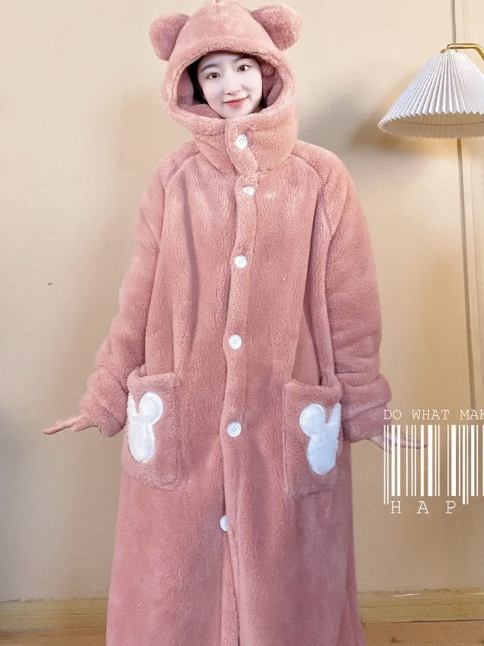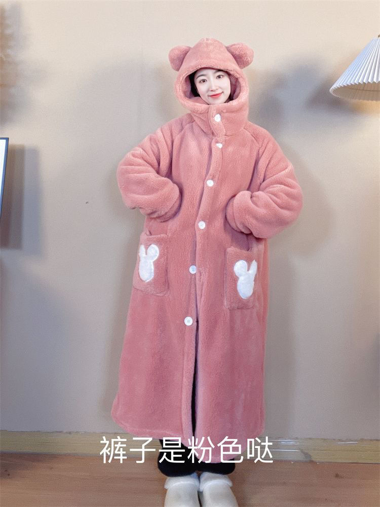 2024 새로운 산호 양털 파자마 여성의 가을과 겨울 두꺼운 따뜻한 긴 후드 귀여운 만화 홈 의류 외부 착용