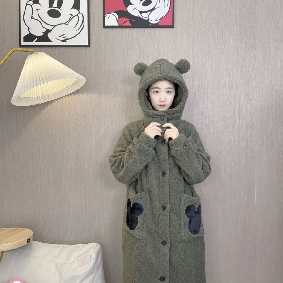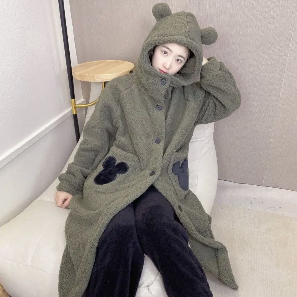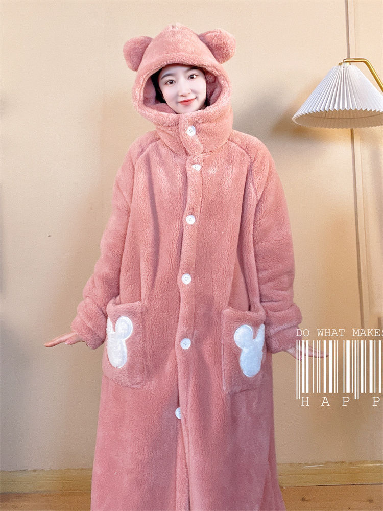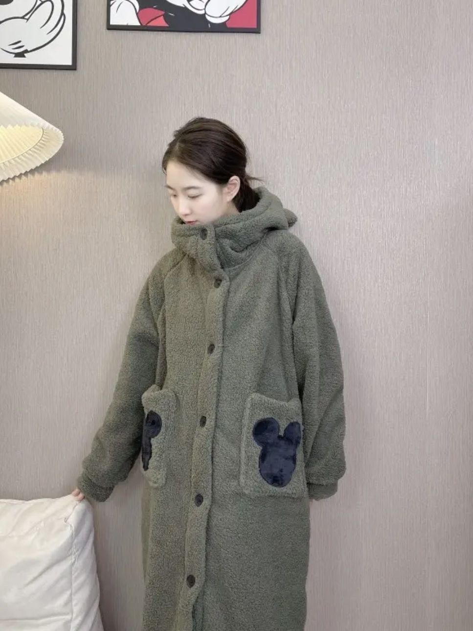 2024 새로운 산호 양털 파자마 여성의 가을과 겨울 두꺼운 따뜻한 긴 후드 귀여운 만화 홈 의류 외부 착용