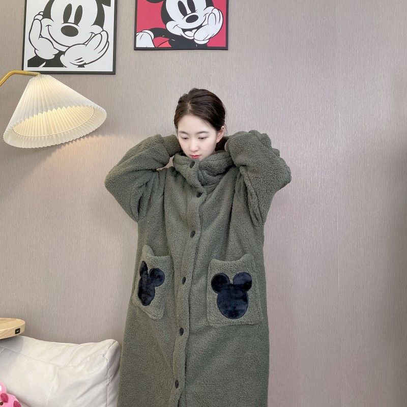 2024 새로운 산호 양털 파자마 여성의 가을과 겨울 두꺼운 따뜻한 긴 후드 귀여운 만화 홈 의류 외부 착용스토어 가기