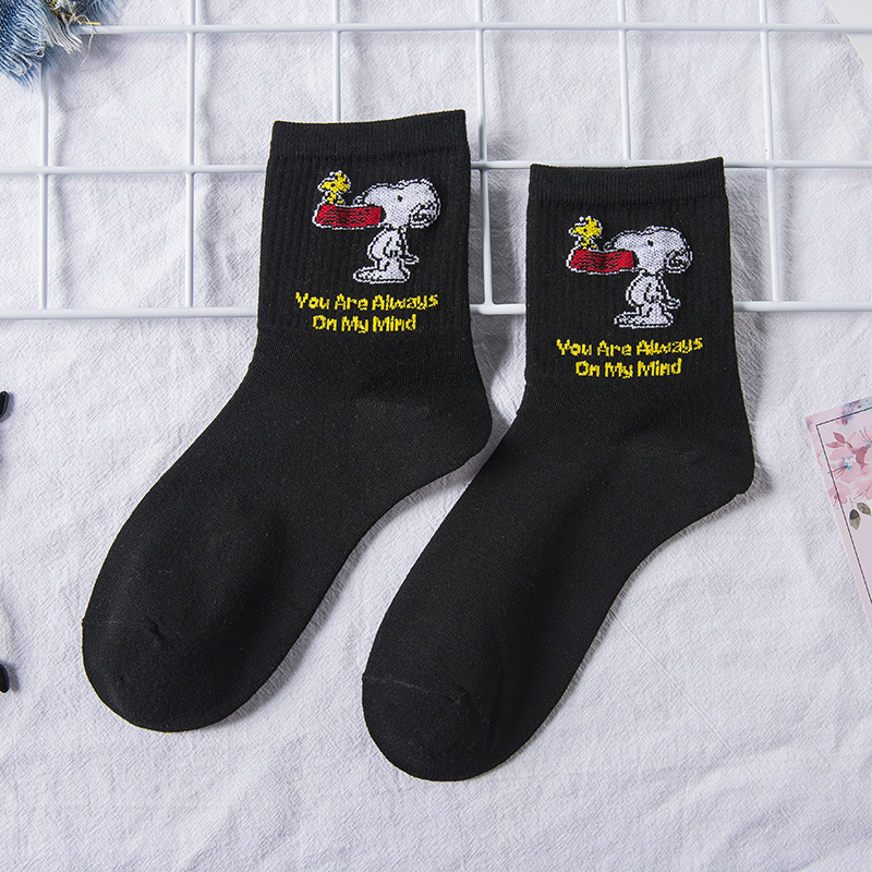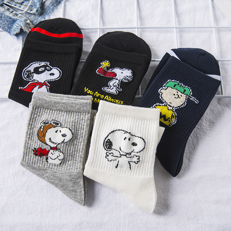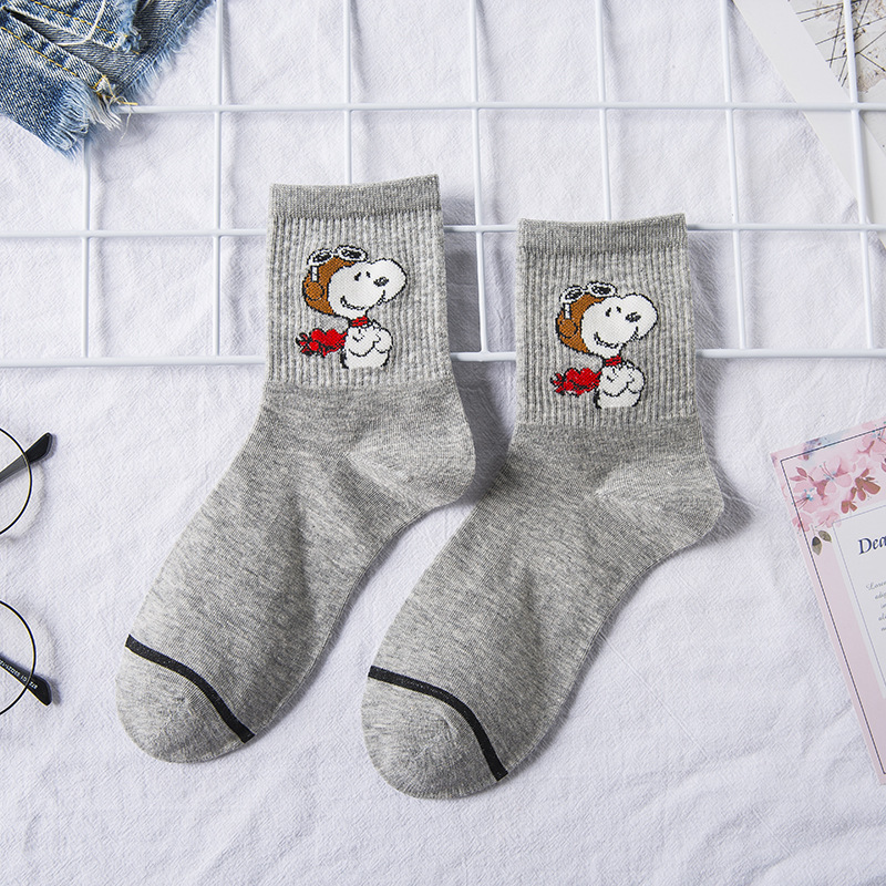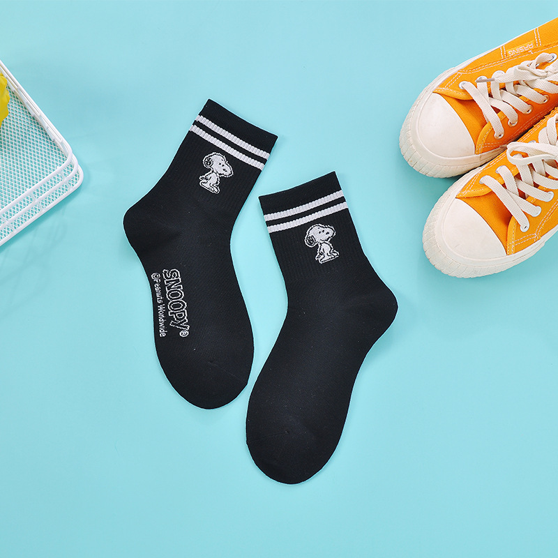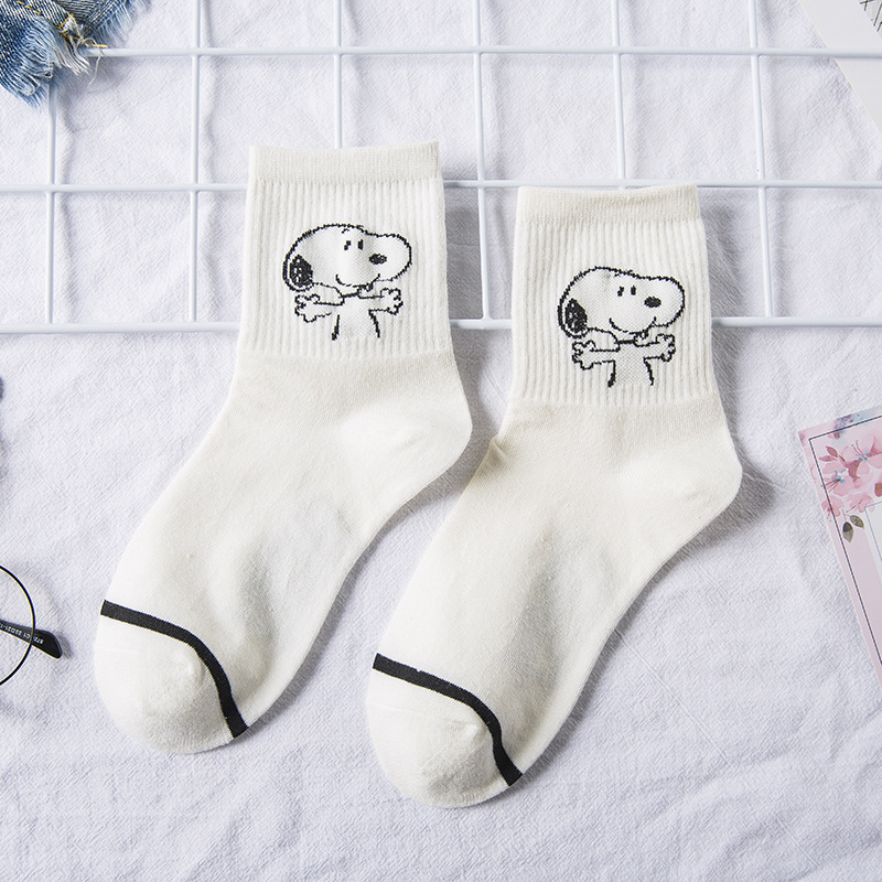 양말 여성의 가을과 겨울 새로운 귀여운 만화 스누피 중간 길이의 양말 땀 흡수성 2 바 코튼 양말 스타킹