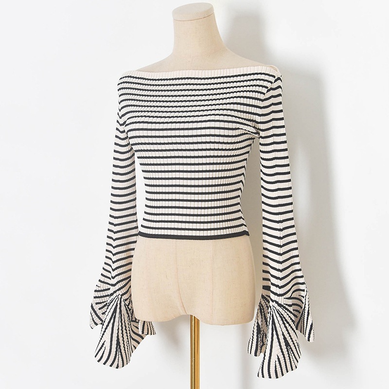 Z4215 새로운 가을 스타일 스트라이프 원라인 칼라 오프 숄더 벨 슬리브 맞춤형 니트 스웨터 풀오버 여성용 이너 레이어드 셔츠스토어 가기