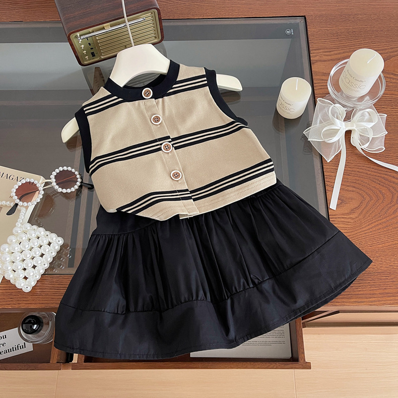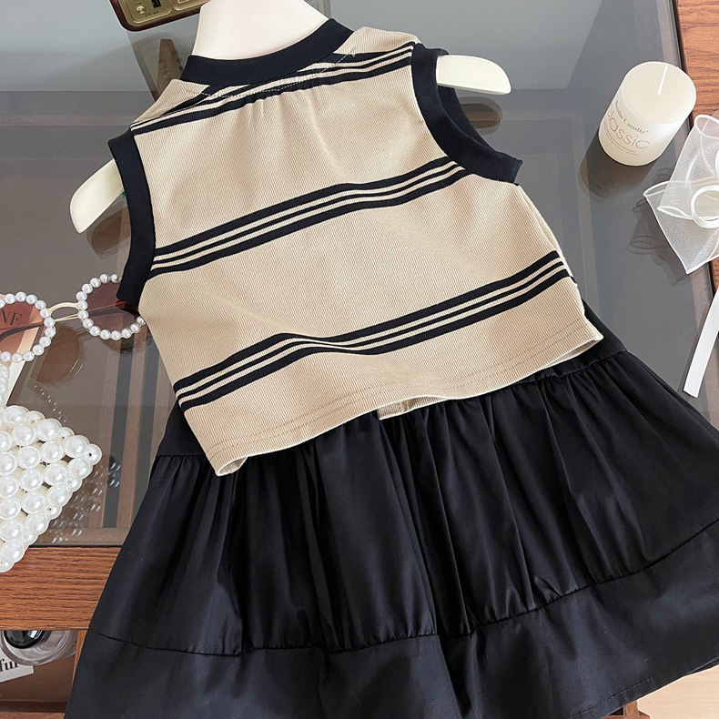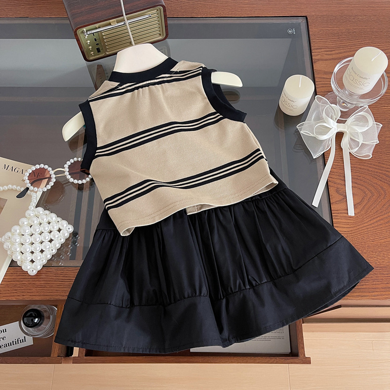 2024 여름 소녀의 니트 민소매 블랙 원피스 세트 아기 소녀의 스트라이프 탑 스티치 스커트 투피스 세트스토어 가기