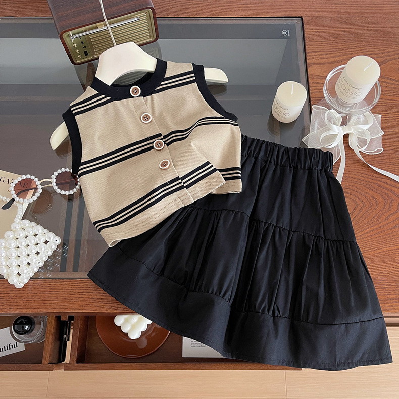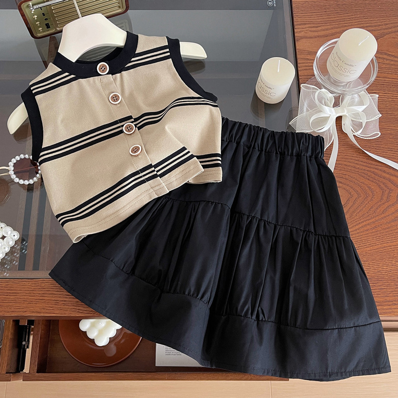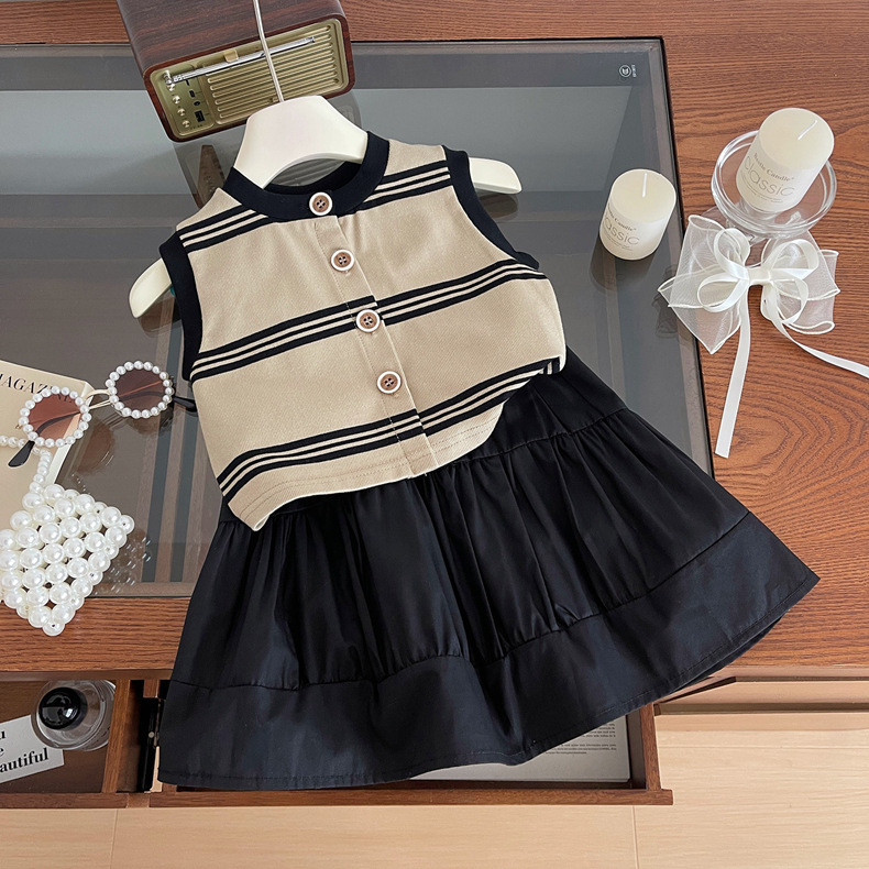 2024 여름 소녀의 니트 민소매 블랙 원피스 세트 아기 소녀의 스트라이프 탑 스티치 스커트 투피스 세트