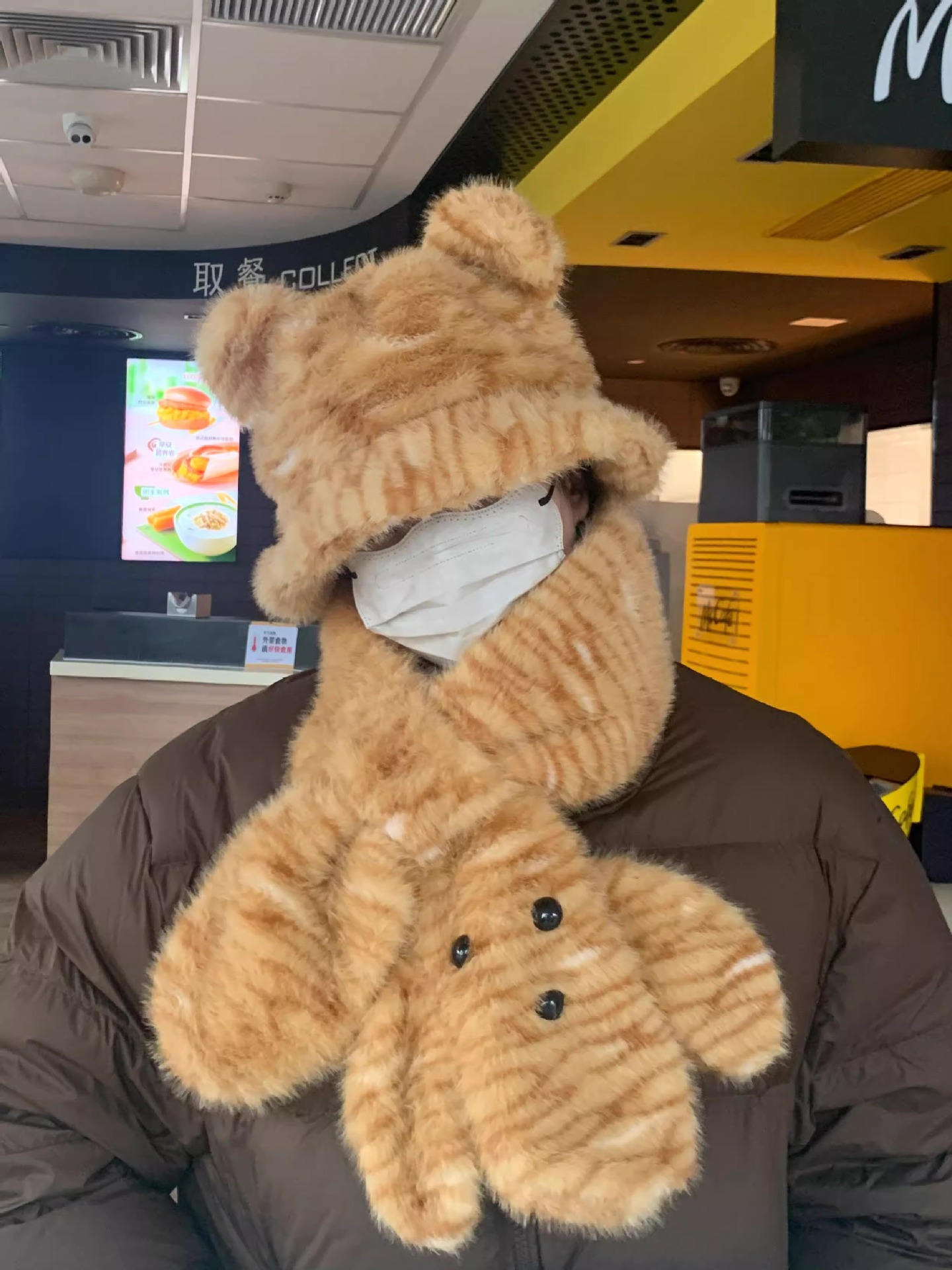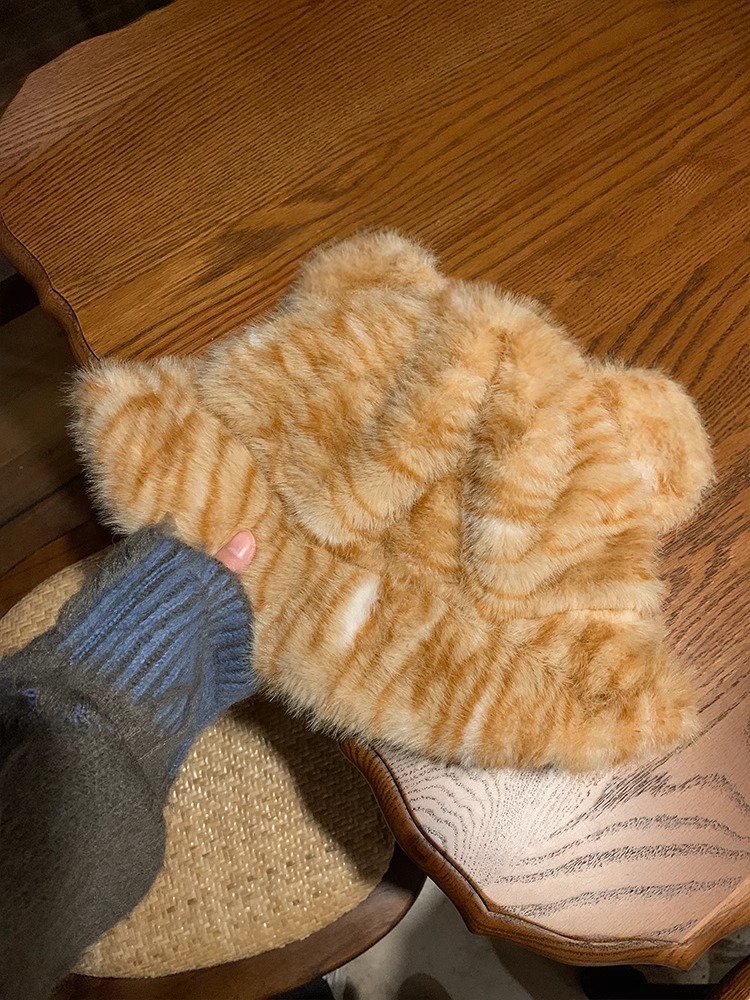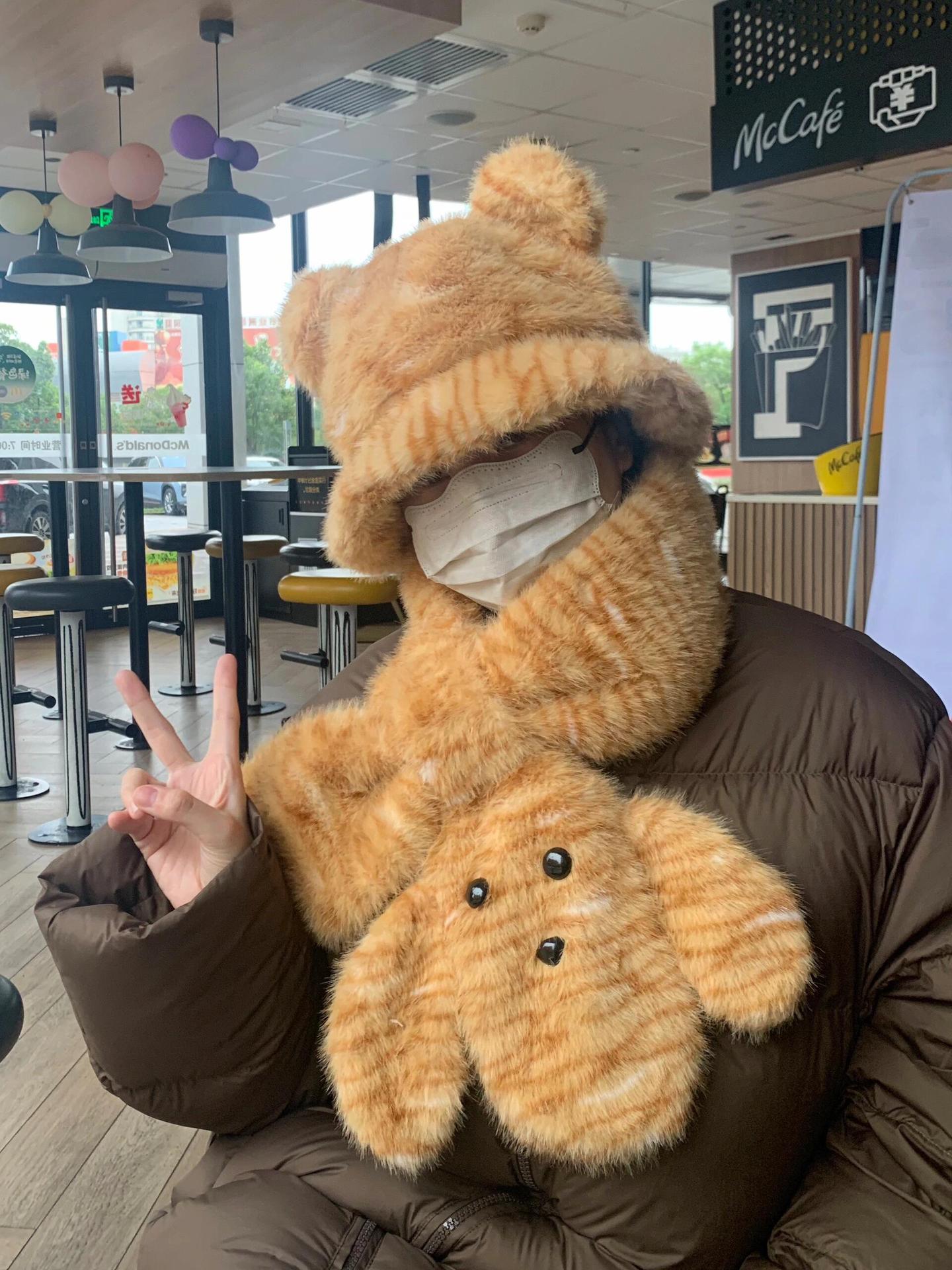 가을과 겨울 여성의 귀여운 작은 호랑이 귀 봉제 어부 모자 목 감기 여행 따뜻한 만화 스카프스토어 가기