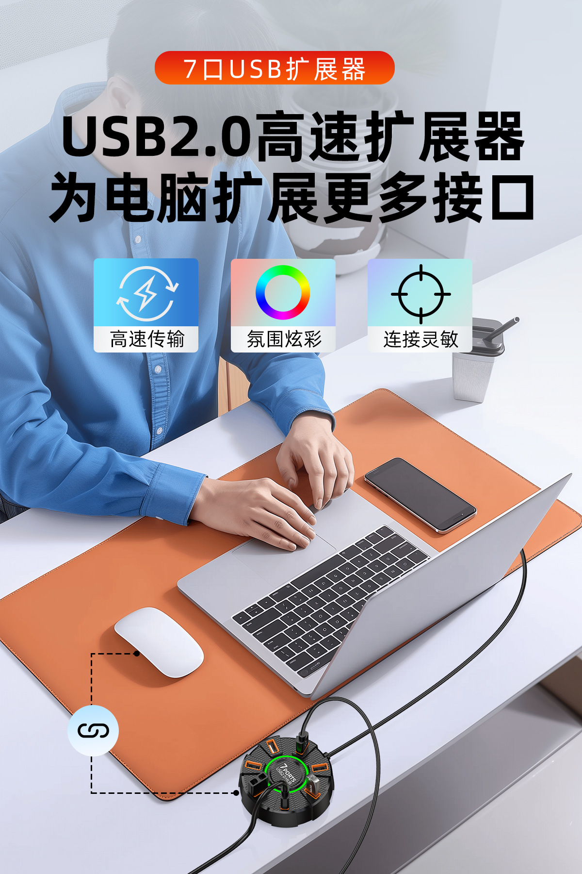 다채로운 주변 조명 고속 7포트 2.0 허브 1-7포트 도킹 스테이션은 외부 전원 공급 장치로 연결 가능