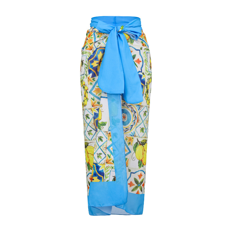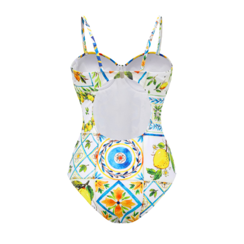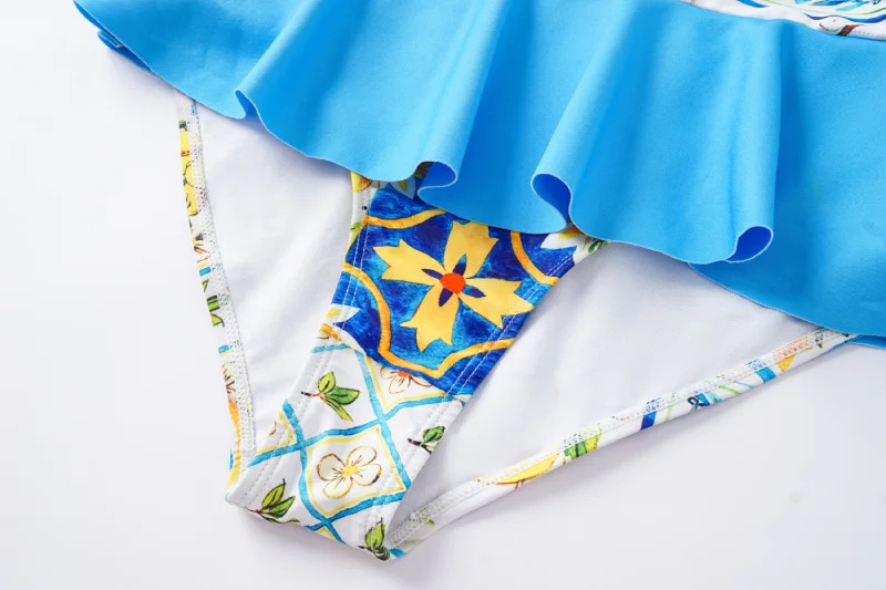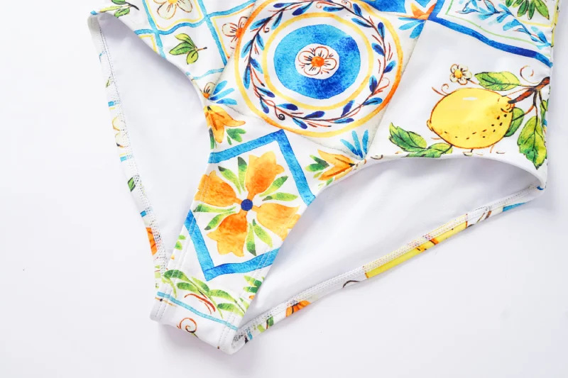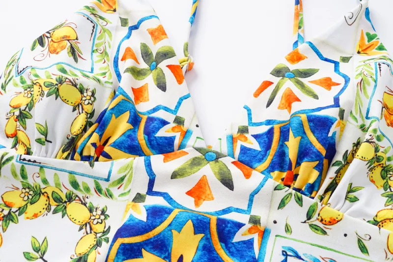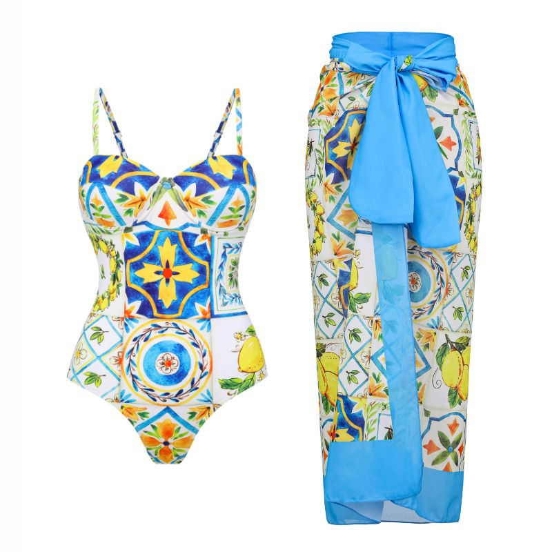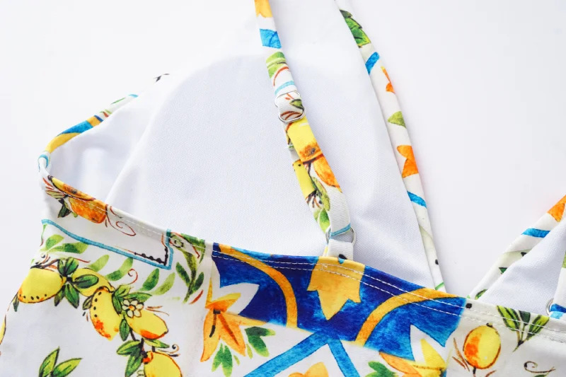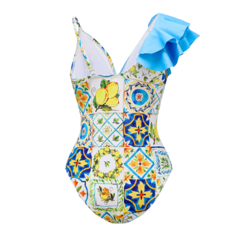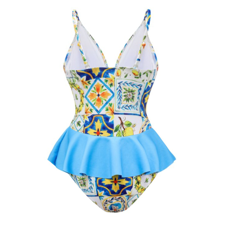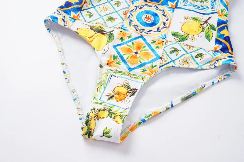 2024 유럽과 미국의 폭발 수영복 여성용 V-넥 러플 스커트 레몬 프린트 점프 수트 포장 스커트 커버 2383