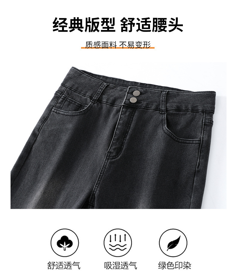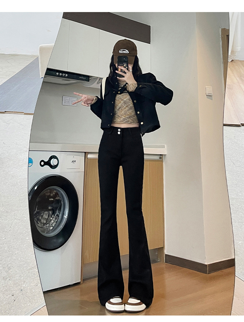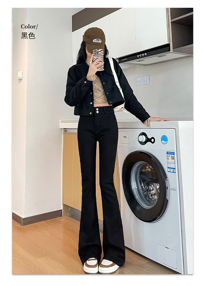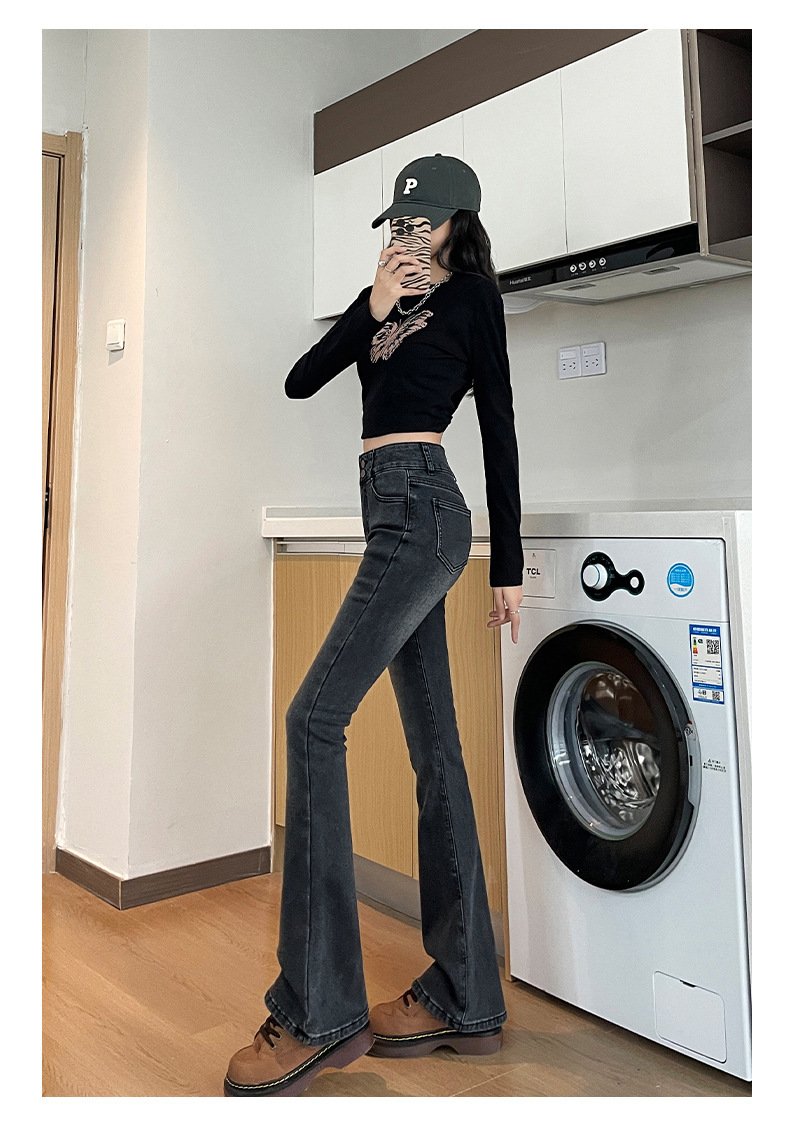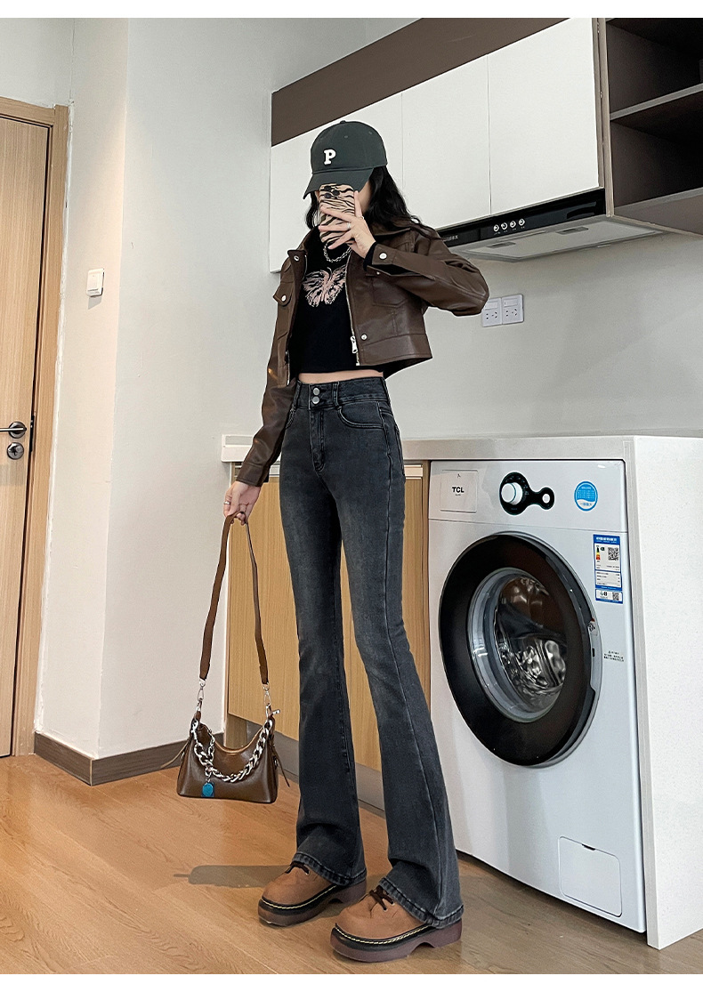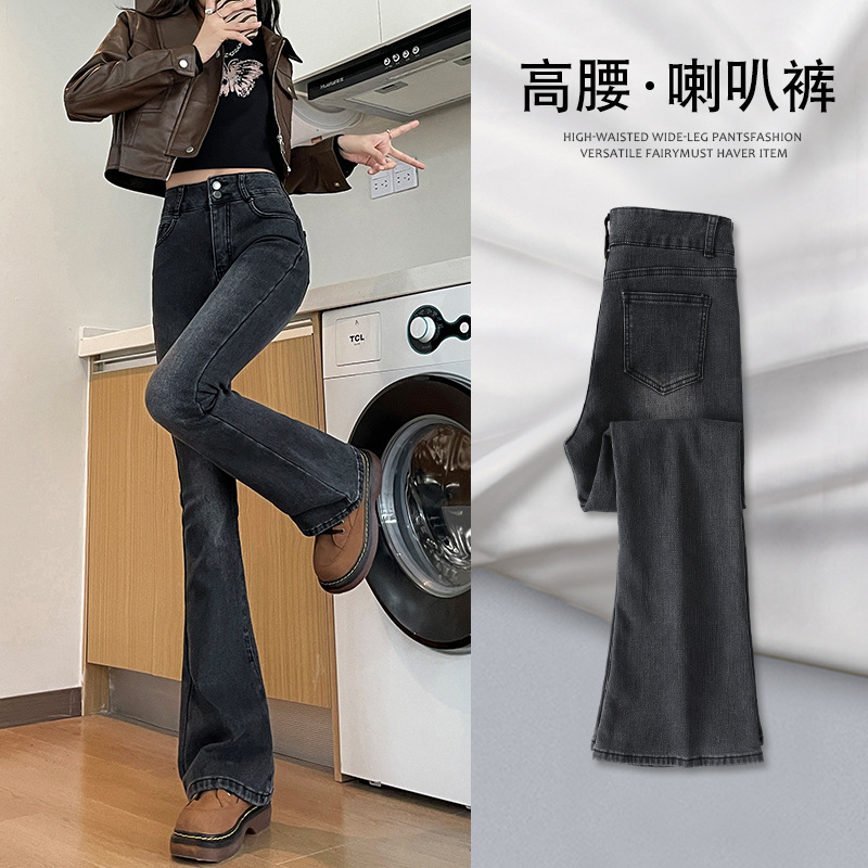 기모 플레어 팬츠 여성의 새로운 가을과 겨울 작은 검은 회색 높은 허리 슬리밍 두꺼운 더블 버클 마이크로 데님 바지스토어 가기