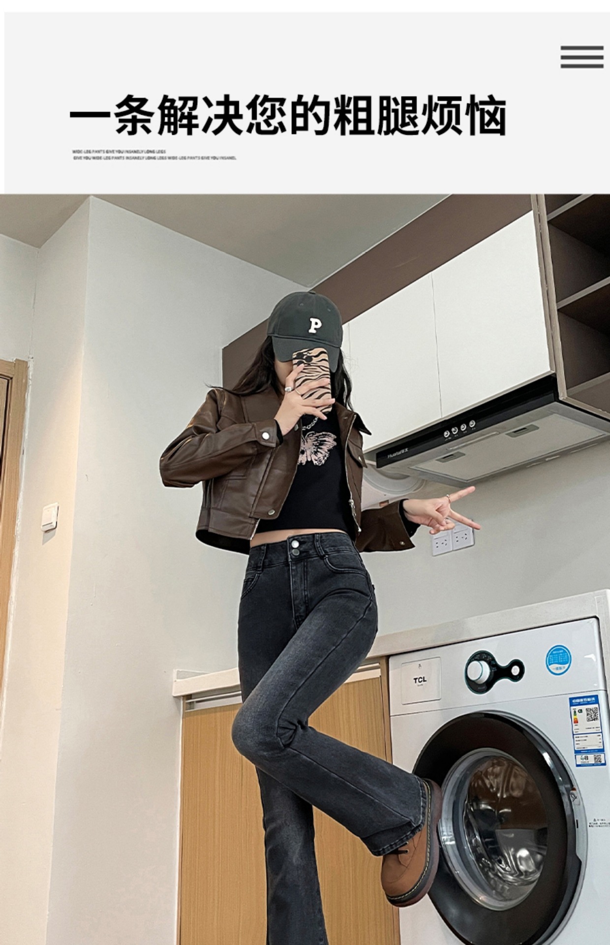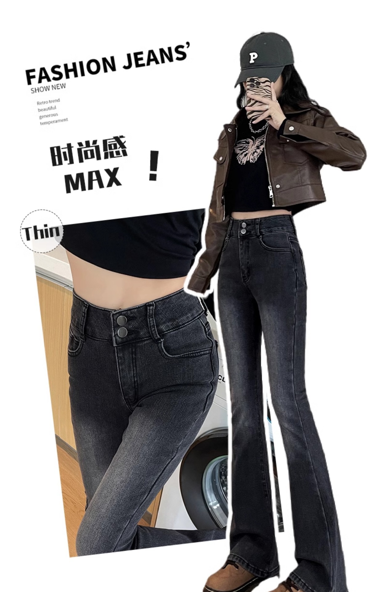 기모 플레어 팬츠 여성의 새로운 가을과 겨울 작은 검은 회색 높은 허리 슬리밍 두꺼운 더블 버클 마이크로 데님 바지