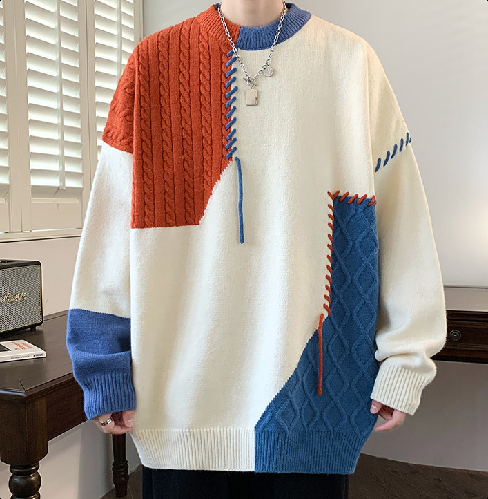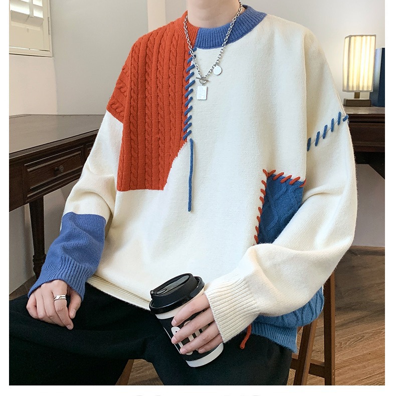 가을과 겨울 하이 스트리트 대조 컬러 크루 넥 스웨터 남성 디자인 센스 스티칭 탑 패션 캐주얼 올 매치 스웨터 Ins 트렌디스토어 가기