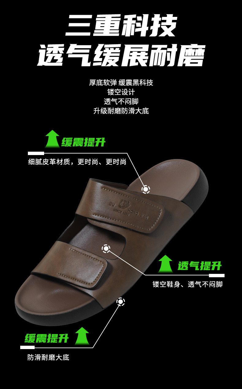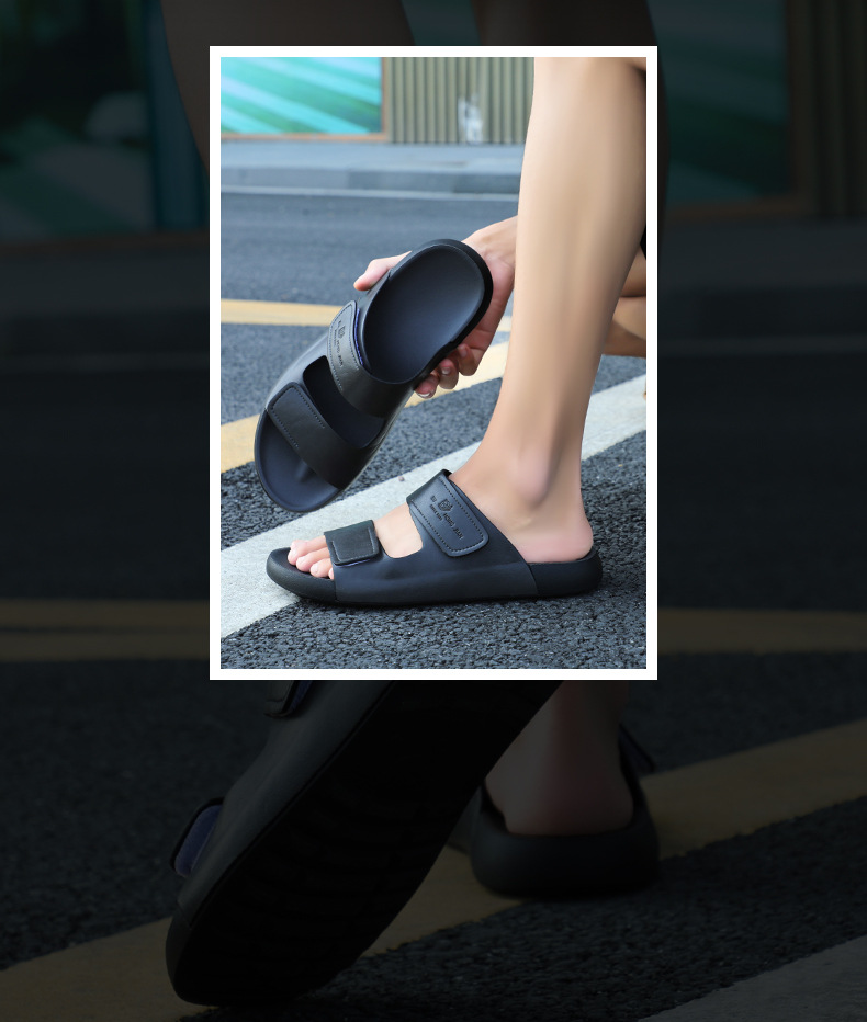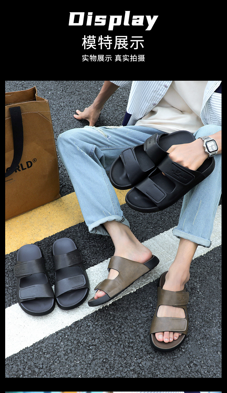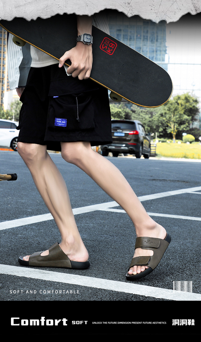 가죽 슬리퍼 남자 여름 외부 착용 한국 스타일 스포츠 슬라이드 홈 실내 두꺼운 하단 벨크로 남성용 샌들스토어 가기