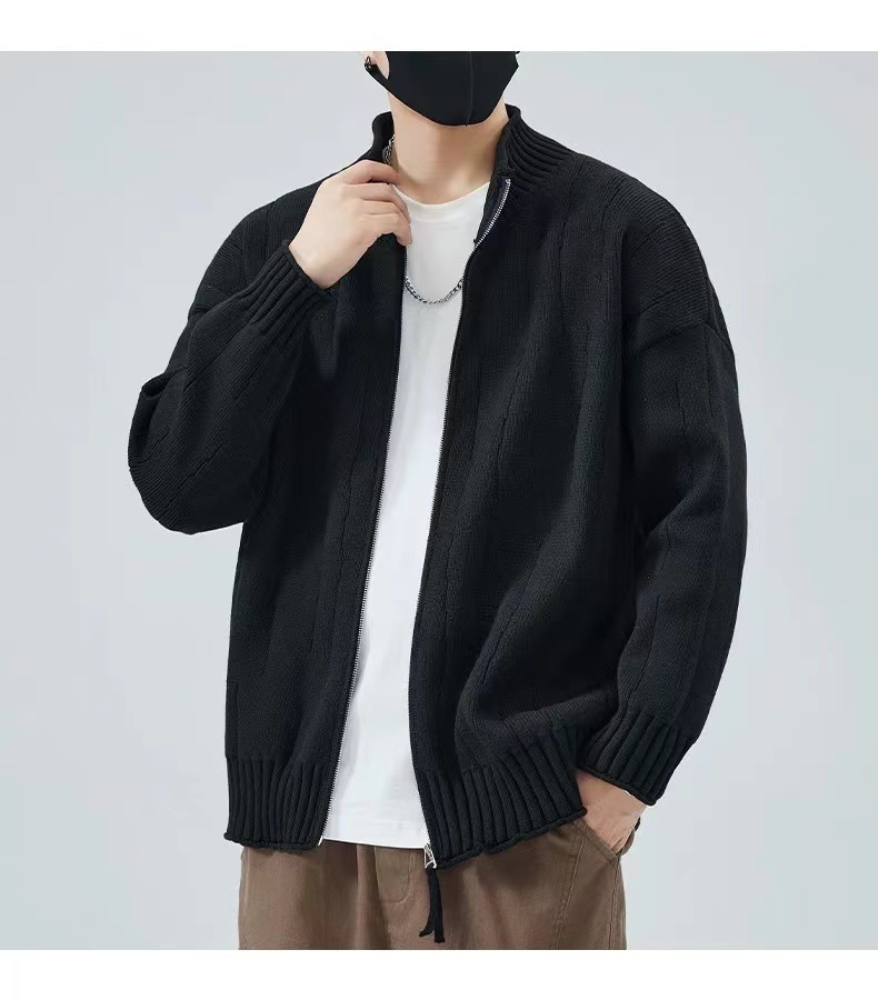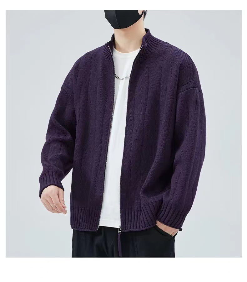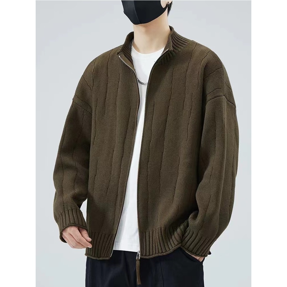 2024 년 새로운 가을과 겨울 수직 칼라 솔리드 컬러 니트 지퍼 카디건 남성 외부 착용 아메리칸 스타일 하이 엔드 루즈 스웨터 재킷