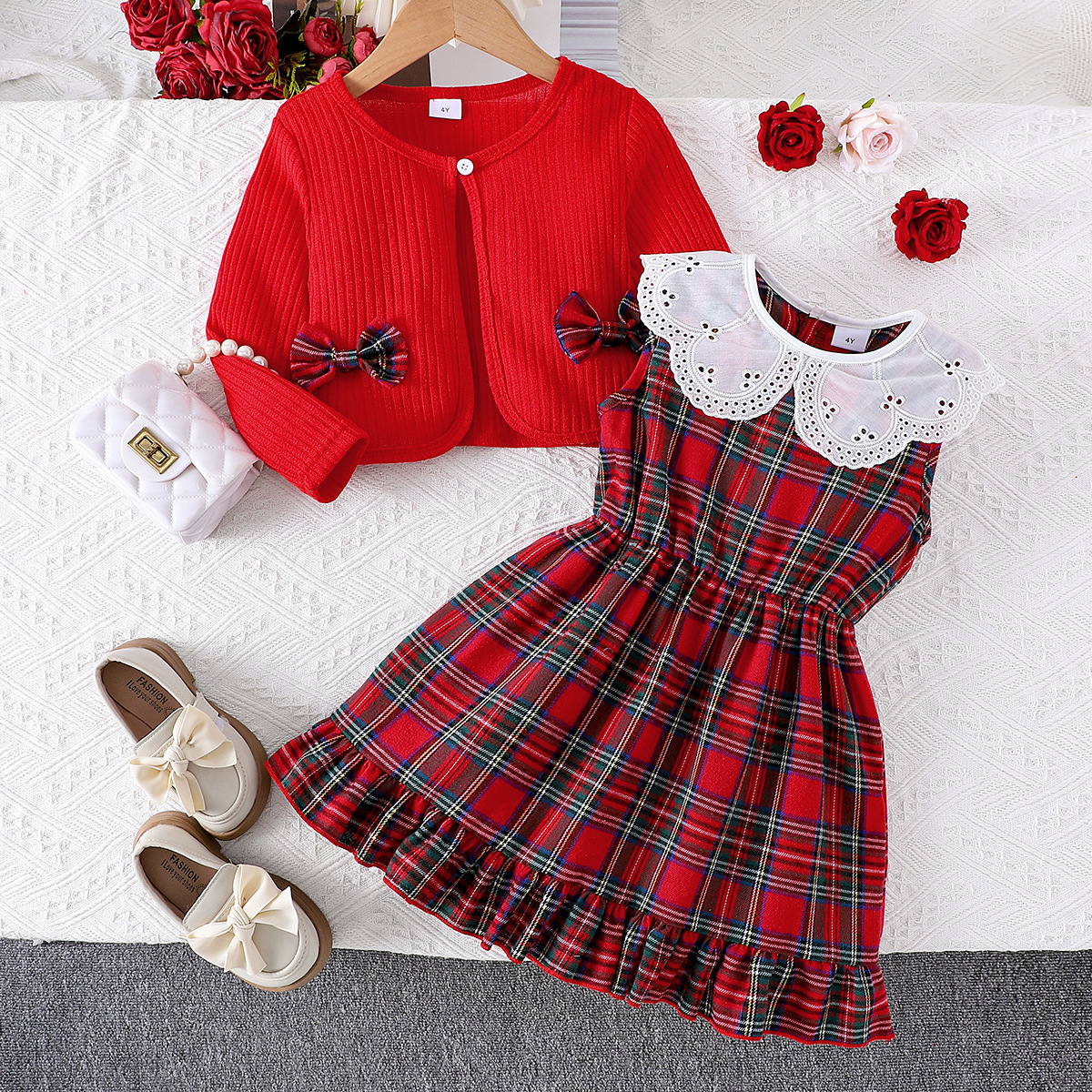 2024 국경을 넘는 유럽과 미국 봄과 가을 소녀 구덩이 단색 긴 소매 활 코트 레이스 체크 무늬 원피스 세트