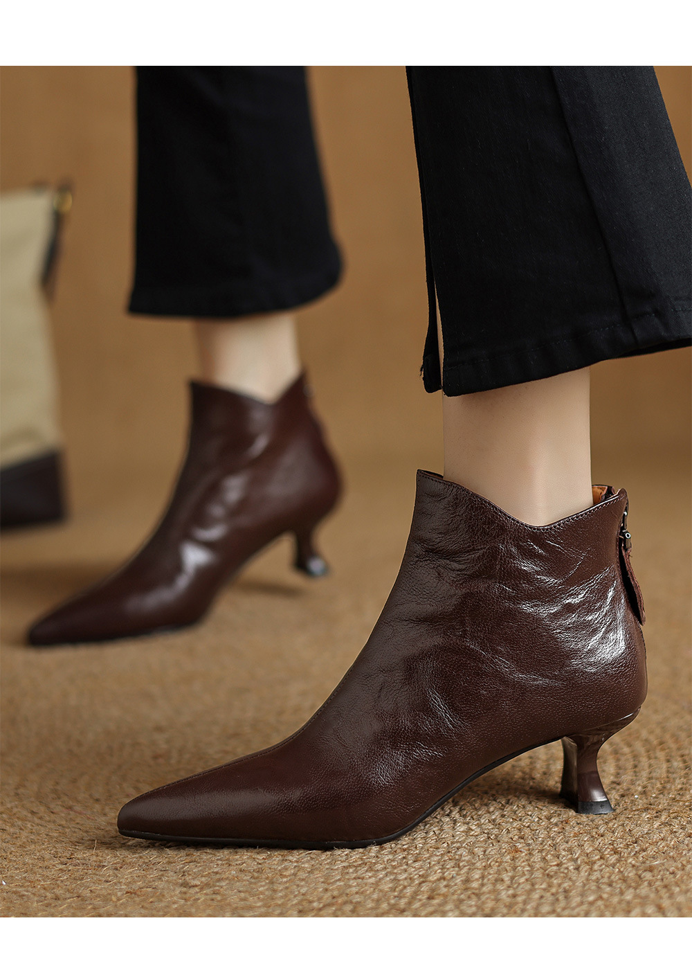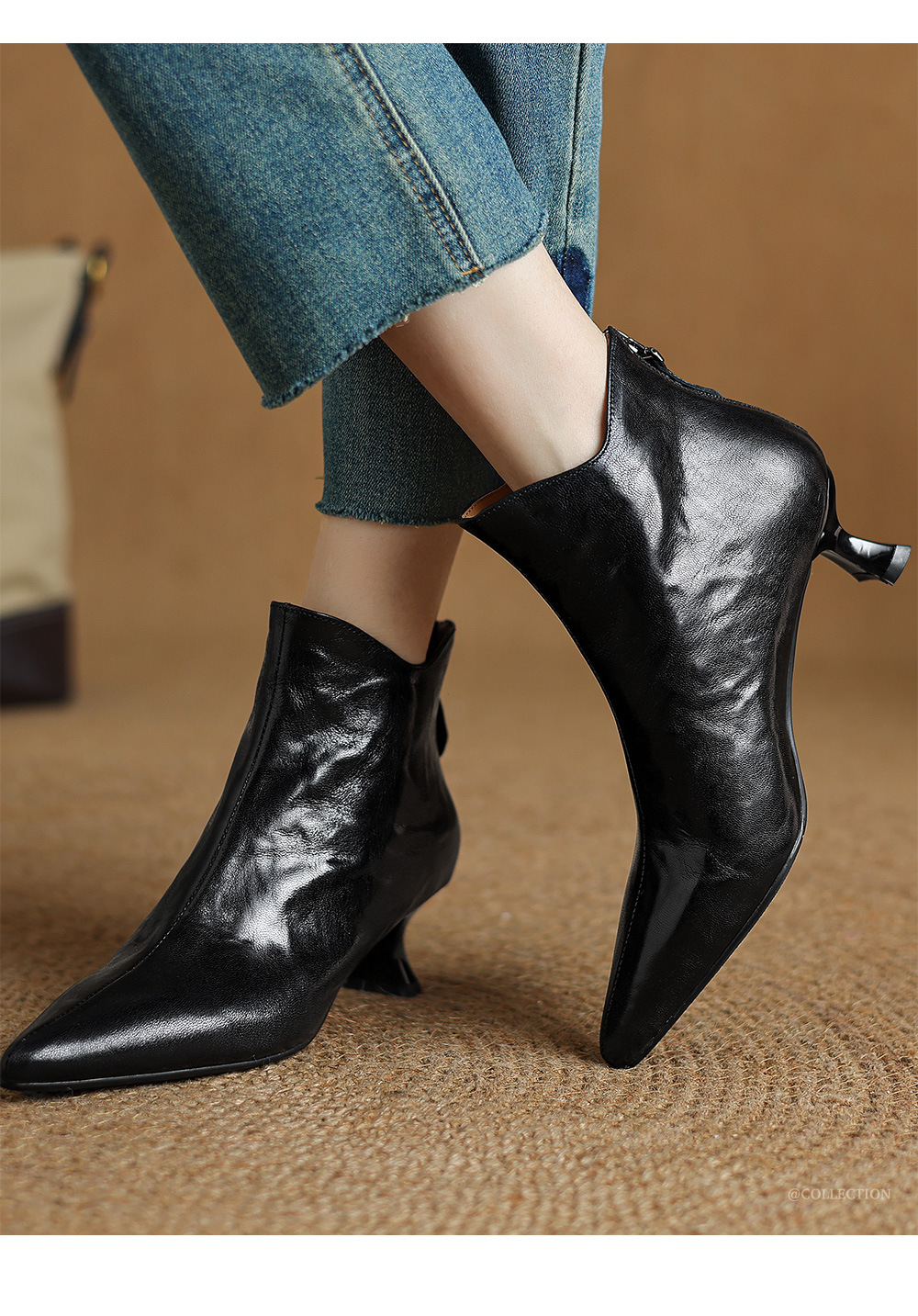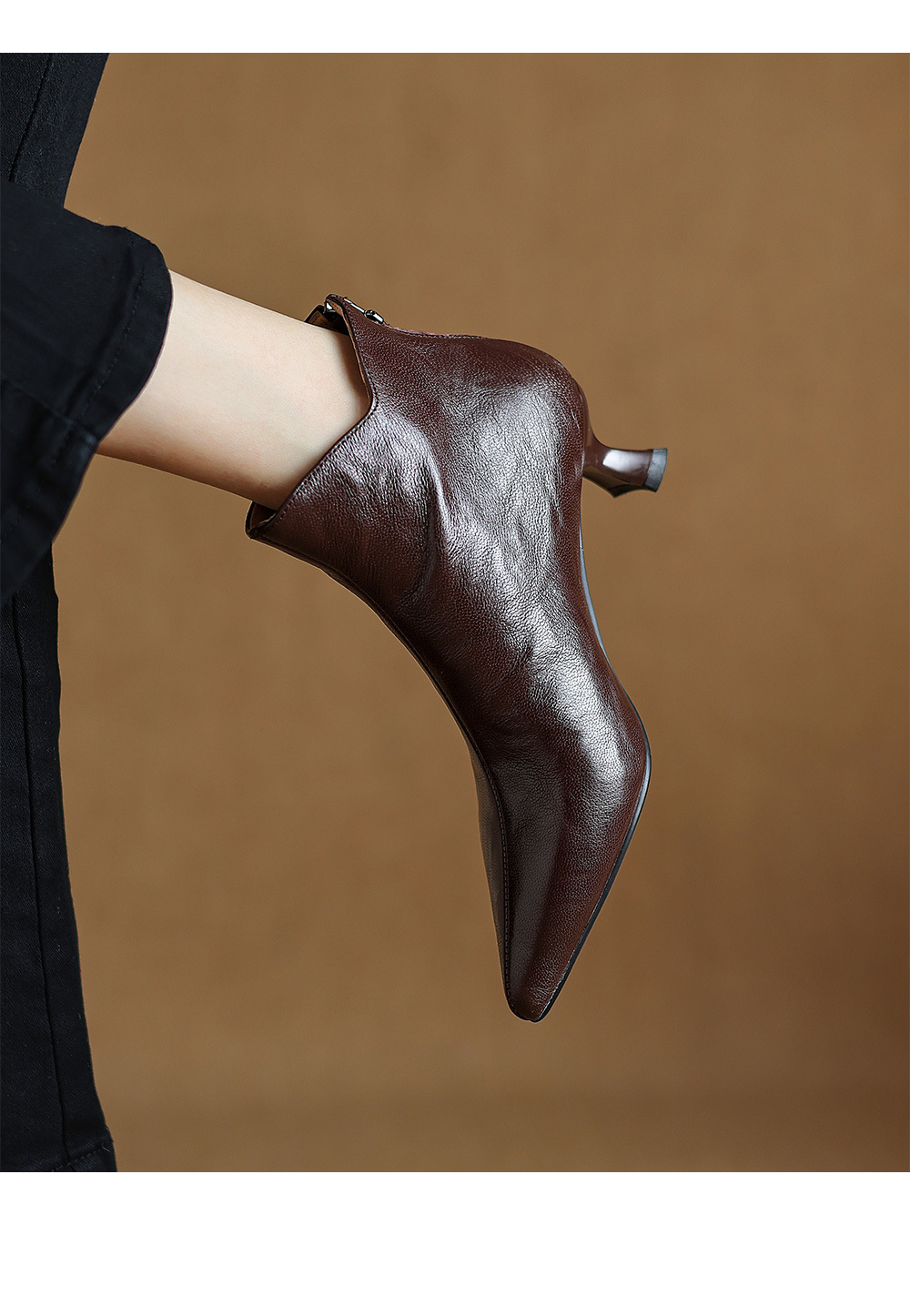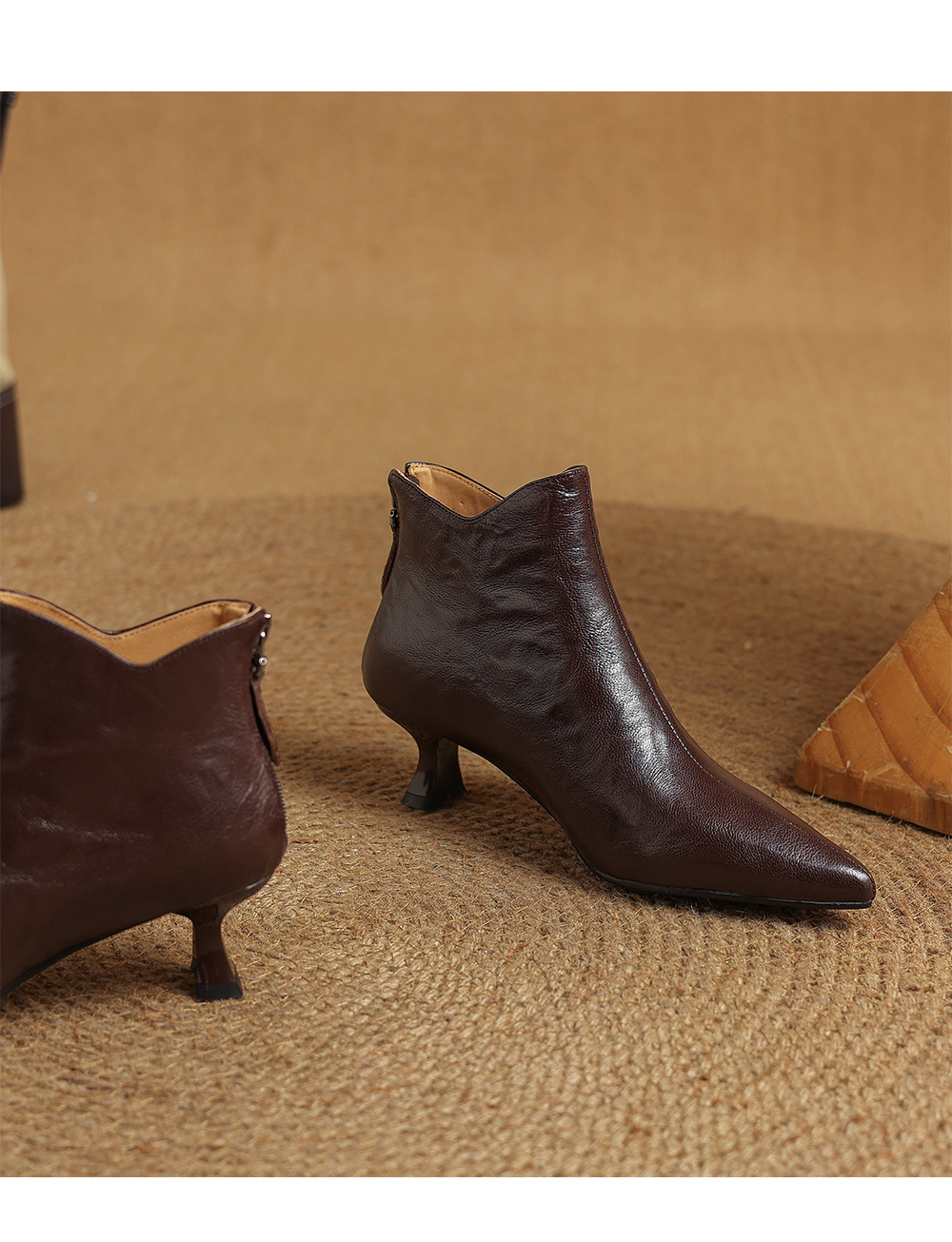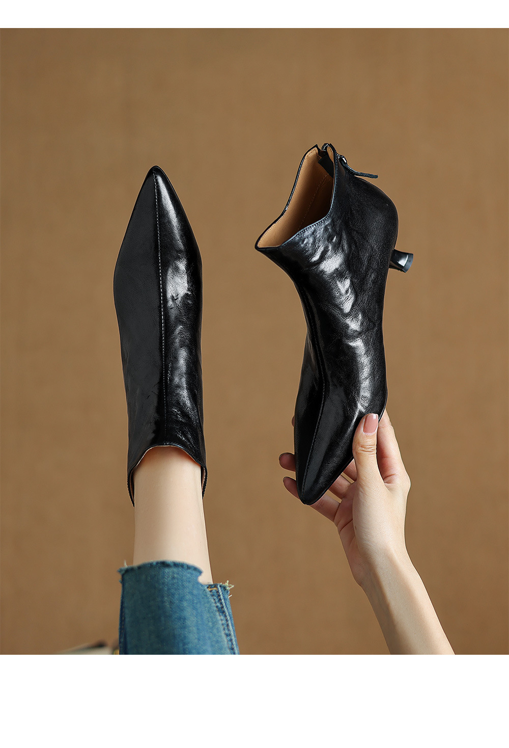 프랑스 스타일 부드러운 양가죽 뾰족한 발가락 발목 부츠 여성의 얇은 뒤꿈치 슬리밍 V-입 고양이 뒤꿈치 2024 가을 및 겨울 새로운 발 진열장