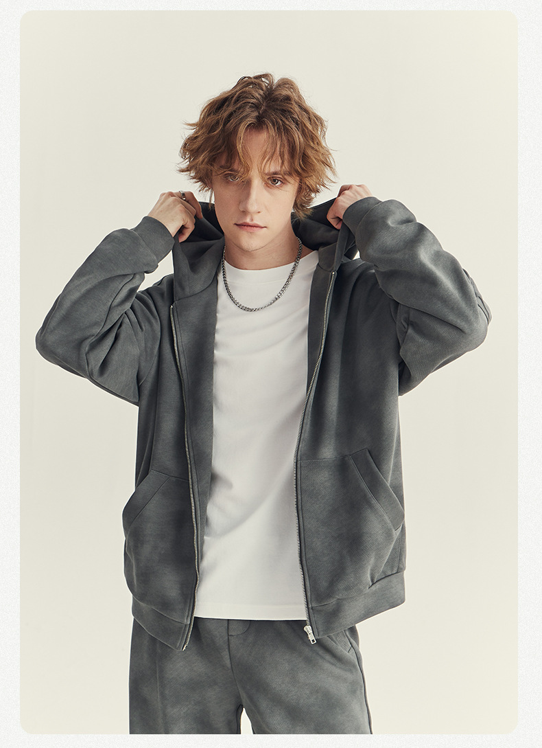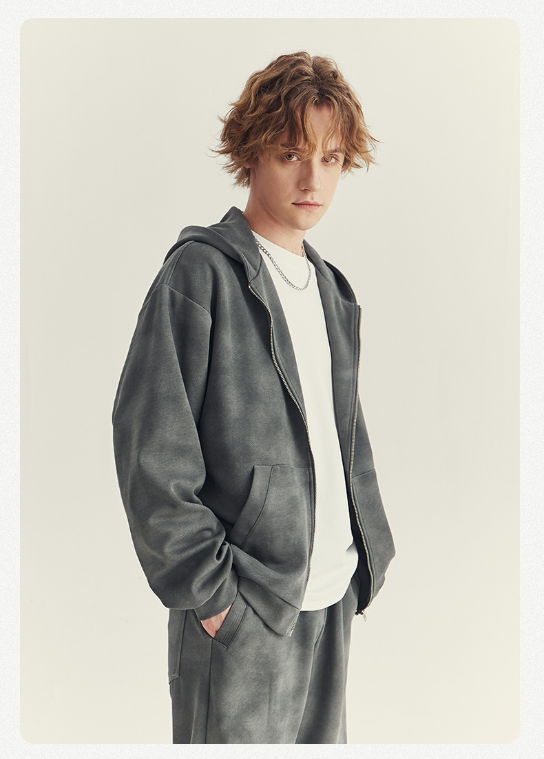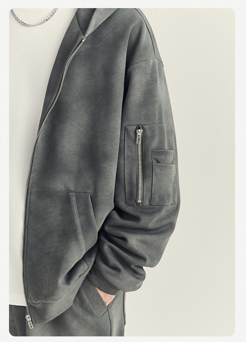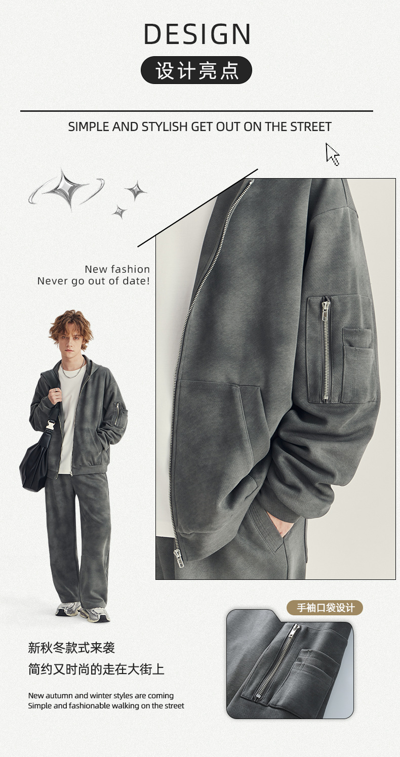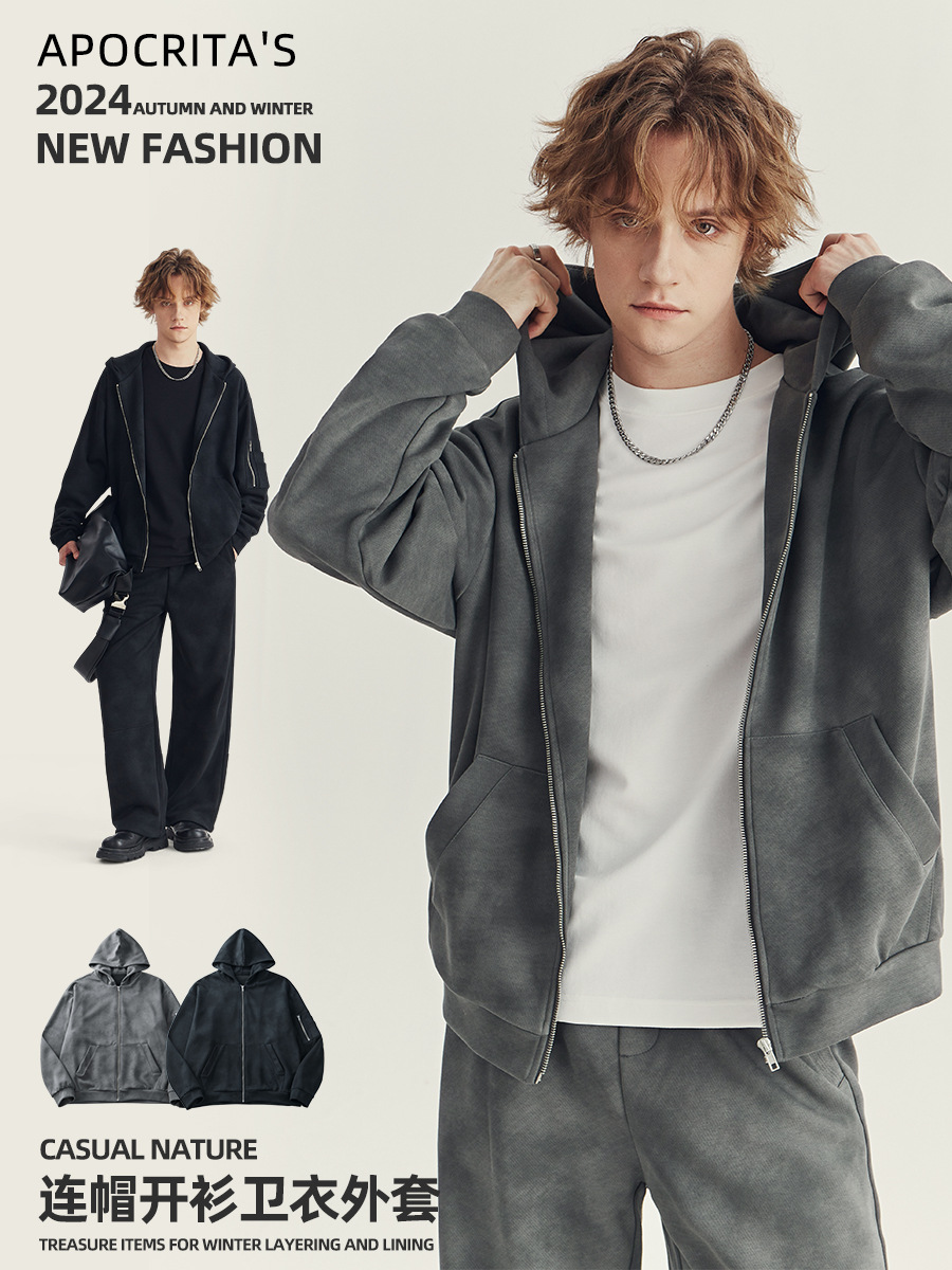 APO 남성복 | 남성복 하이 엔드 가을과 겨울 레트로 올드 루즈 지퍼 헤비 후드 카디건 재킷