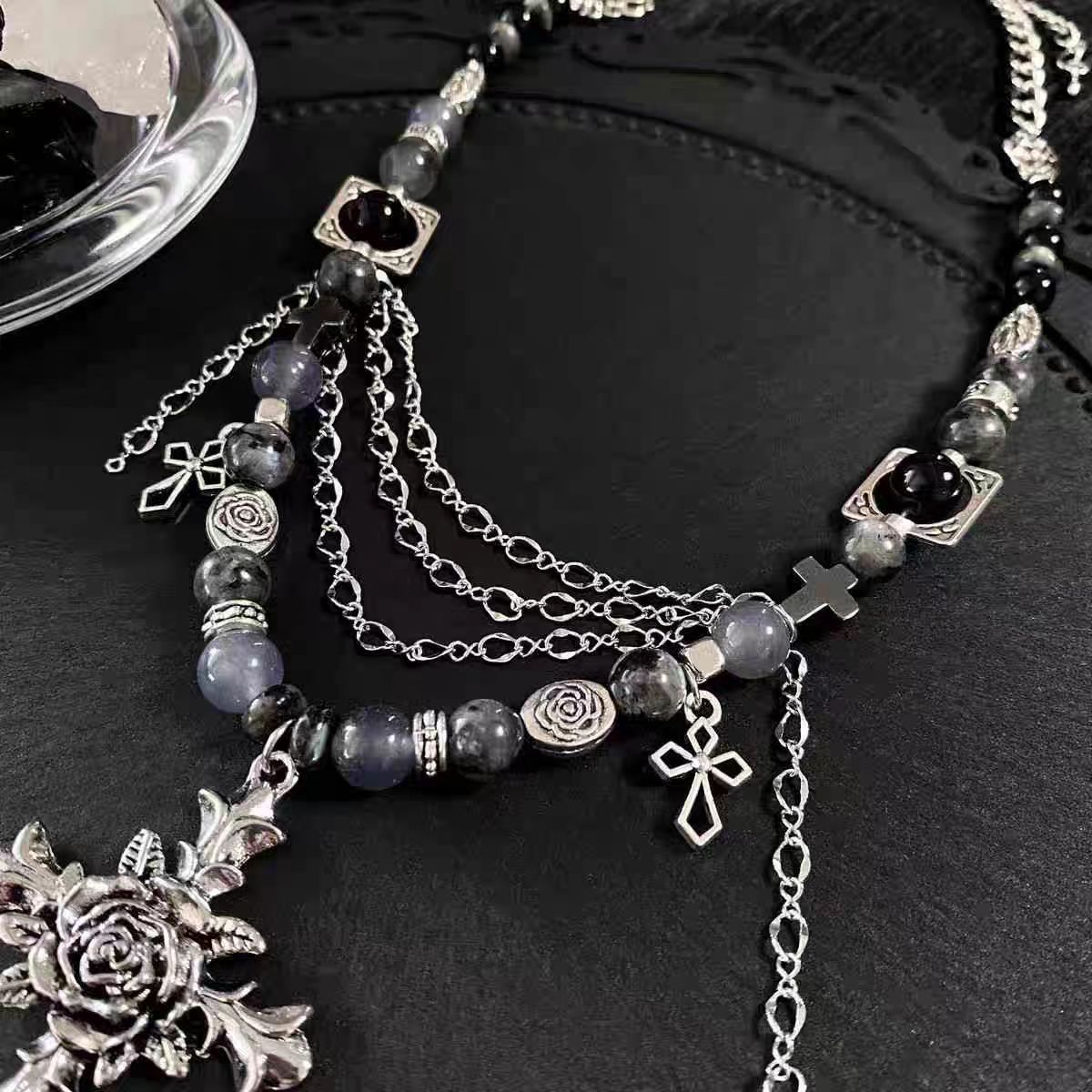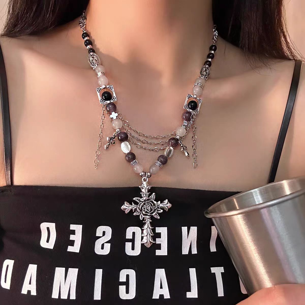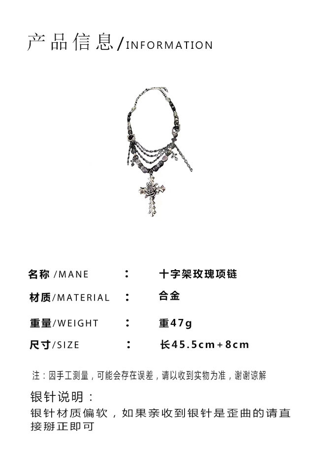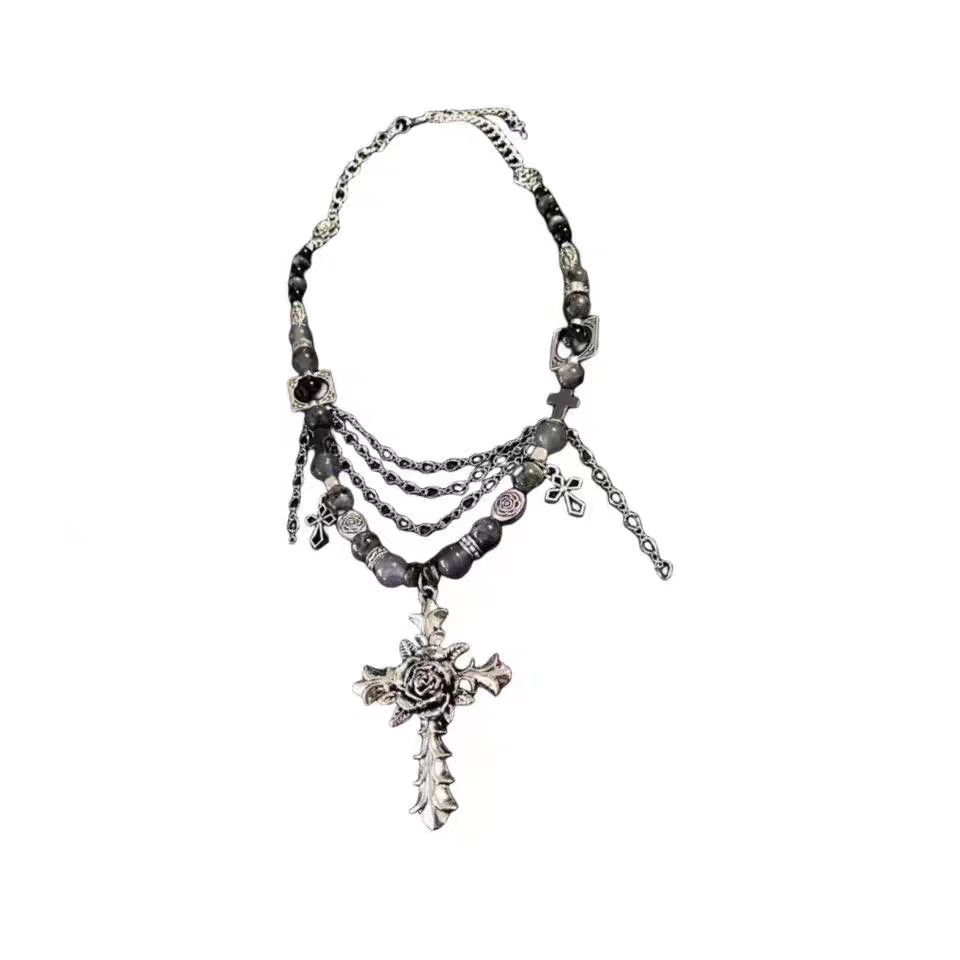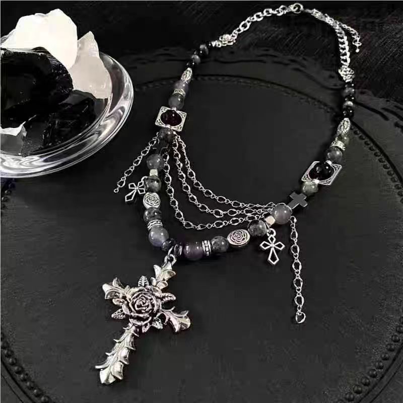 달콤한 쿨 힙합 블랙 실버 비즈 크로스 로즈 목걸이 다크 스타일 간단한 하이 스타일 꽃 펜던트 스웨터 체인스토어 가기