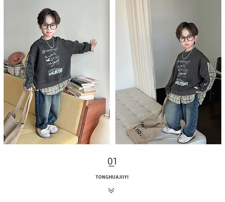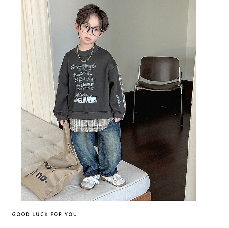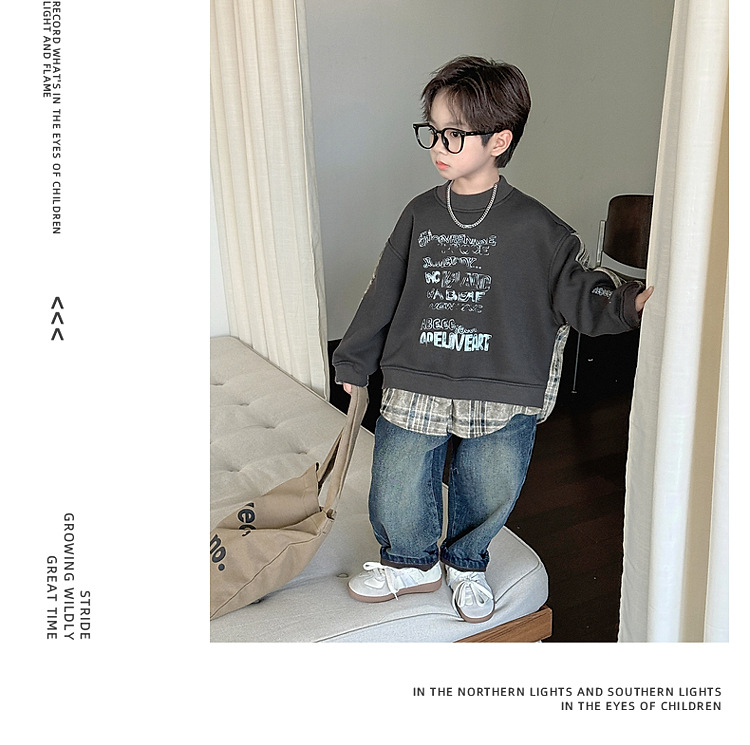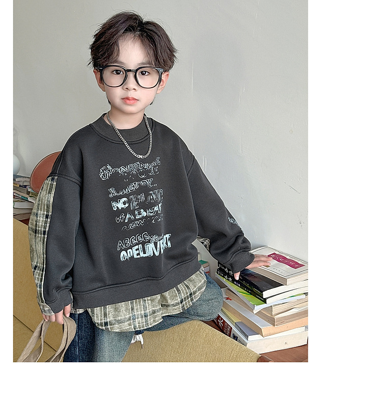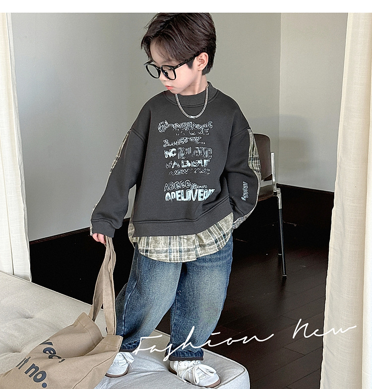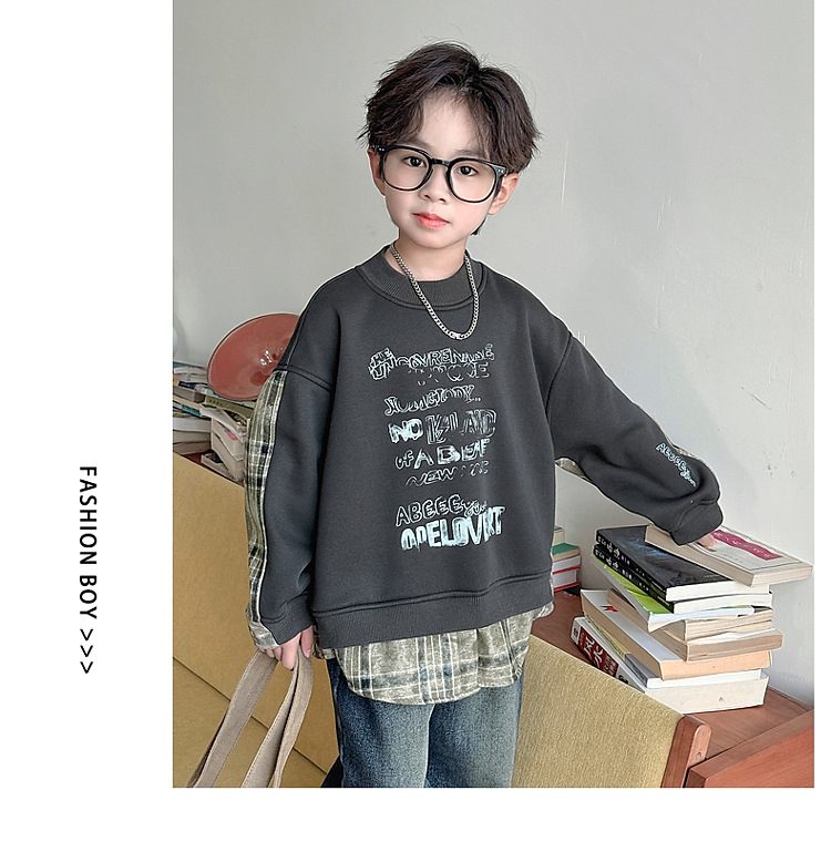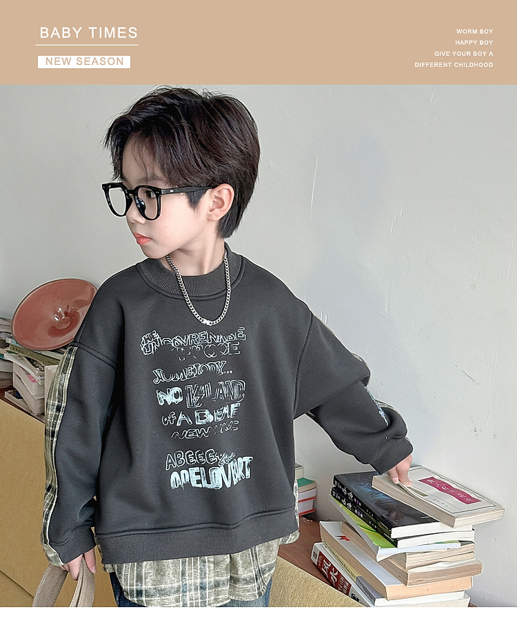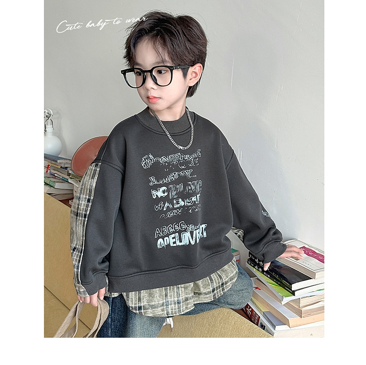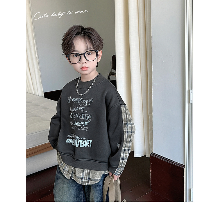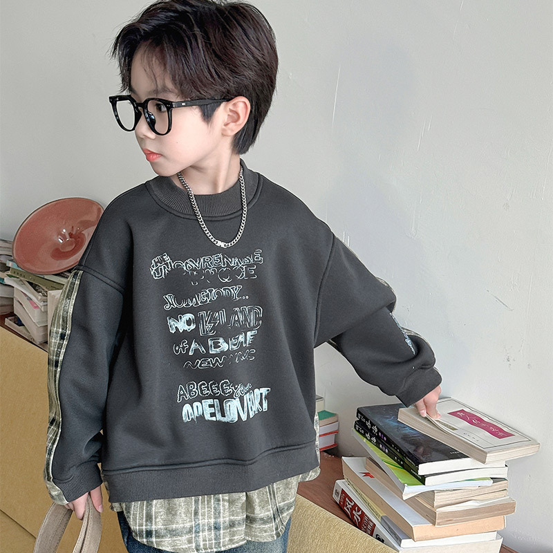소년 스웨터 겨울 2024 새로운 어린이 가을과 겨울 소년들은 원피스 벨벳 둥근 목 따뜻한 긴 소매 탑을 두껍게 만들었습니다.스토어 가기