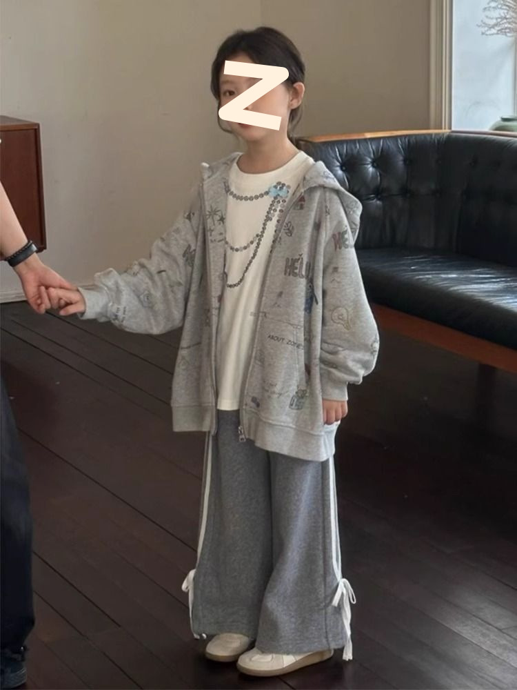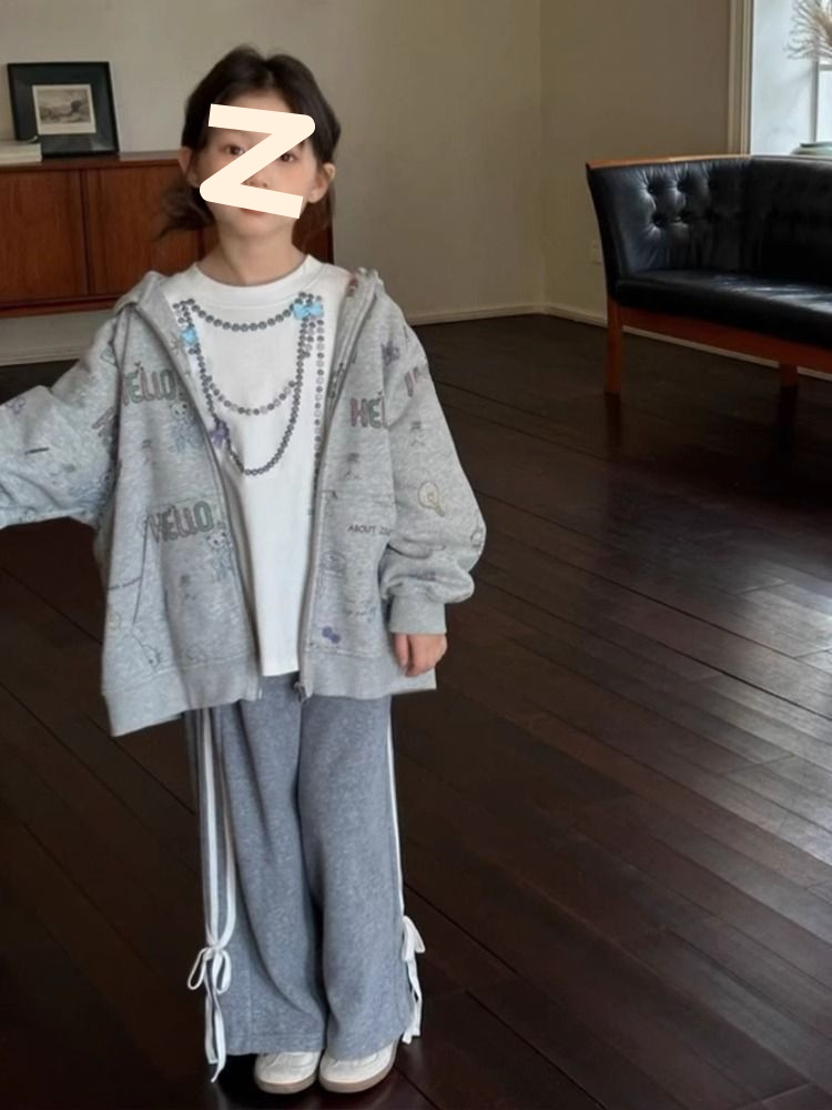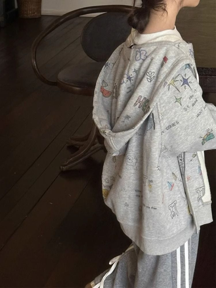 소녀 가을 후드 한국 스타일 코트 2024 새로운 스타일 유행 만화 지퍼 인쇄 탑 카디건