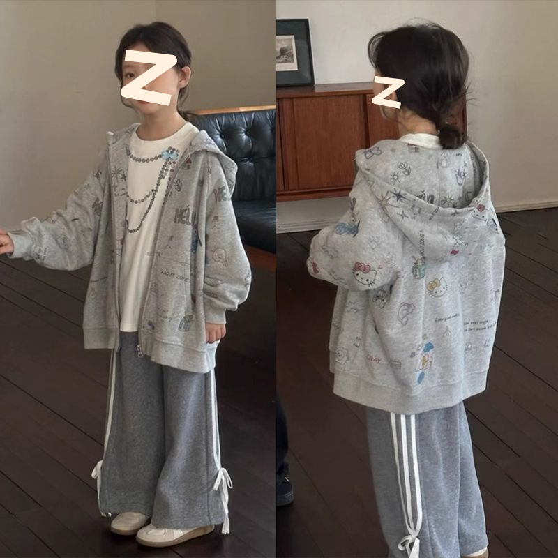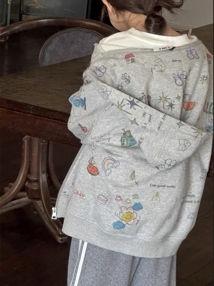 소녀 가을 후드 한국 스타일 코트 2024 새로운 스타일 유행 만화 지퍼 인쇄 탑 카디건스토어 가기