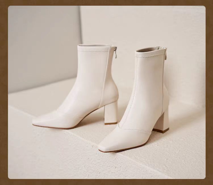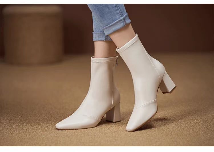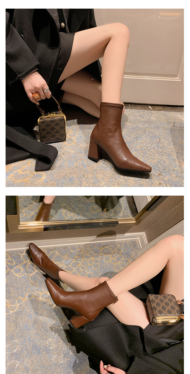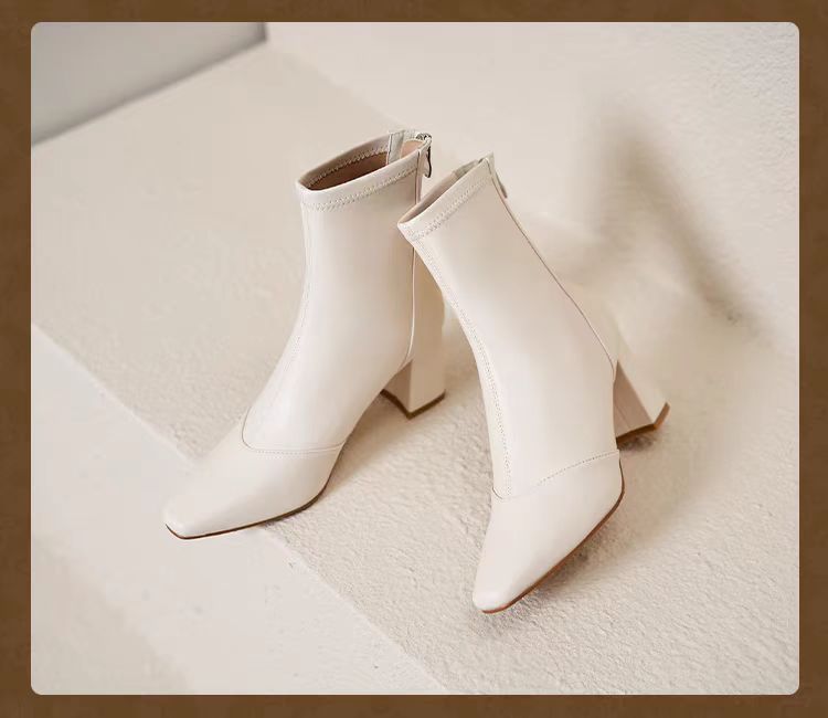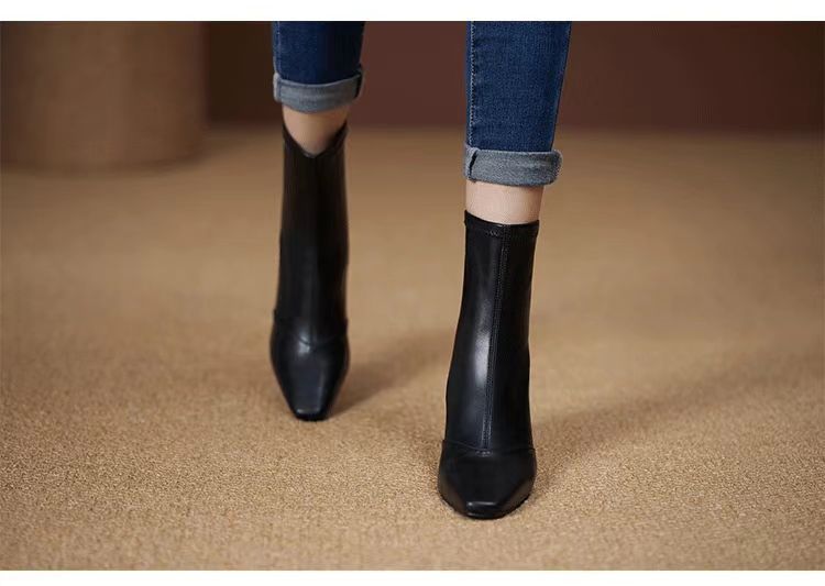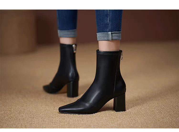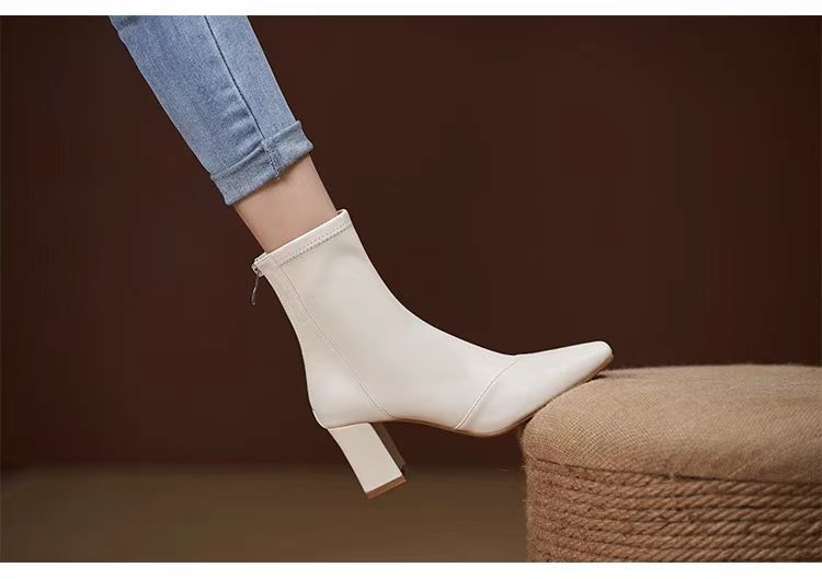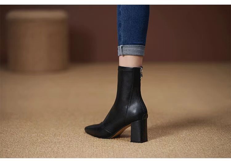 2024 봄과 가을 새로운 여성 부츠 프랑스 뾰족한 발목 부츠 여성용 하이힐 두꺼운 힐 소프트 가죽 리어 지퍼 기모 스키니 부츠스토어 가기